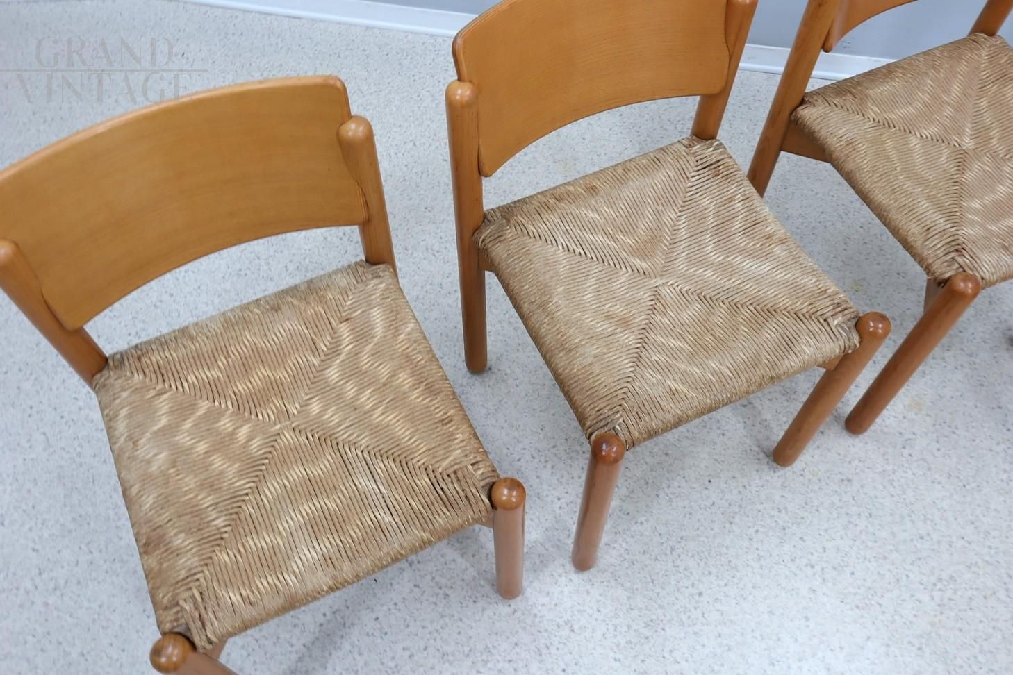 Set di 4 sedie da pranzo vintage in legno con seduta in paglia, anni '70