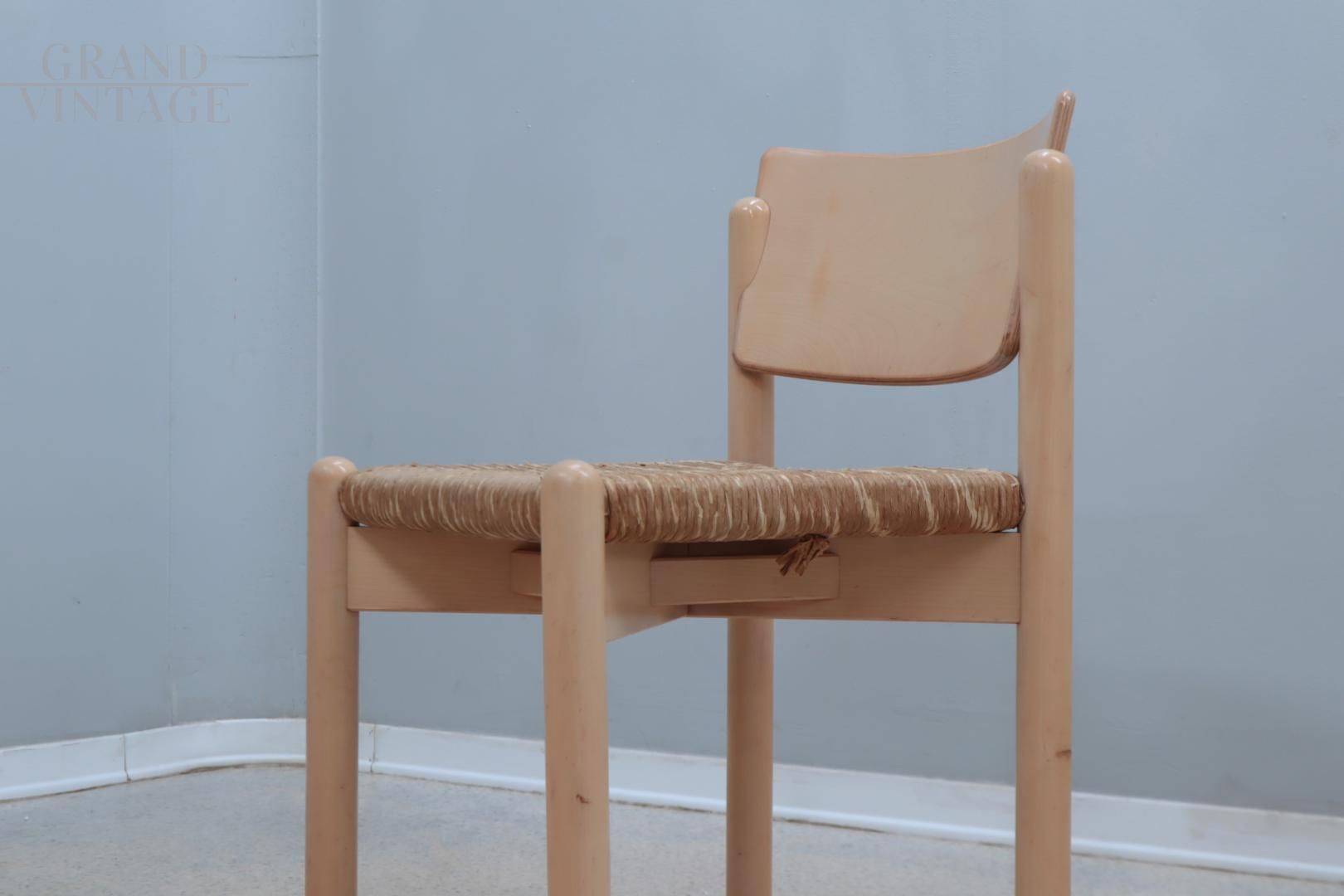 Set originale di 4 sedie da pranzo vintage, dal sapore rustico ma dalla linea raffinata, chiaramente ispirata ai disegni dell'architetto francese Charlotte Perriand e prodotta in Italia negli anni '70 su disegno attribuito a Roberto Pamio e Renato Toso. Le sedie sono realizzate in legno massello di rovere laccato con sedile in paglia intrecciata. Il set è in ottime condizioni vintage coerenti con l'uso e l'età. E' stato effettuato un restauro conservativo, le sedie sono quindi robuste e comode, adatte per l'utilizzo quotidiano, pronte per arredare la vostra casa, studio o ufficio!