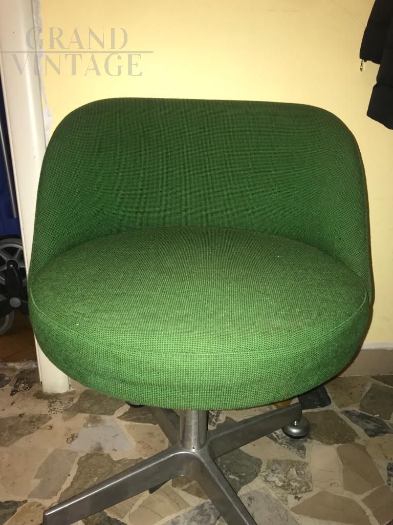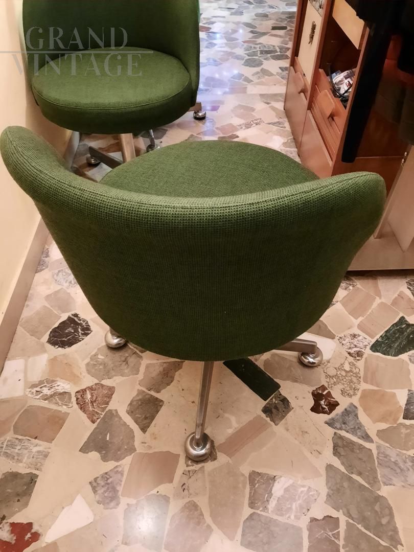 Set di 4 sedie da ufficio girevoli vintage in tessuto verde, con struttura cromata. Comode e imbottite, in ottime condizioni, presentano i naturali segni del tempo.