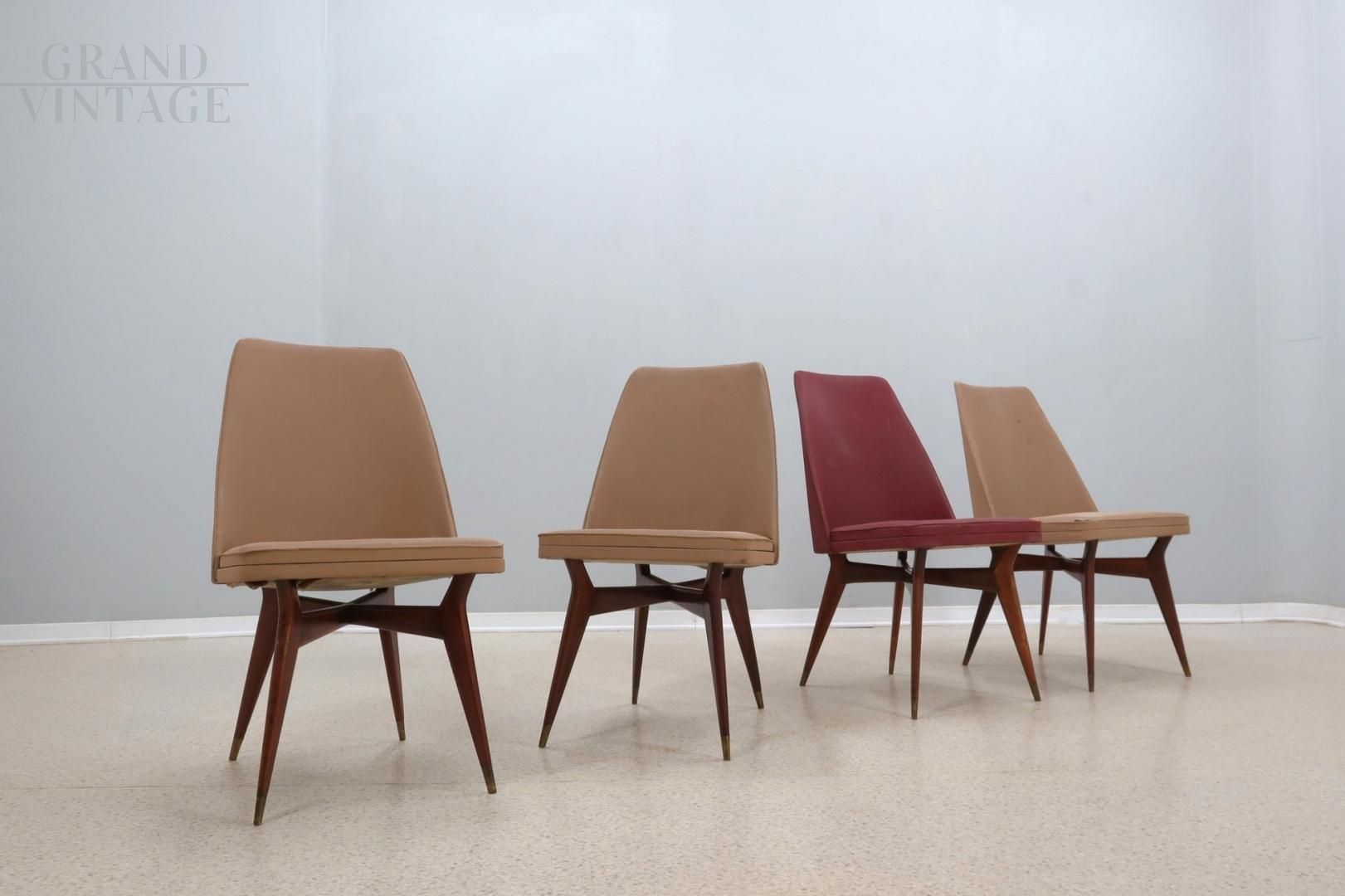 Raro set di 4 sedie in legno della metà del secolo con piedini in ottone e rivestimento originale in ecopelle. prod. Vittorio Bega Arredamenti Bologna, Italia, anni '50. Il set proviene da una casa privata ed è in ottime condizioni, la struttura in legno di mogano è stata restaurata. Le sedie devono essere imbottite. Questo simpatico set di sedie da collezione è pronto per arredare la vostra casa, il vostro studio o la vostra Galleria.
