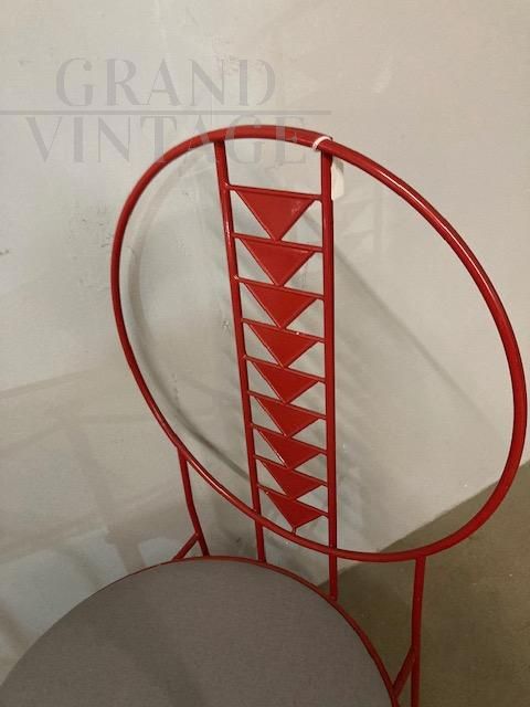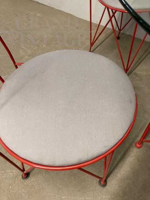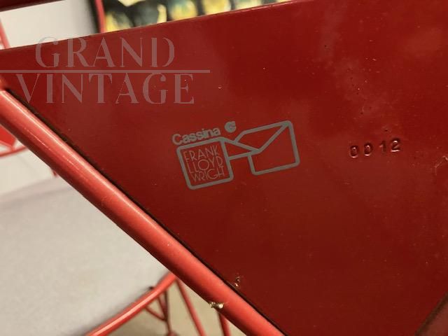 Set design di Frank Lloyd Wright per Cassina composto da un tavolo in metallo laccato rosso con piano in cristallo e 4 sedie in metallo laccato rosso, modernariato italiano anni '80 dal design unico. Gli oggetti si trovano in ottimo stato di conservazione e sono tutti pezzi originali firmati.