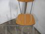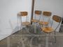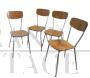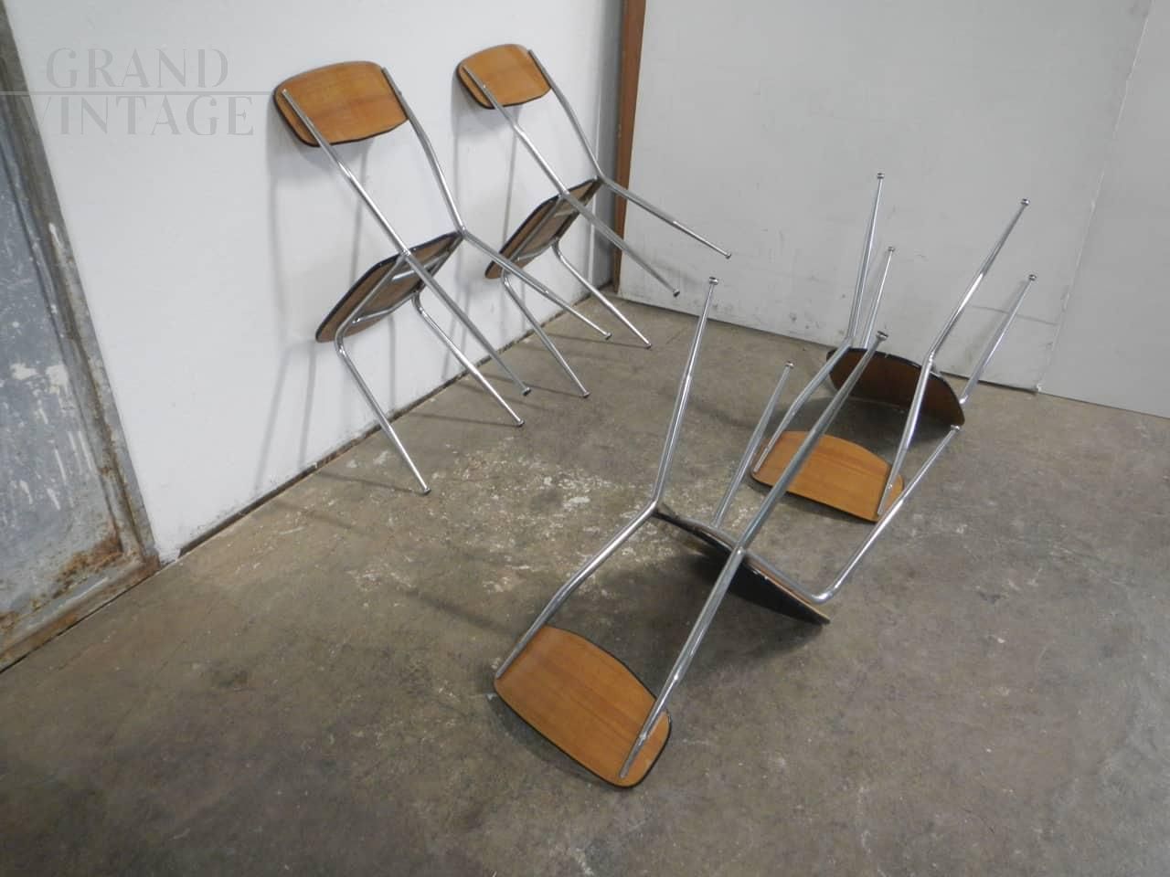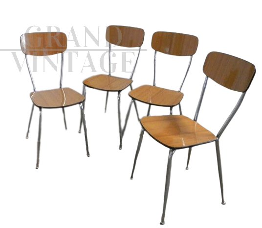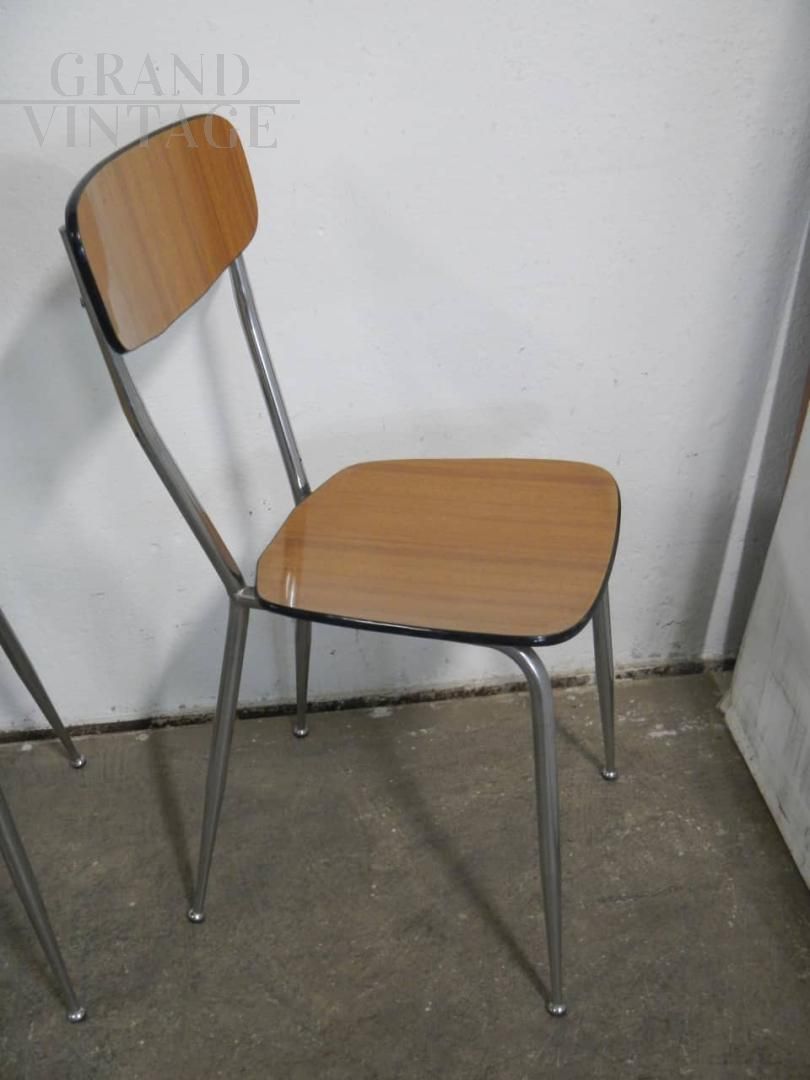 Set di 4 sedie da pranzo vintage in formica marrone con profili in plastica nera e struttura in metallo cromato. La seduta misura cm 45. In buone condizioni, con qualche naturale segno d’uso.