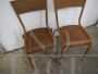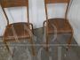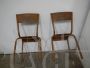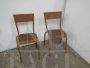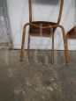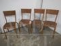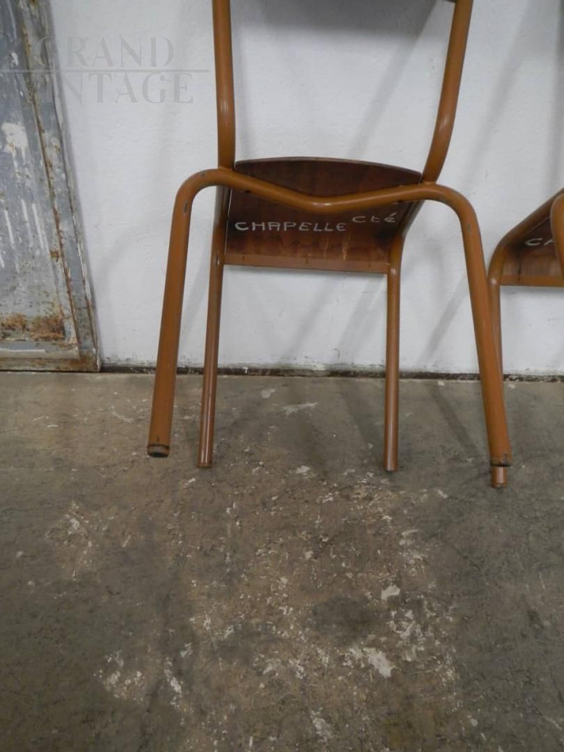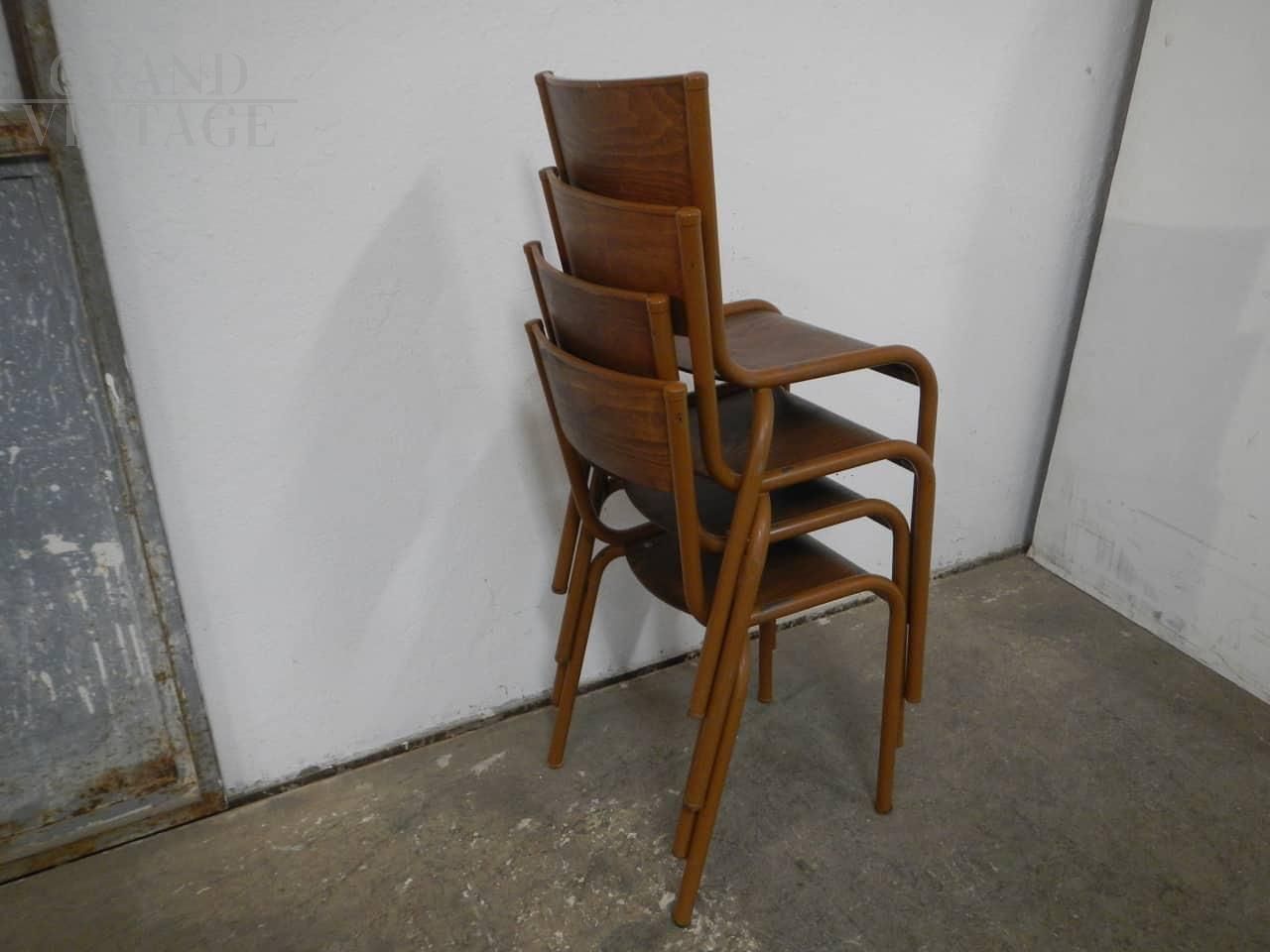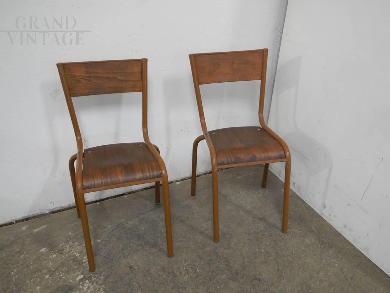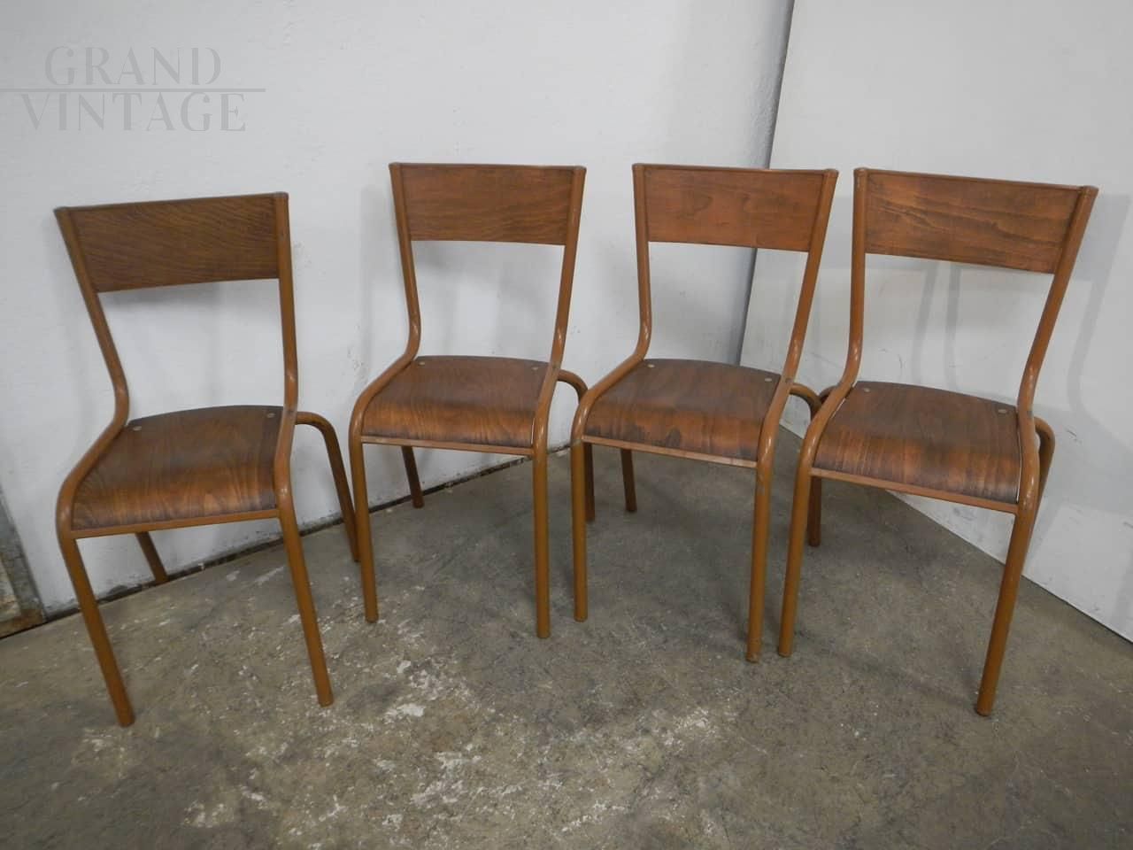 Set composto da 4 sedie impilabili prodotte da Mullca in Francia, anni '60, in ferro colorato marrone chiaro e seduta in listellare di legno scuro di betulla. Misure seduta cm 45x 45.