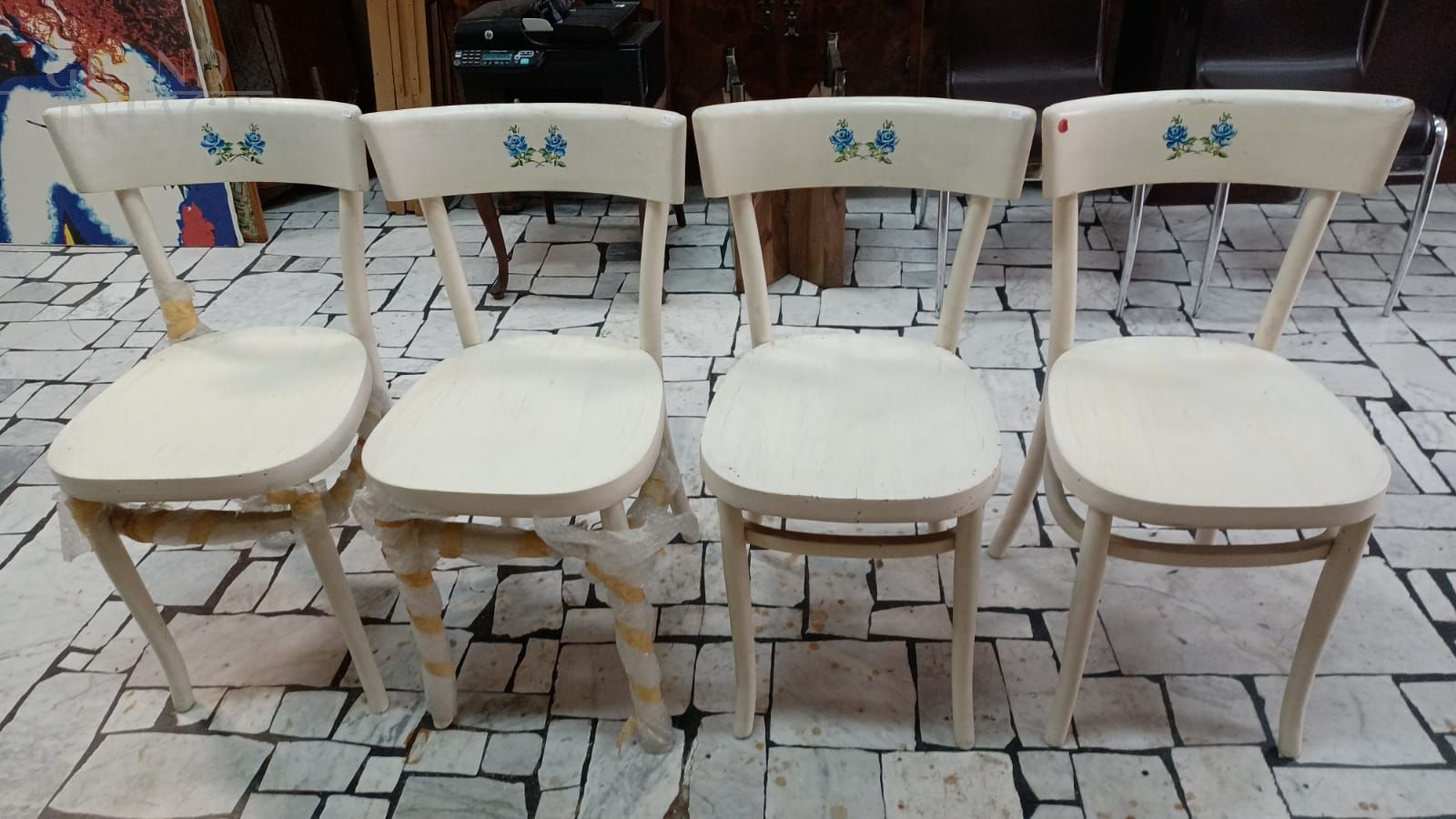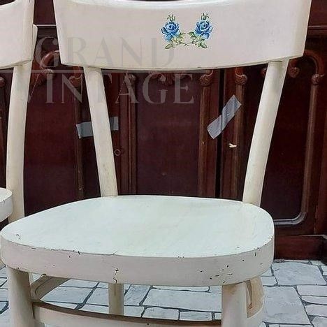 Set di 4 Sedie Sautto e Liberale, tutte con marchio originale, in faggio laccato bianco con disegni floreali blu sullo schienale.