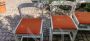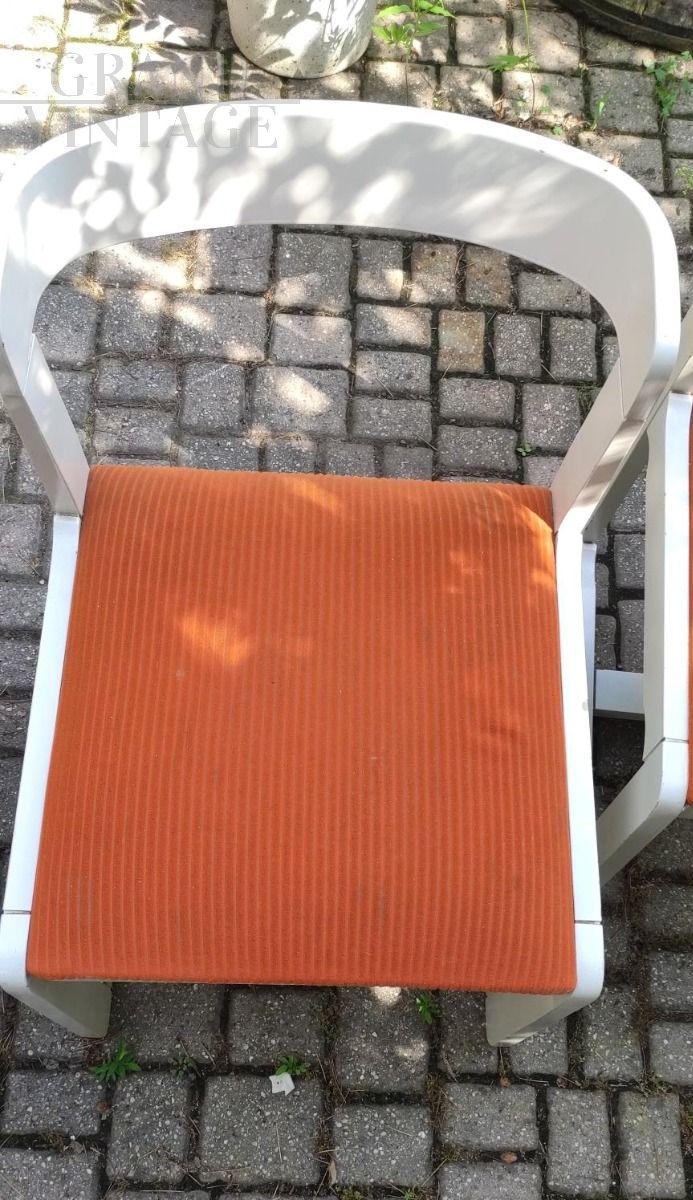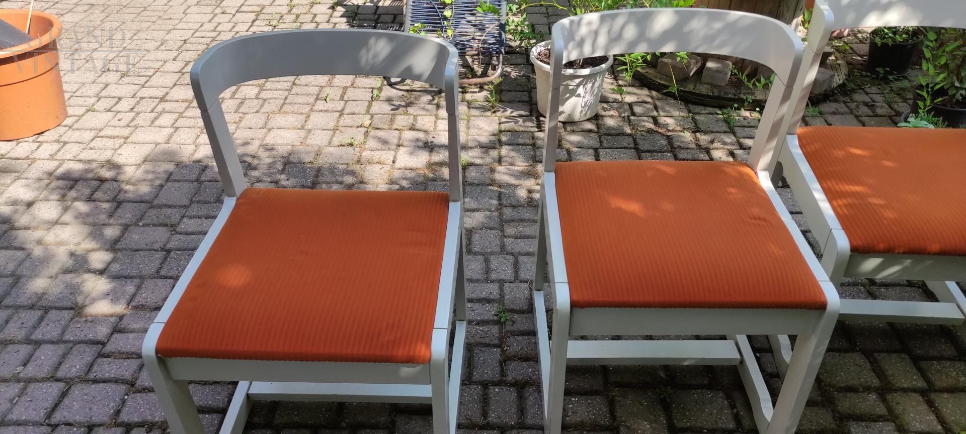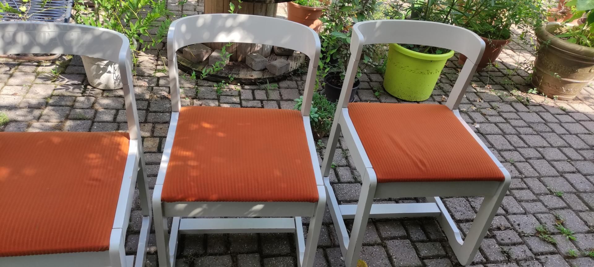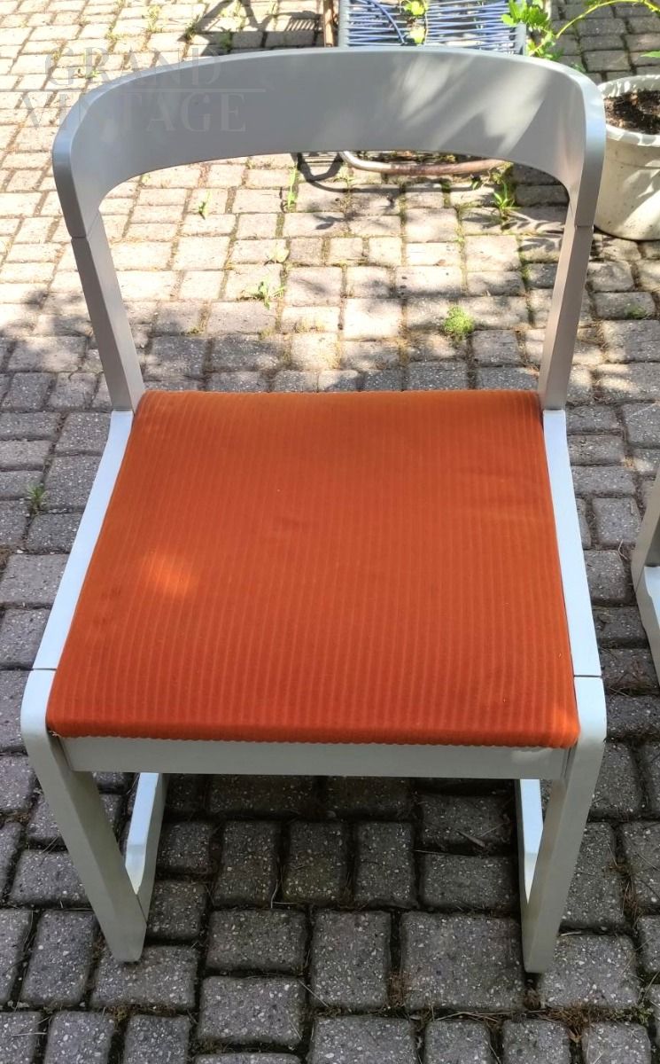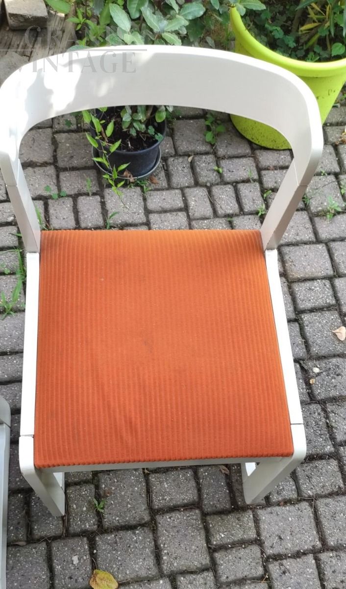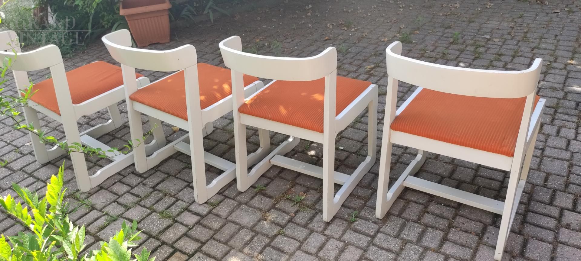 Set di 4 sedie stile Willy Rizzo per Mario Sabot in legno laccato bianco con seduta in velluto arancione, modernariato italiano. Le sedie sono rare in quanto hanno una struttura particolare simile ma non uguale al modello Willy Rizzo. Il rivestimento in velluto arancione è molto ben tenuto.