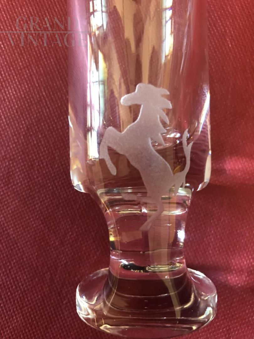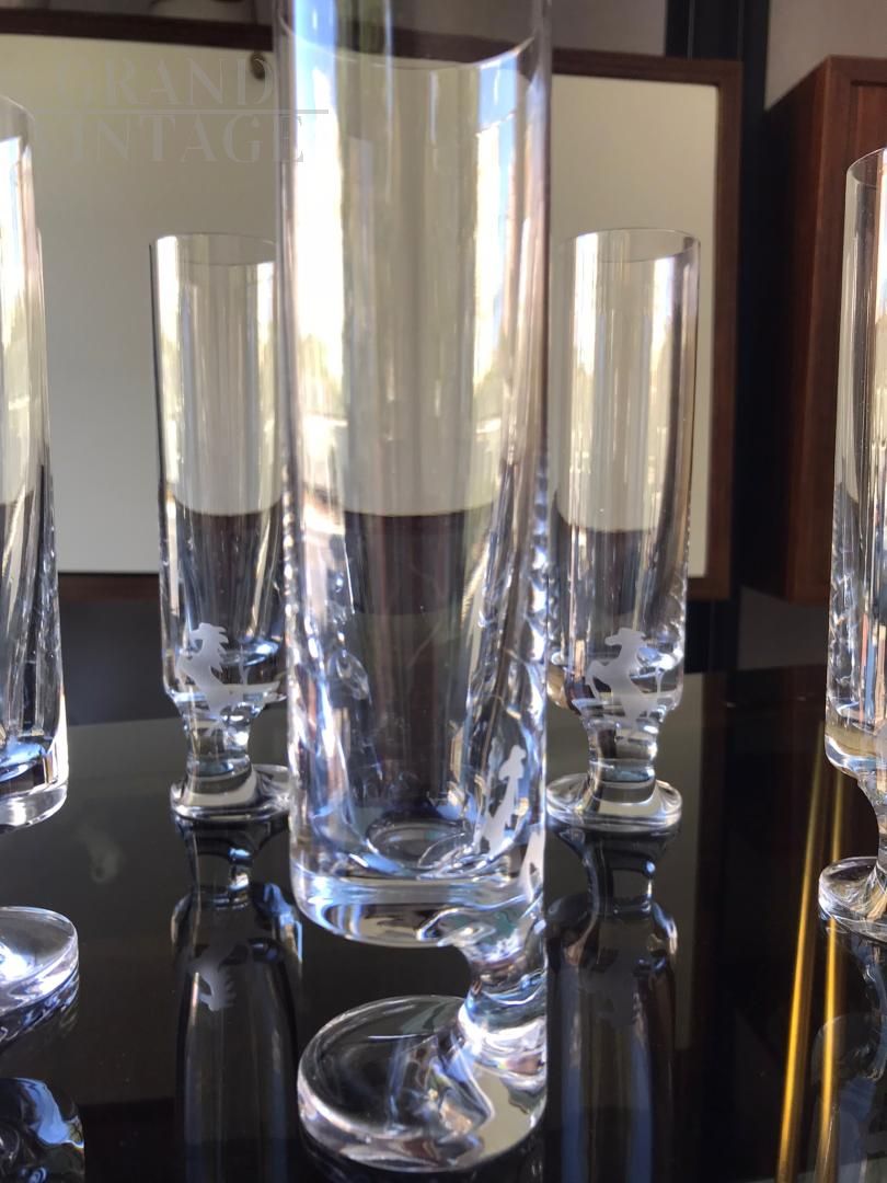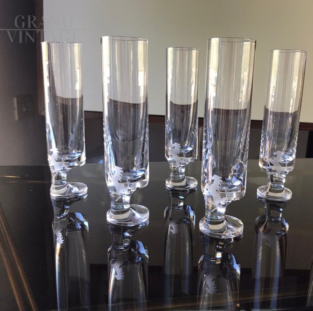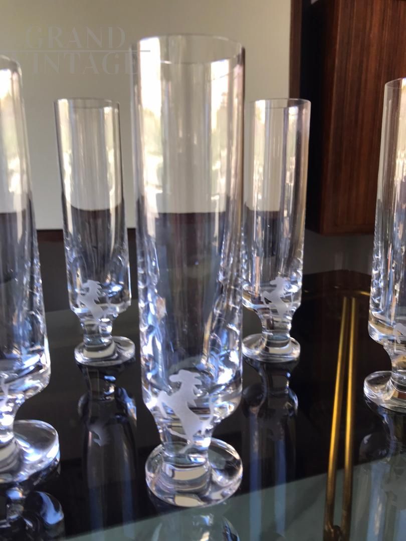 Gruppo di 5 bicchieri in cristallo anni '70 disegnati da Joe Colombo e da lui denominati modello Smoke -fumo- che permettevano di fumare e bere contemporaneamente per effetto del piede decentrato rispetto al flûte. Il logo del cavallino rampante della scuderia Ferrari venne inciso successivamente per omaggiare la migliore clientela della ditta in occasioni speciali.