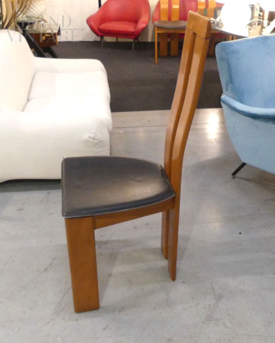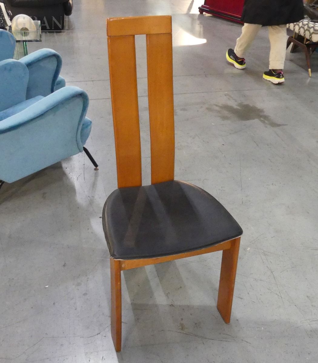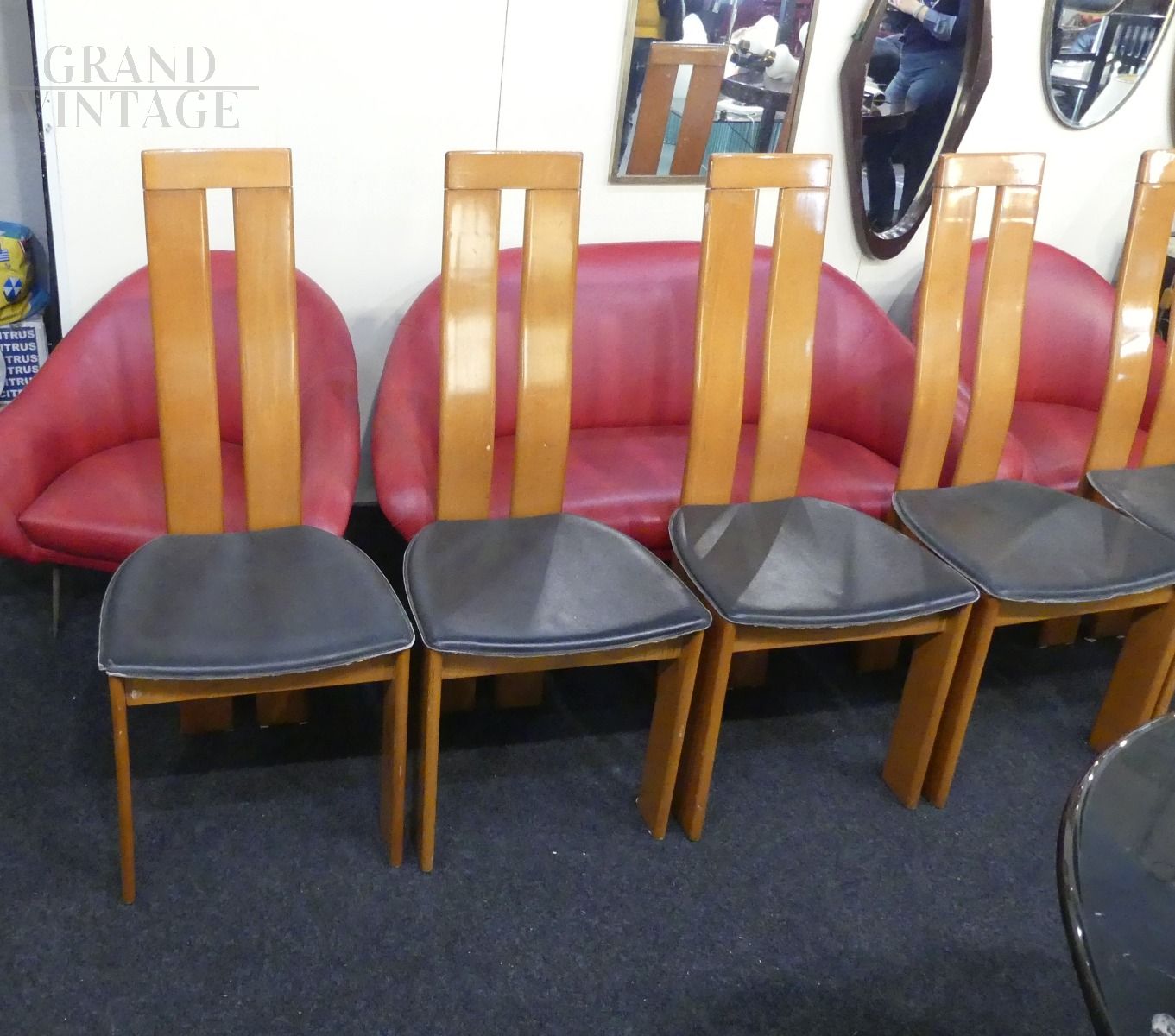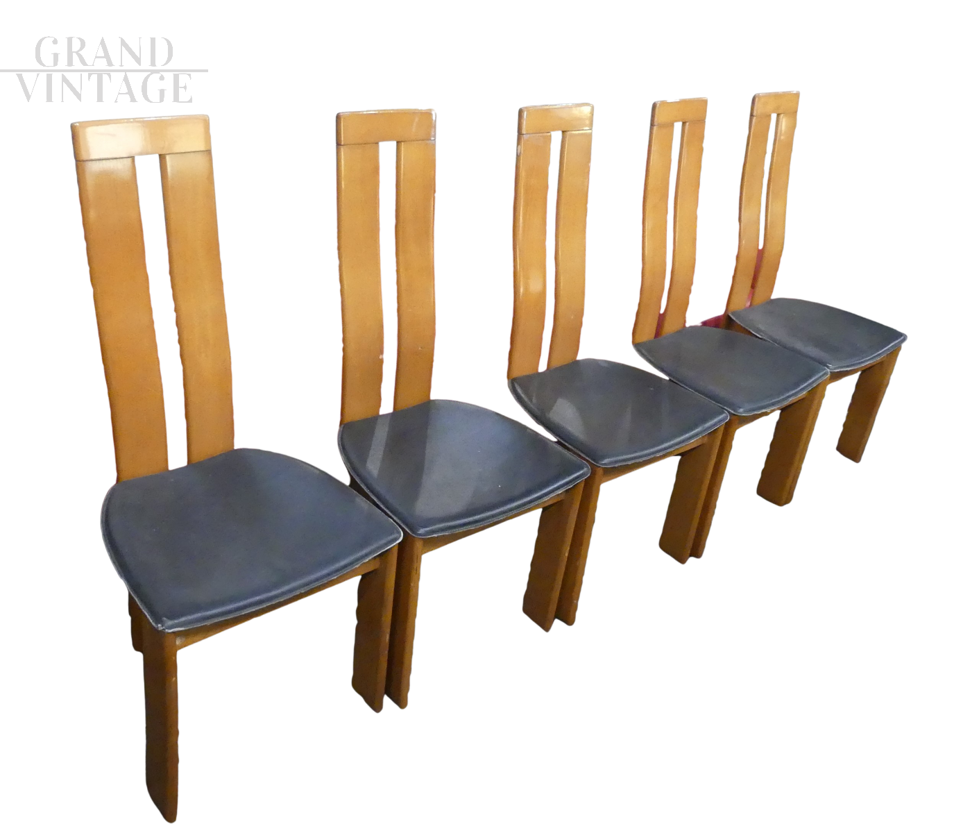 Set di 5 sedie design di Mario Marenco in legno color miele con schienale alto e con seduta in pelle marrone scuro. Presentano i naturali segni del tempo, come da foto.