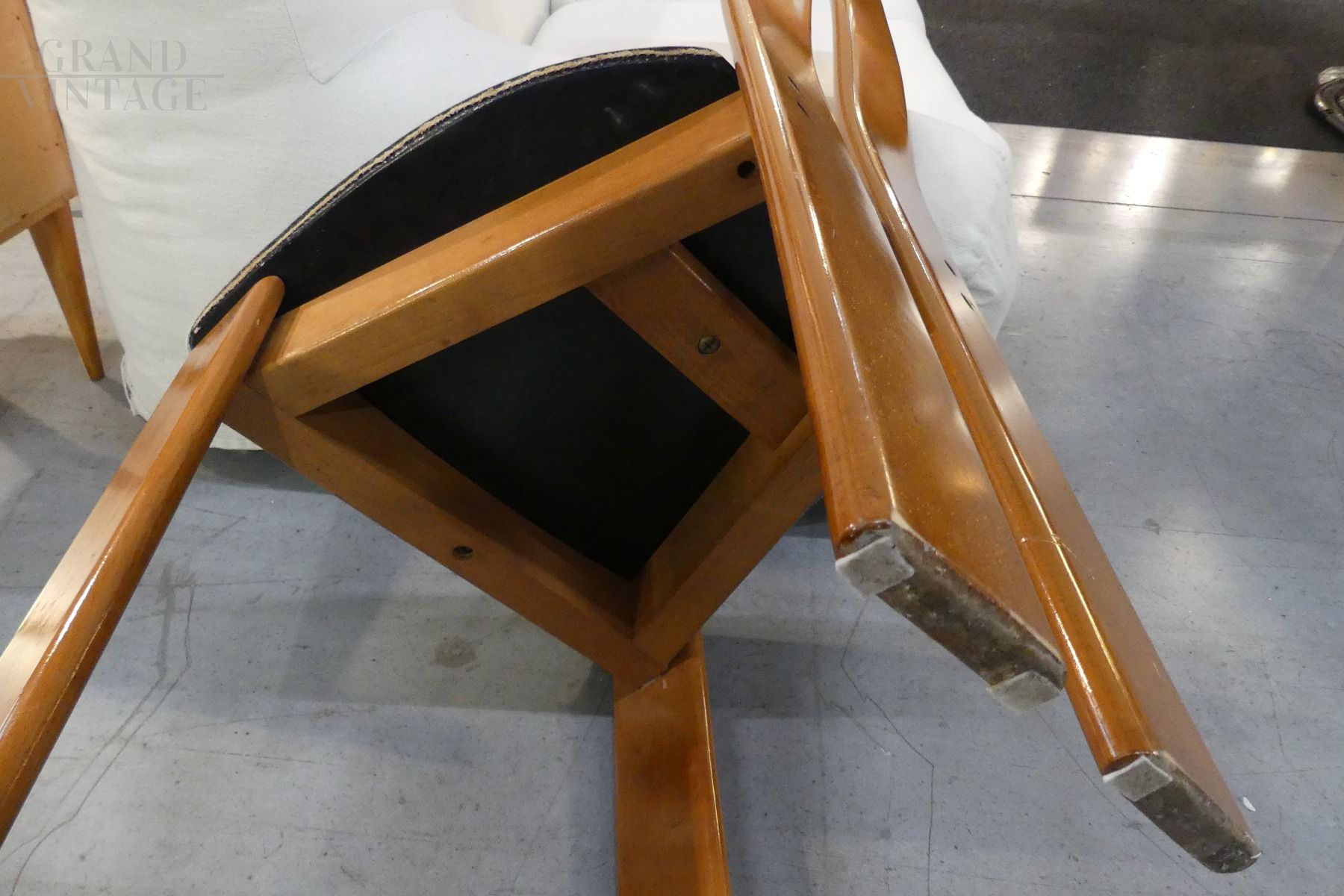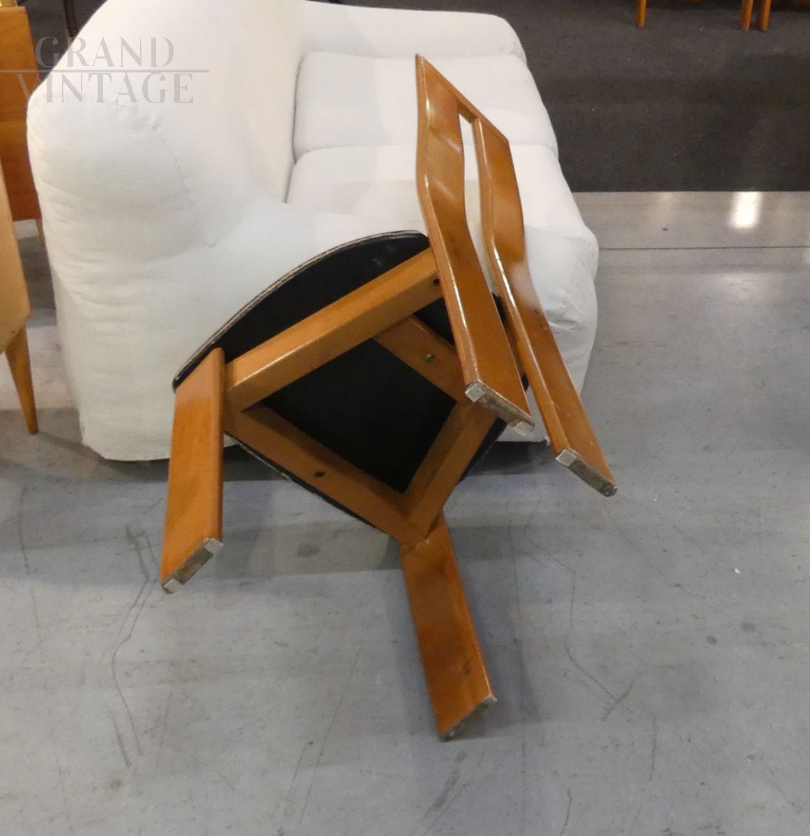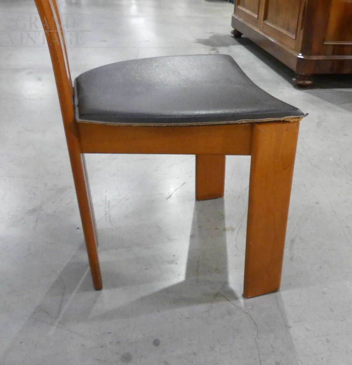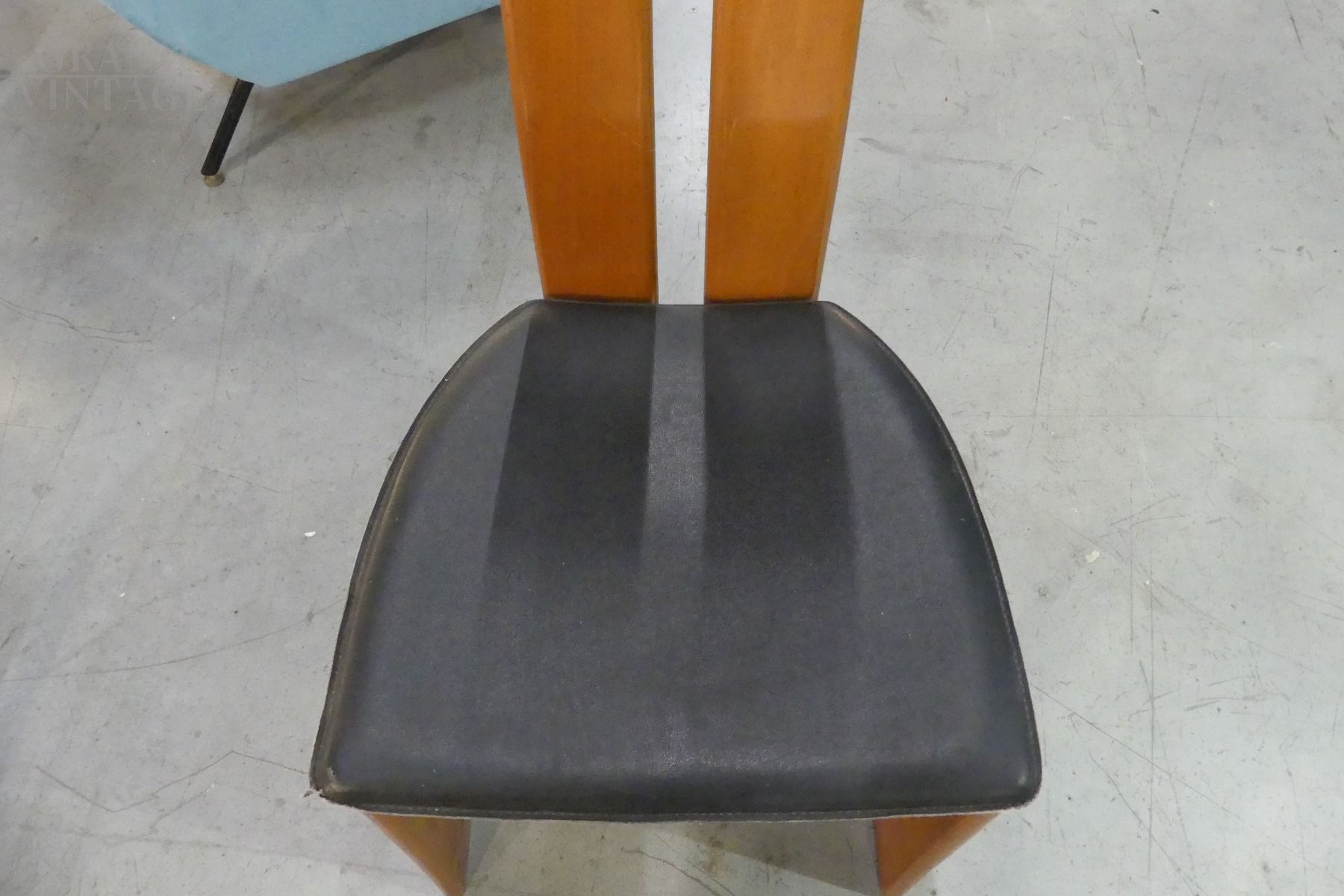 Set di 5 sedie design di Mario Marenco in legno color miele con schienale alto e con seduta in pelle marrone scuro. Presentano i naturali segni del tempo, come da foto.