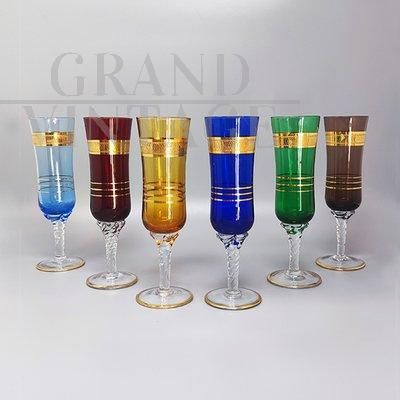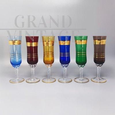 Stupefacente set di sei bicchieri in vetro di Murano di diversi colori con decorazioni dorate, realizzato in Italia negli anni '60. I bicchieri sono in ottime condizioni.