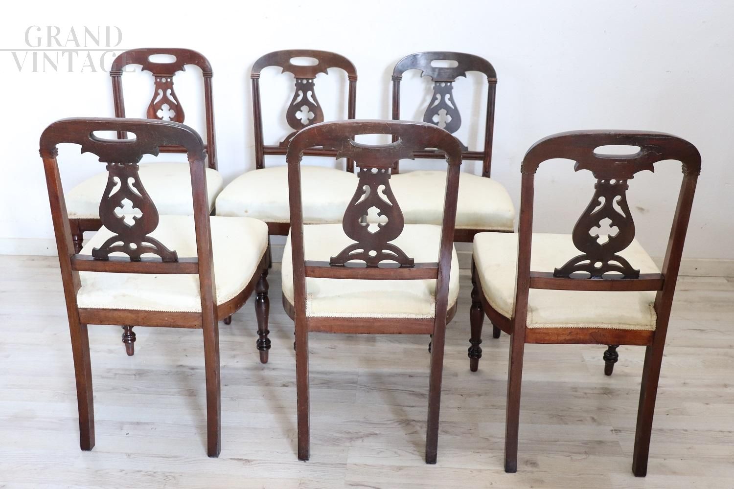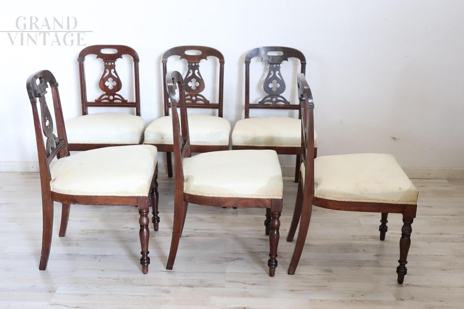 Set di 6 raffinate sedie antiche inglesi del XIX secolo in mogano massello con schienale decorato a intaglio in stile Queen Anne, le gambe sono molto eleganti in legno tornito e la seduta è imbottita, ampia e confortevole. le sedie sono in buone condizioni, con naturali segni di usura a livello di finitura del legno, si segnala il necessario restauro completo dell'imbottitura e la sostituzione tessuto. Ottimo prezzo trattabile.