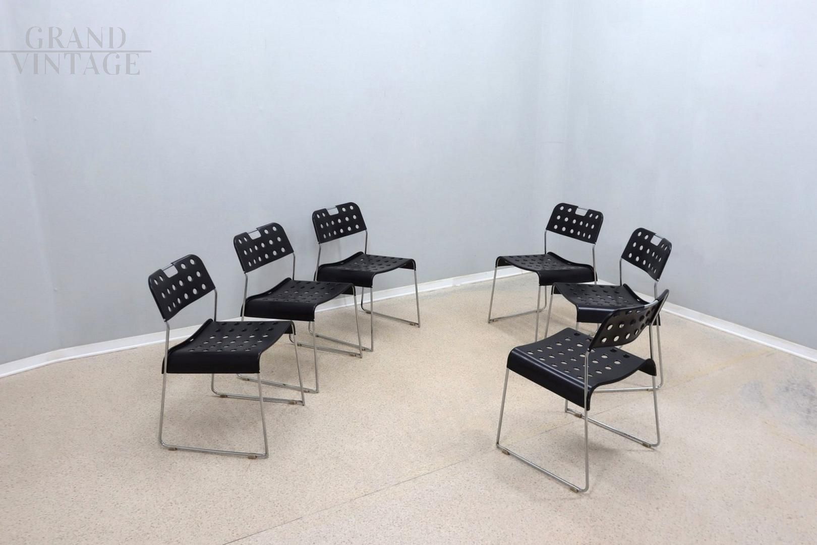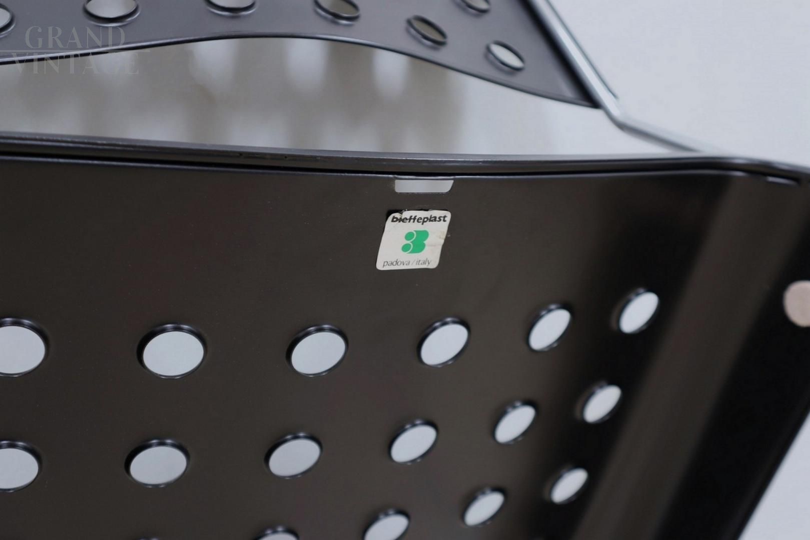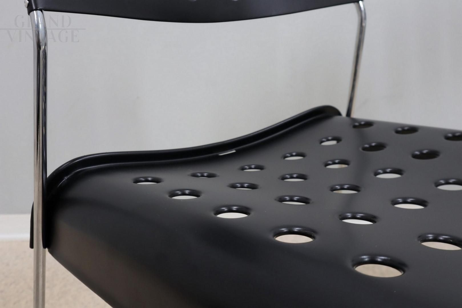 Questa sedia nera modello "Omstak" è stata progettata da Rodney Kinsman e prodotta in Italia da Bieffeplast nel 1972. Le sedie sono realizzate in ferro e acciaio e presentano seduta e schienale in metallo laccato nero con dettagli traforati. Tutte le parti laccate sono state restaurate quindi sono in perfette condizioni. La struttura in tubolare d'acciaio è stata pulita e lucidata, sono presenti alcuni piccoli segni di ossidazione dovuti all'uso e all'età. Il set rimane in ottime condizioni, tutte le sedie sono robuste e confortevoli. Sono impilabili ed etichettate dal produttore. Larghezza 50 cm, profondità 48 cm, altezza 75 cm, altezza seduta 46 cm.