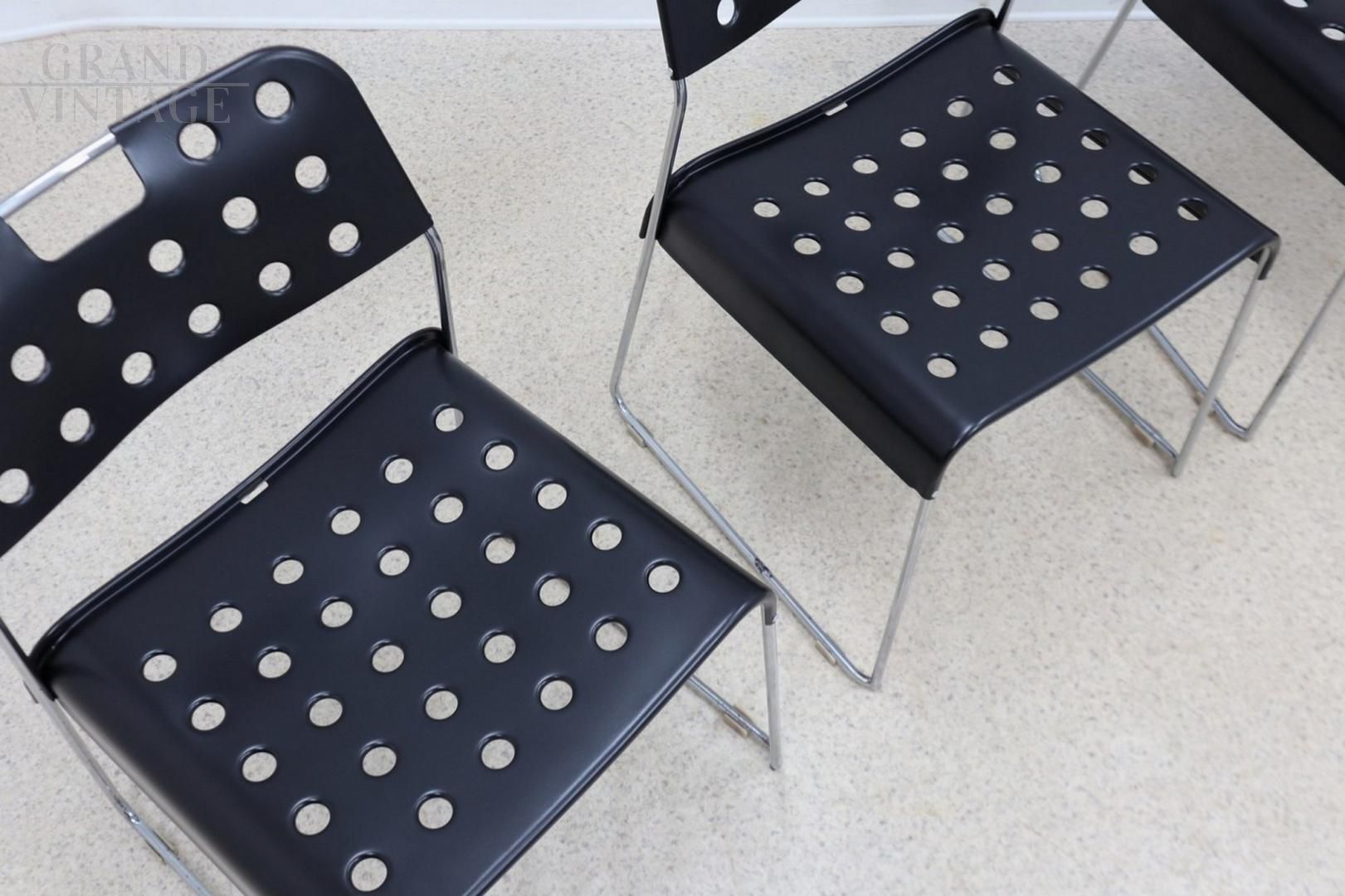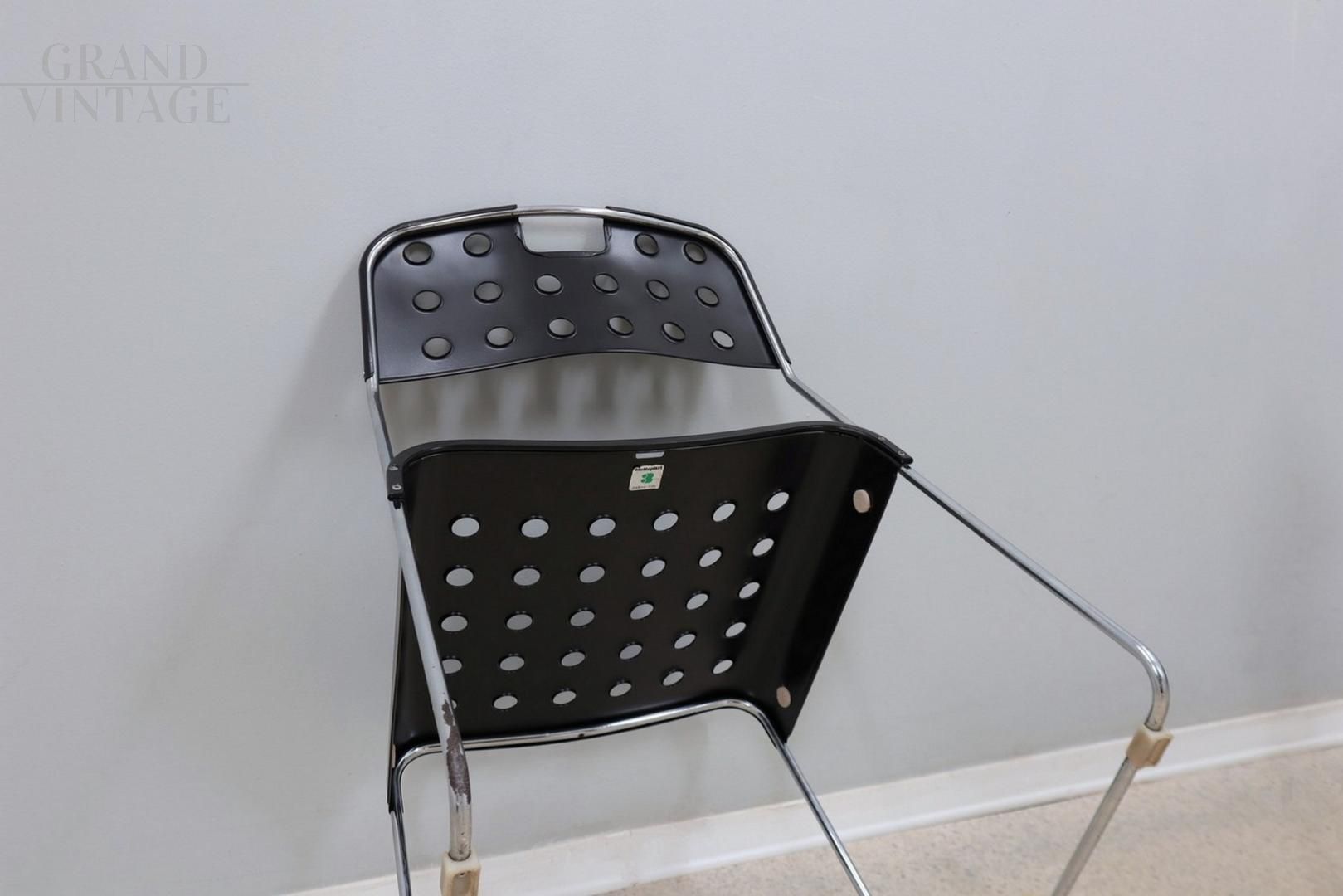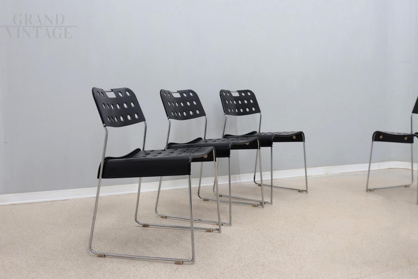 Questa sedia nera modello "Omstak" è stata progettata da Rodney Kinsman e prodotta in Italia da Bieffeplast nel 1972. Le sedie sono realizzate in ferro e acciaio e presentano seduta e schienale in metallo laccato nero con dettagli traforati. Tutte le parti laccate sono state restaurate quindi sono in perfette condizioni. La struttura in tubolare d'acciaio è stata pulita e lucidata, sono presenti alcuni piccoli segni di ossidazione dovuti all'uso e all'età. Il set rimane in ottime condizioni, tutte le sedie sono robuste e confortevoli. Sono impilabili ed etichettate dal produttore. Larghezza 50 cm, profondità 48 cm, altezza 75 cm, altezza seduta 46 cm.