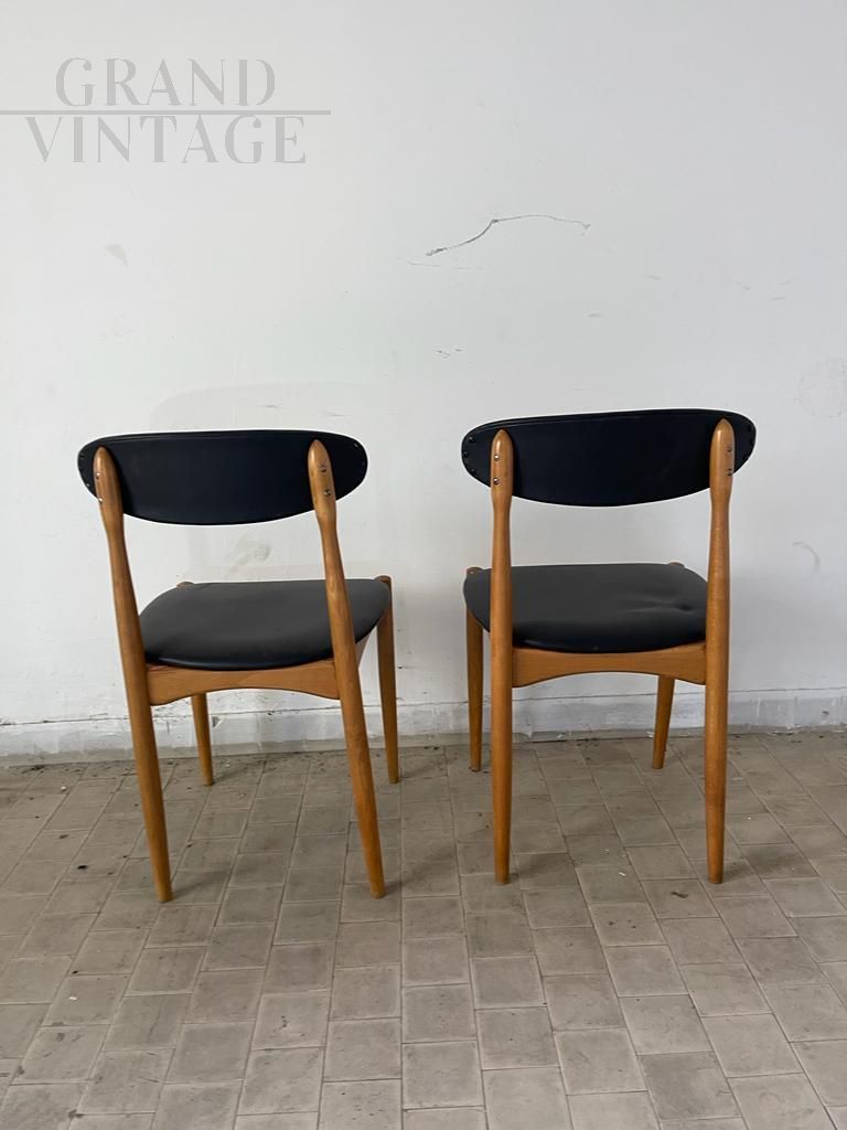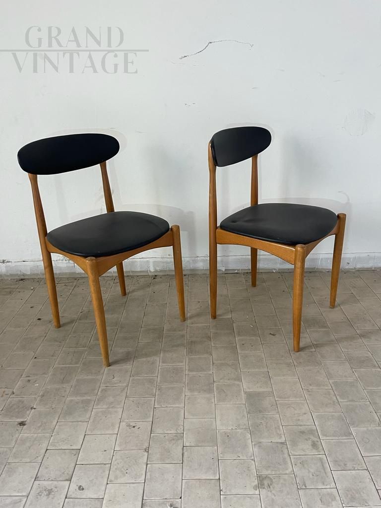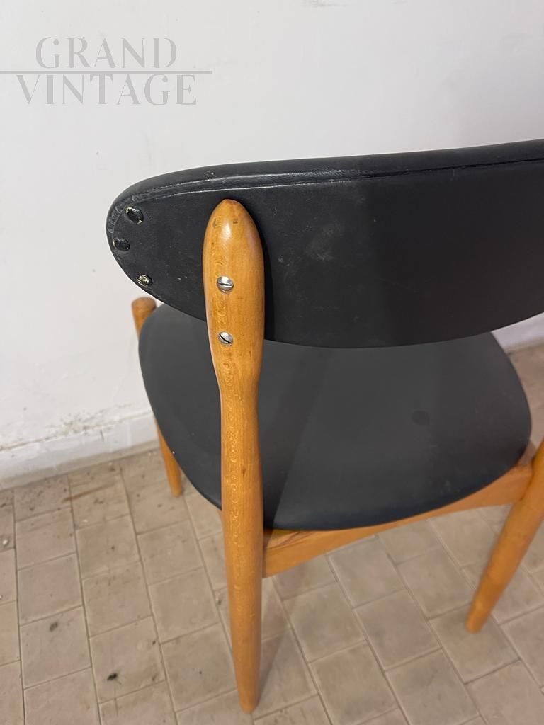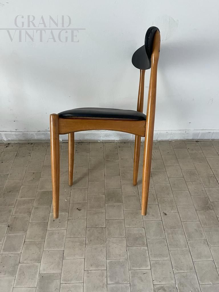Set composto da 6 sedie Unicorn disegnate dal maestro Pierre Guariche per Baumann, autentico pezzo da collezione anni ’60. Le sedie presentano una struttura in faggio massiccio dalla finitura calda e naturale, levigata con cura; Lo schienale è scolpito, dal profilo morbido e ricurvo, che aderisce dolcemente alla schiena; La seduta è imbottita e rivestita in pregiata similpelle nera, ben conservata e comoda, ideale anche per molte ore di uso. Le gambe affusolate con caratteristici piedini a compasso conferiscono leggerezza e robustezza allo stesso tempo.