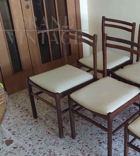 Set di sei sedie da soggiorno vintage anni '70 in legno scuro con seduta imbottita in eco pelle bianco - panna.