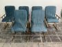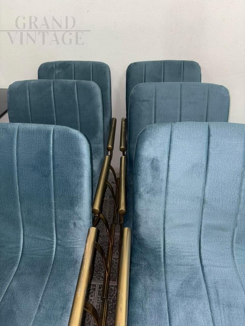 Bellissimo set di 6 sedie vintage in metallo dorato, imbottite e rivestite in velluto color blu petrolio, modernariato italiano anni '70.