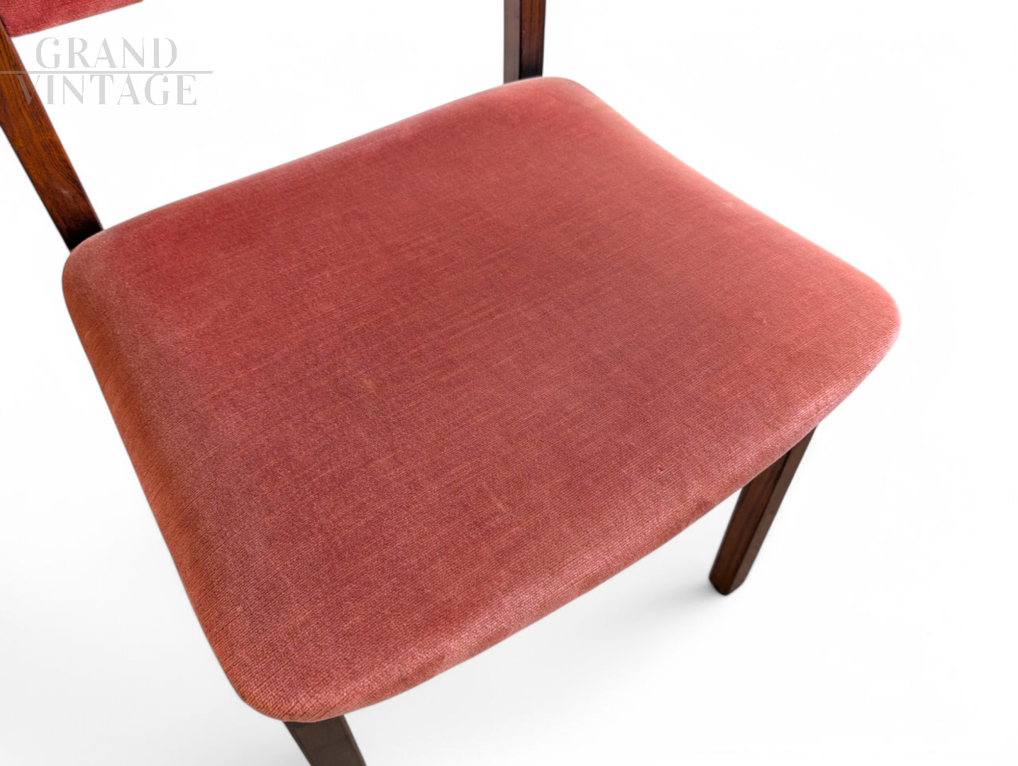 Set di 6 sedie anni '60 in legno mogano e velluto di produzione italiana. Queste sedie, raffinate ed in condizioni praticamente perfette, presentano una forma semplice ed elegante ma al contempo ricca nei suoi dettagli e nel colore rosso pompelmo. La seduta è comoda e la struttura solida. Sono il completamento ideale di una stanza in stile midcentury o contemporaneo. Dimensioni 80 x 48 x 46 cm (altezza, larghezza, profondità)