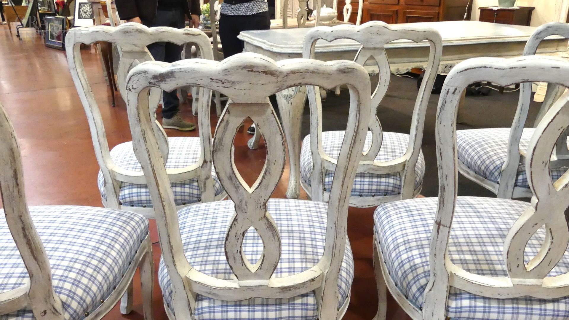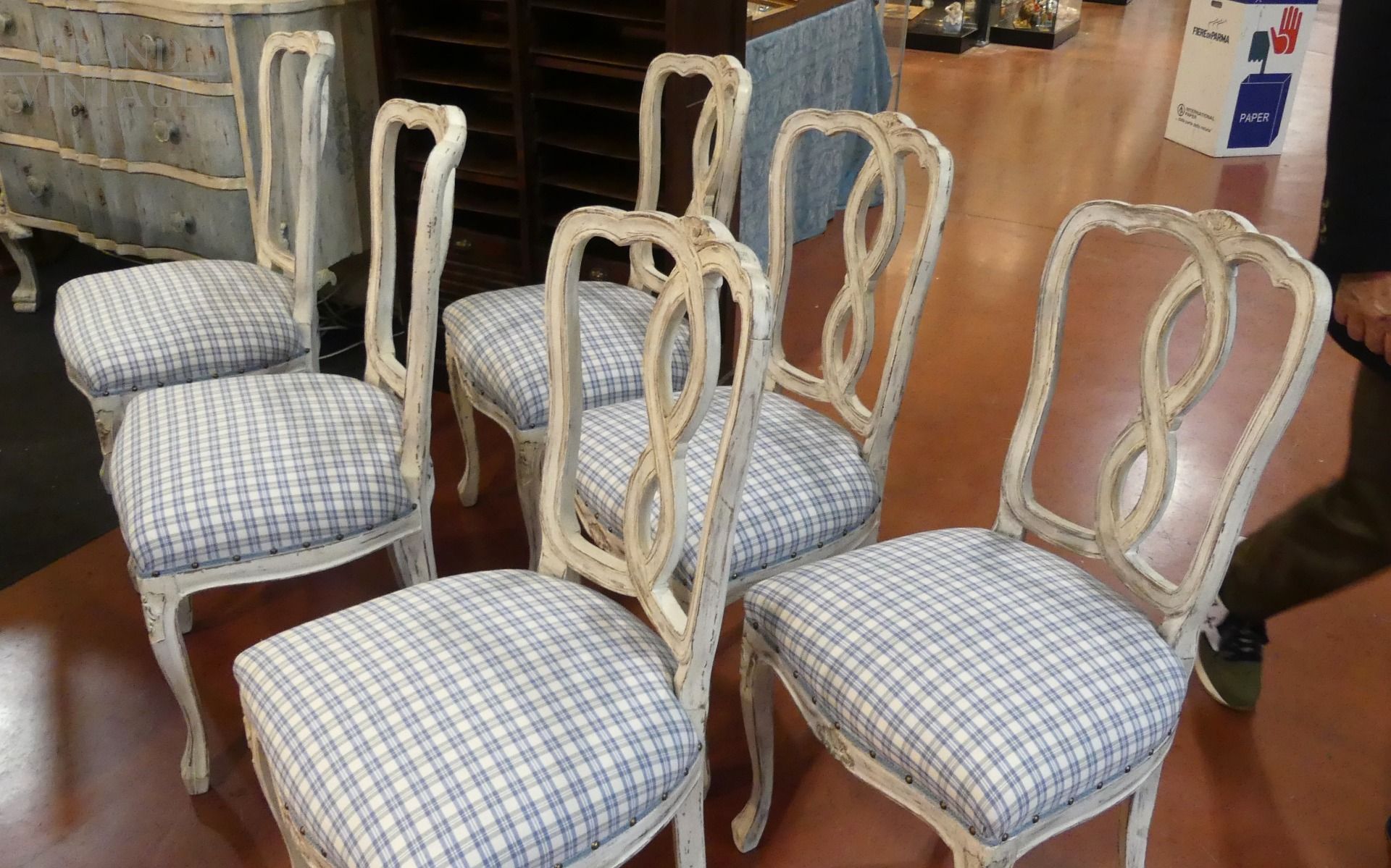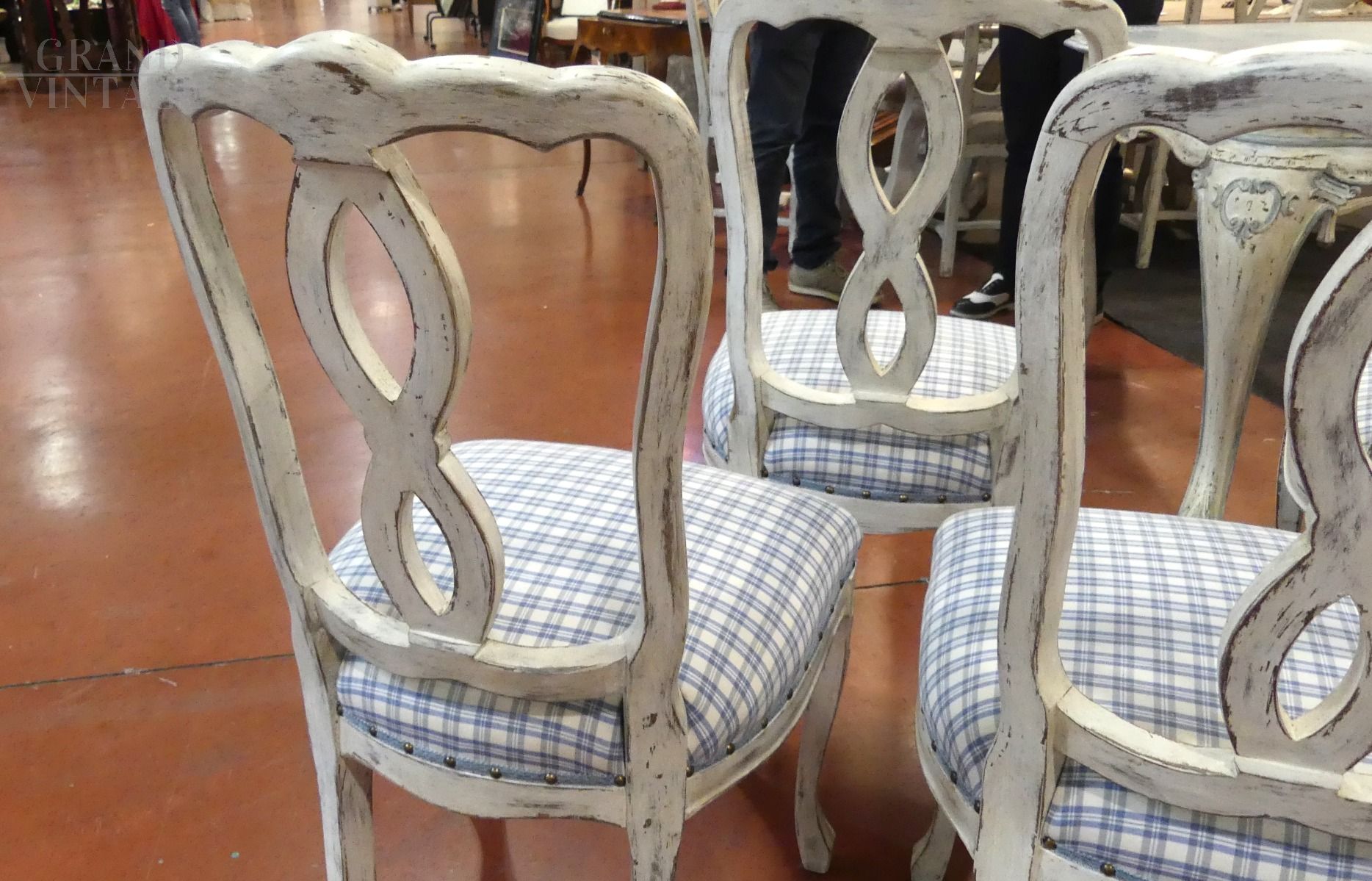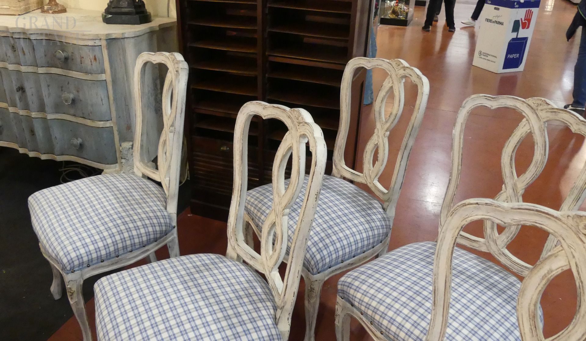 Set di 6 sedie vintage shabby chic, anni '50 / '60, con struttura in legno di noce decapato, con molle, imbottitura e rivestimento in tessuto rifatti a nuovo. Restaurate e ritoccate, in ottime condizioni.
