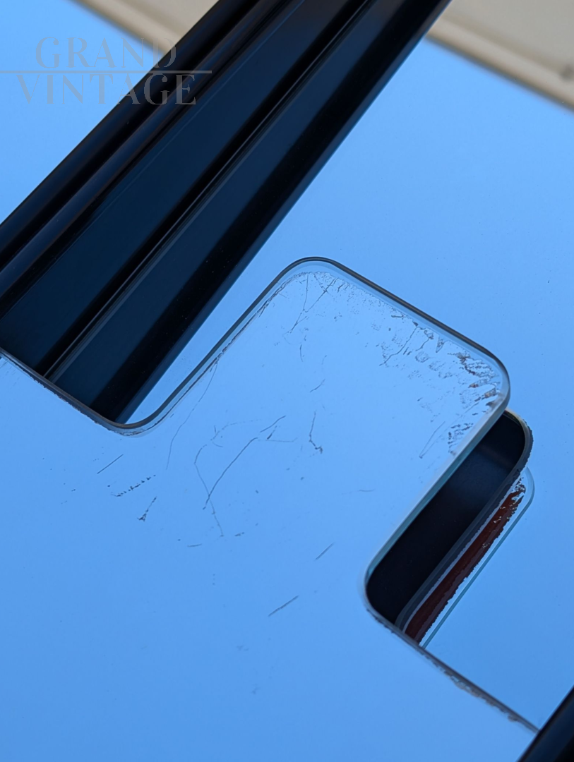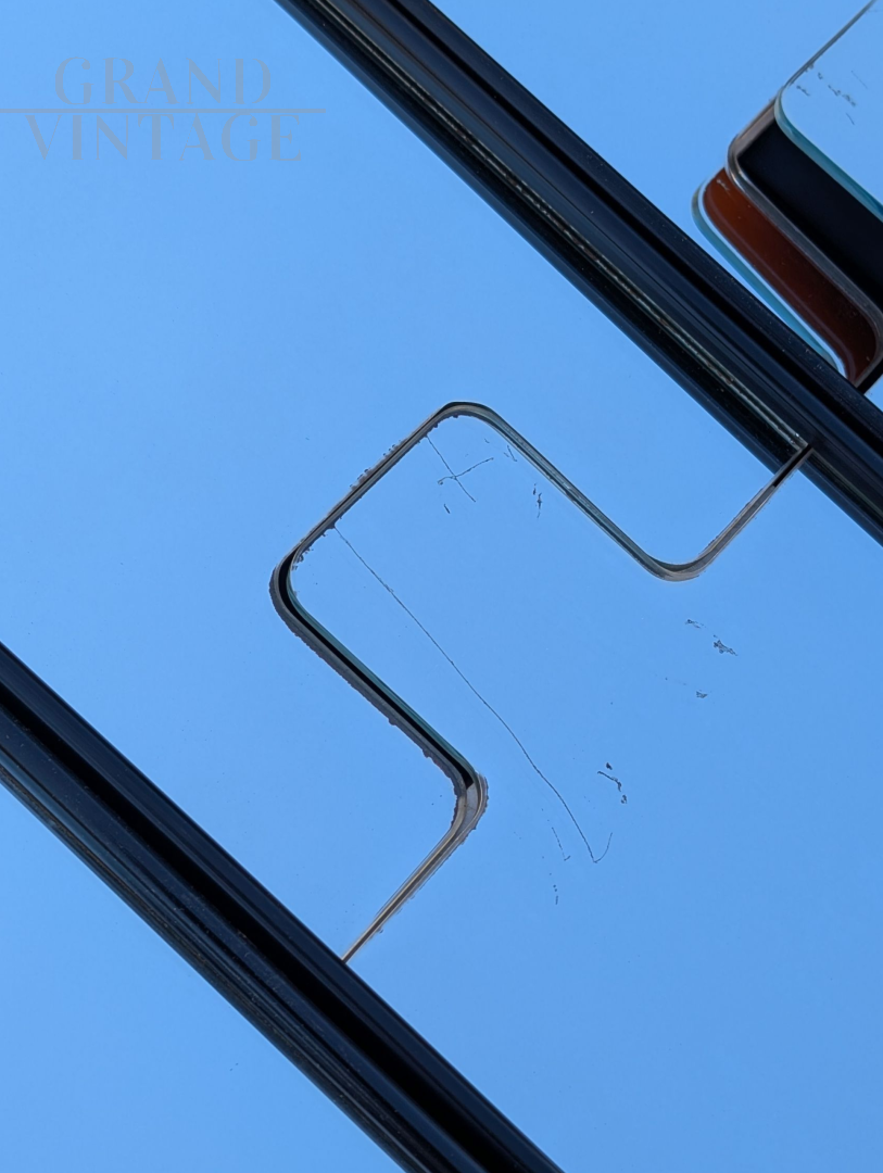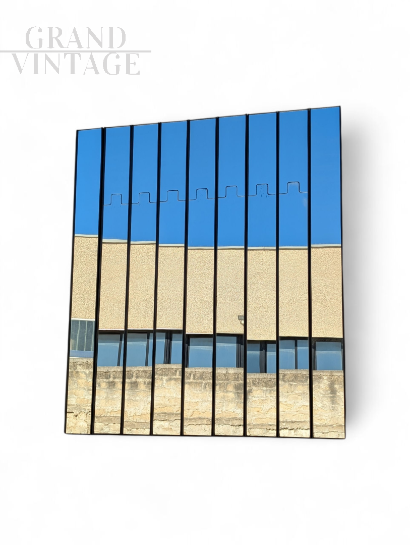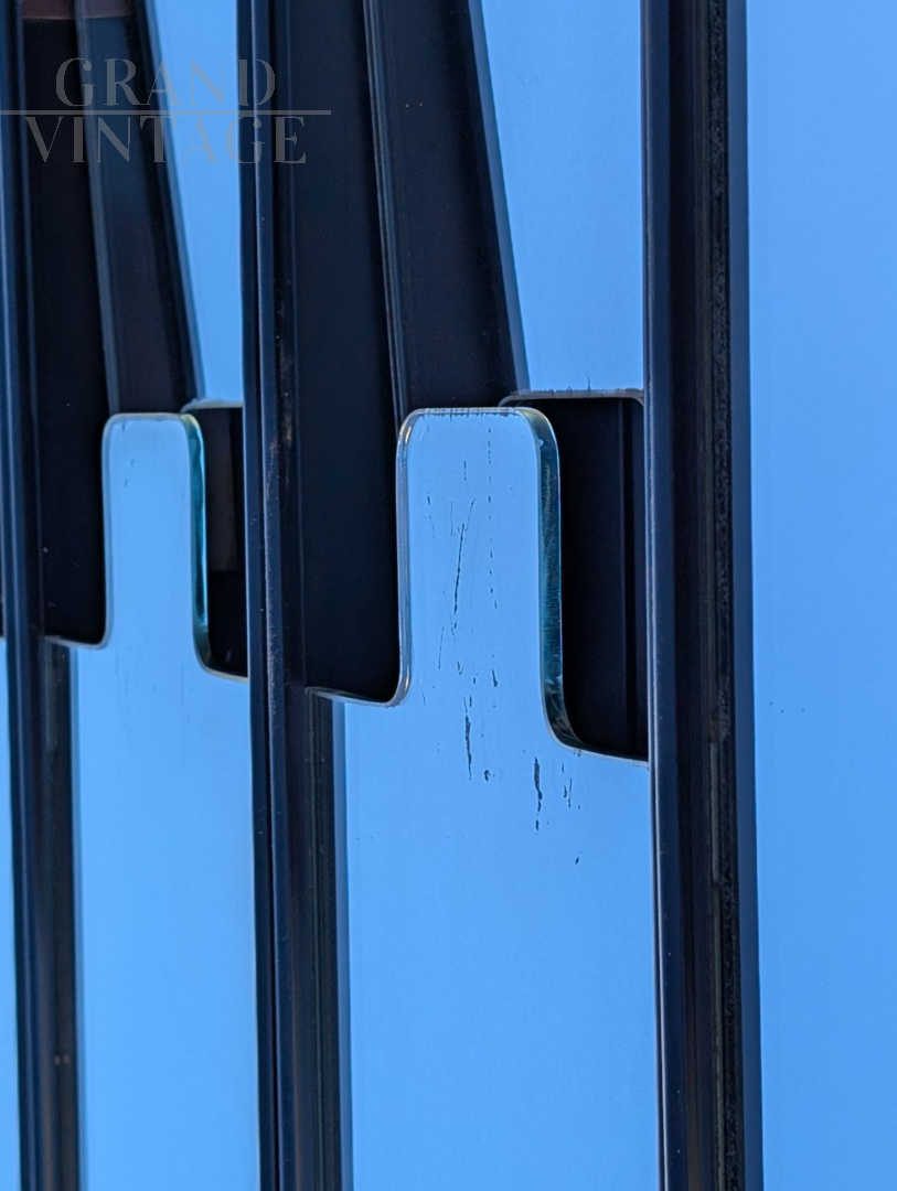 Questo set di 9 specchi appendiabiti Gronda attribuibile a Luciano Bertoncini è l'aggiunta perfetta per chi cerca un pezzo di design che unisca funzionalità e stile. Ogni specchio, di forma rettangolare e sottile, è un'opera d'arte a sé stante, con un design a pannelli verticali che crea un effetto visivo moderno e pulito. Realizzati con vetro specchiato di alta qualità, riflettono l'ambiente circostante in modo affascinante, catturando il cielo azzurro e l'architettura circostante in un gioco di riflessi. I pannelli specchiati presentano leggere imperfezioni e segni del tempo, come piccoli graffi e sbeccature, che aggiungono un carattere autentico e raccontano la storia di questi pezzi.