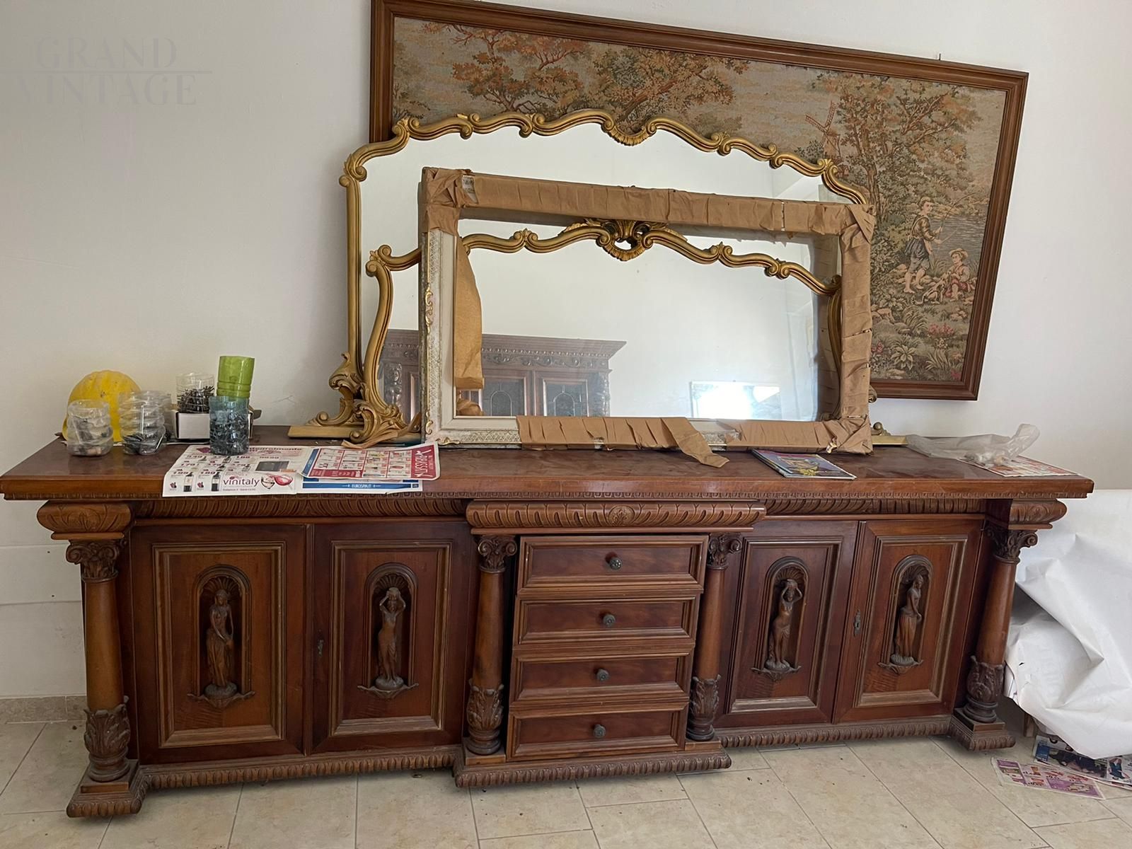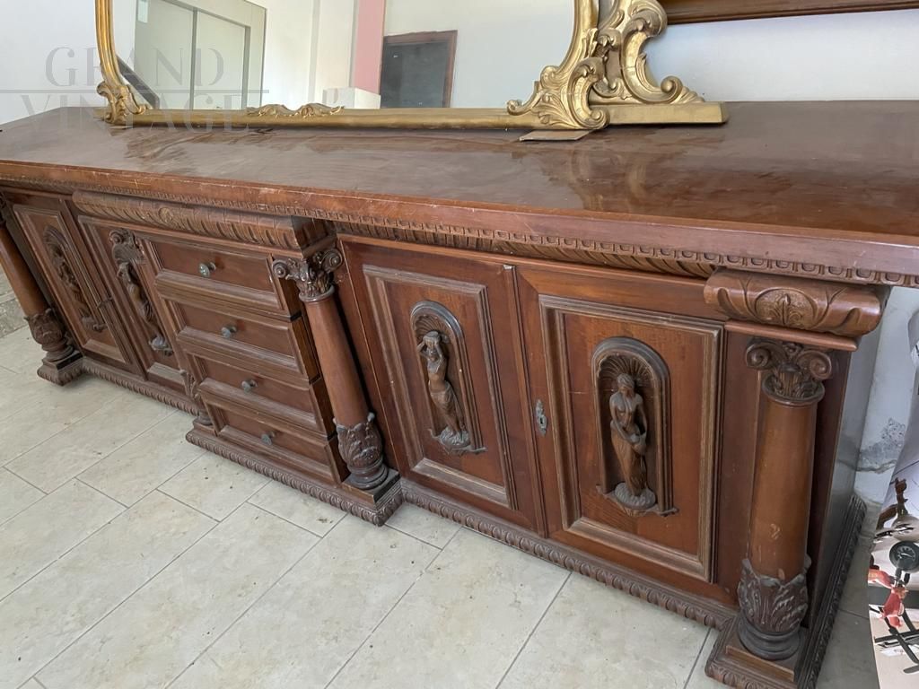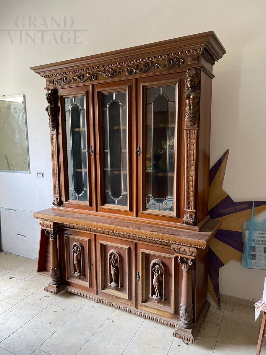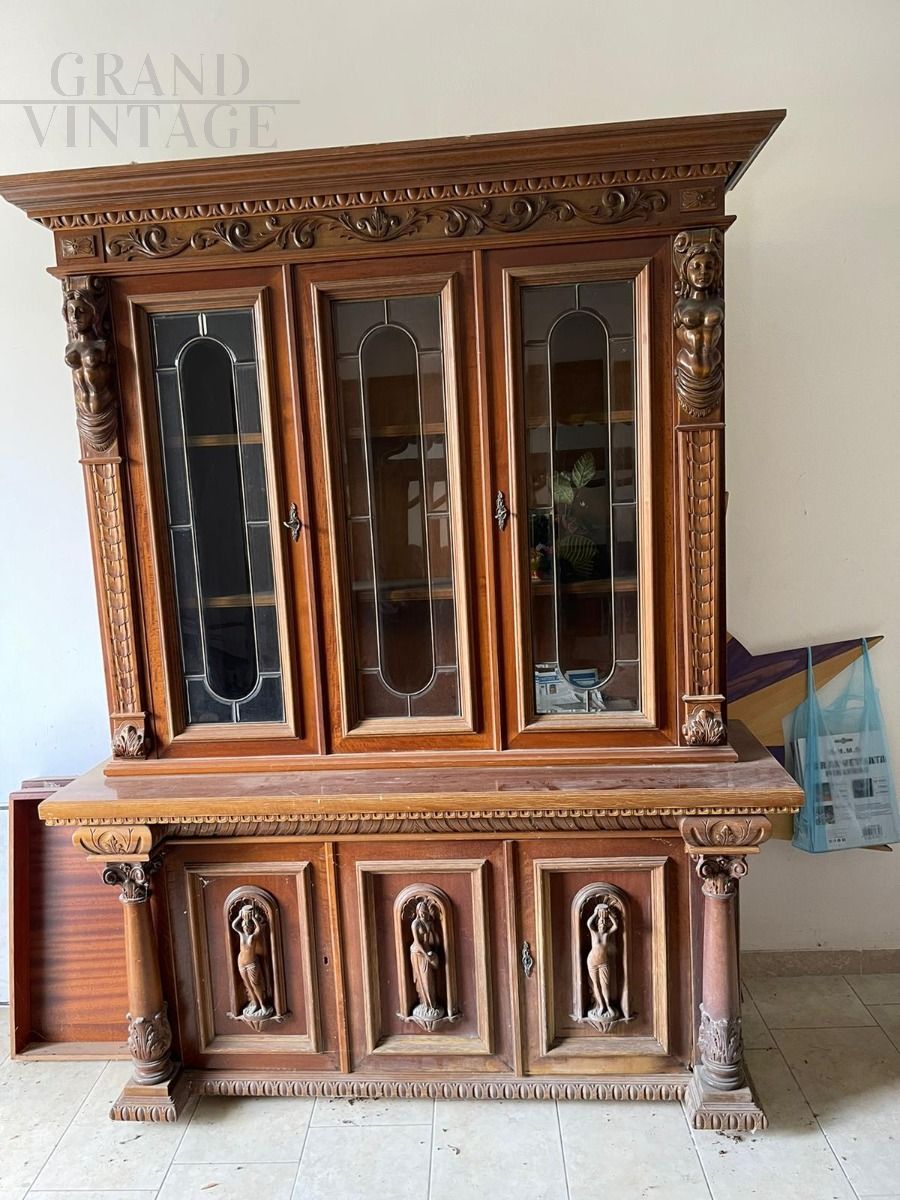 Set da salotto vintage composto da una credenza con altzata a vetrina e buffet, tutto riccamente intagliato con statue di ancelle e motivi floreali.
