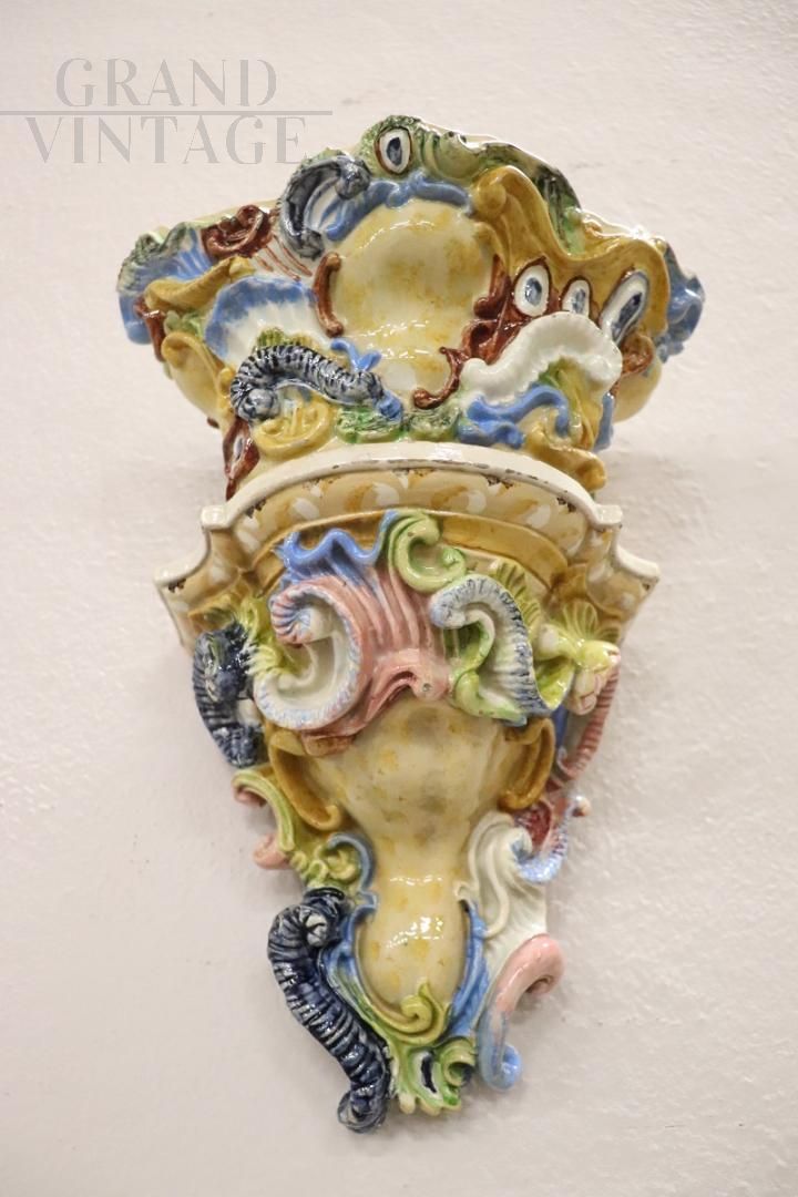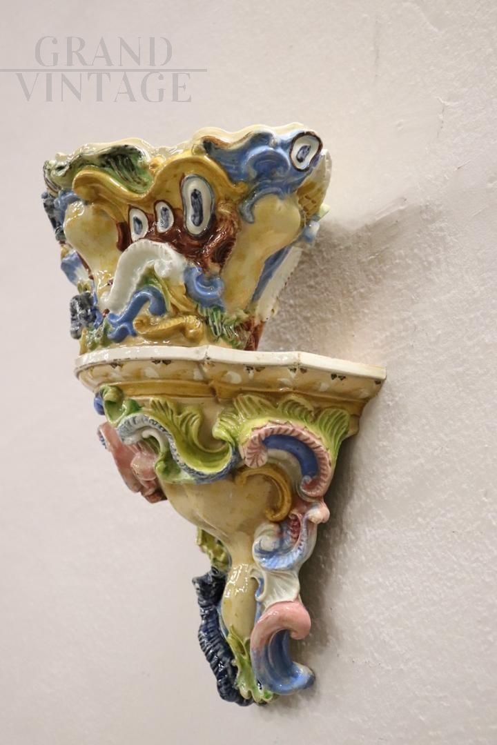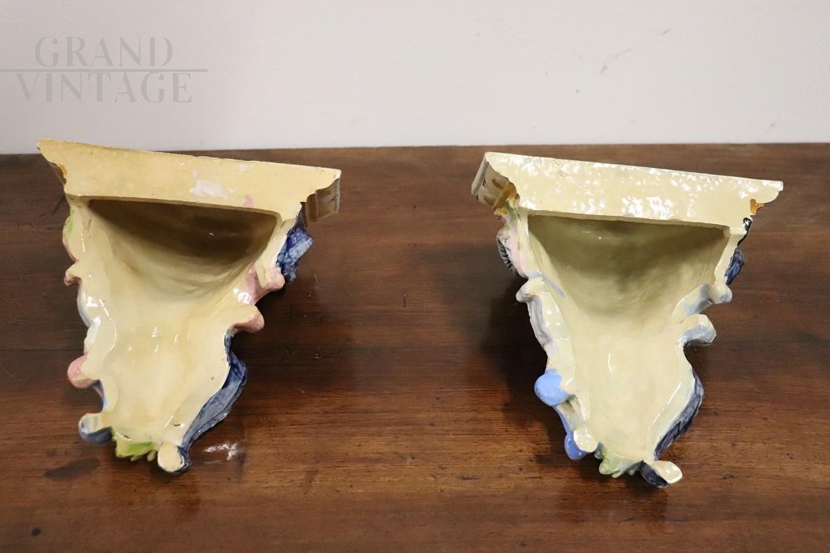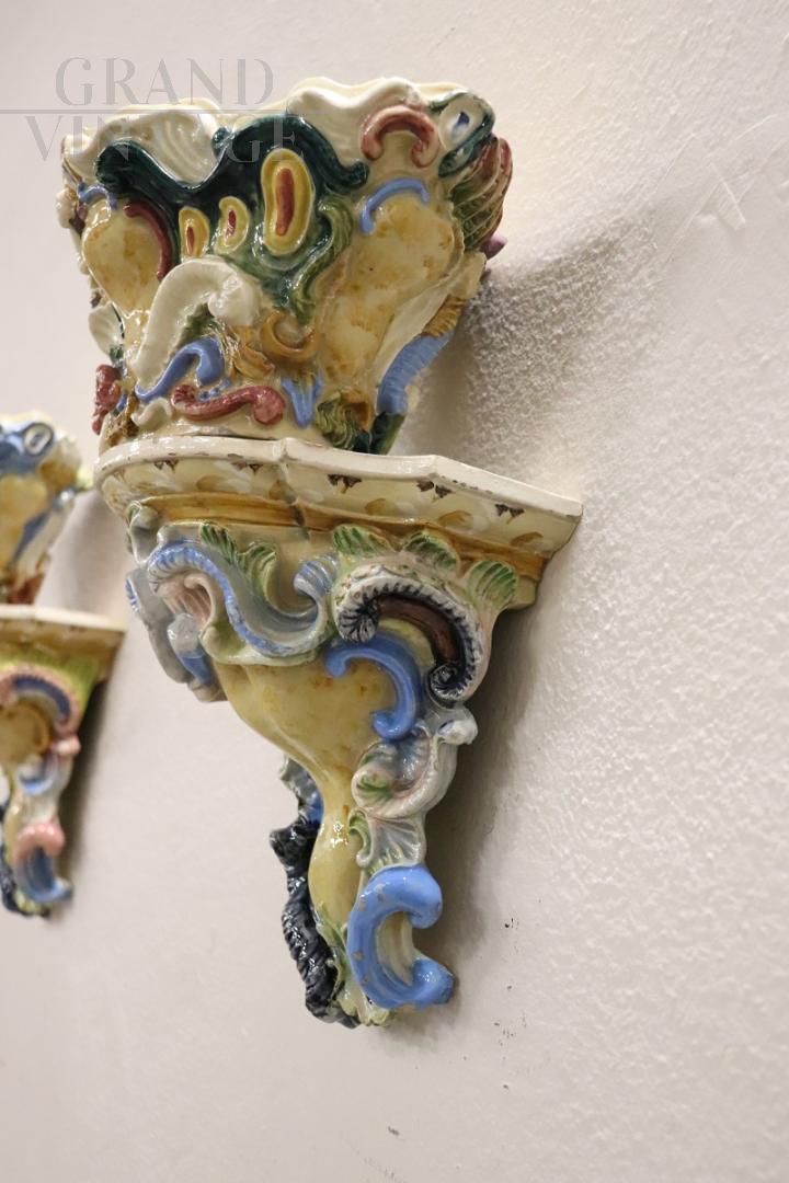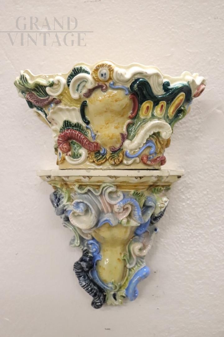 Questa coppia di mensole in maiolia con vaso è bella e raffinata, databile intorno agli utlimi decenni del secolo XIX. Caratterizzata da una ricca decorazione e da colori vivaci di gusto barocco tipici della produzione siciliana del sud Italia. In buone condizioni, presenta alcuni segni di usura, si prega di guardare tutte le foto. Le mensole devono essere fissate alla parete. Prezzo trattabile.