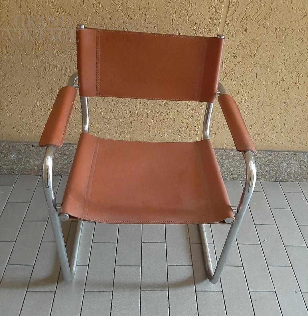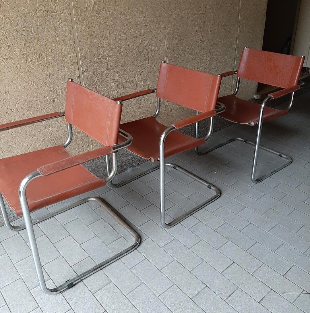 Quattro poltroncine cantilever Bauhaus di Mart Stam in cuoio marrone, con la classica struttura in acciaio con braccioli.