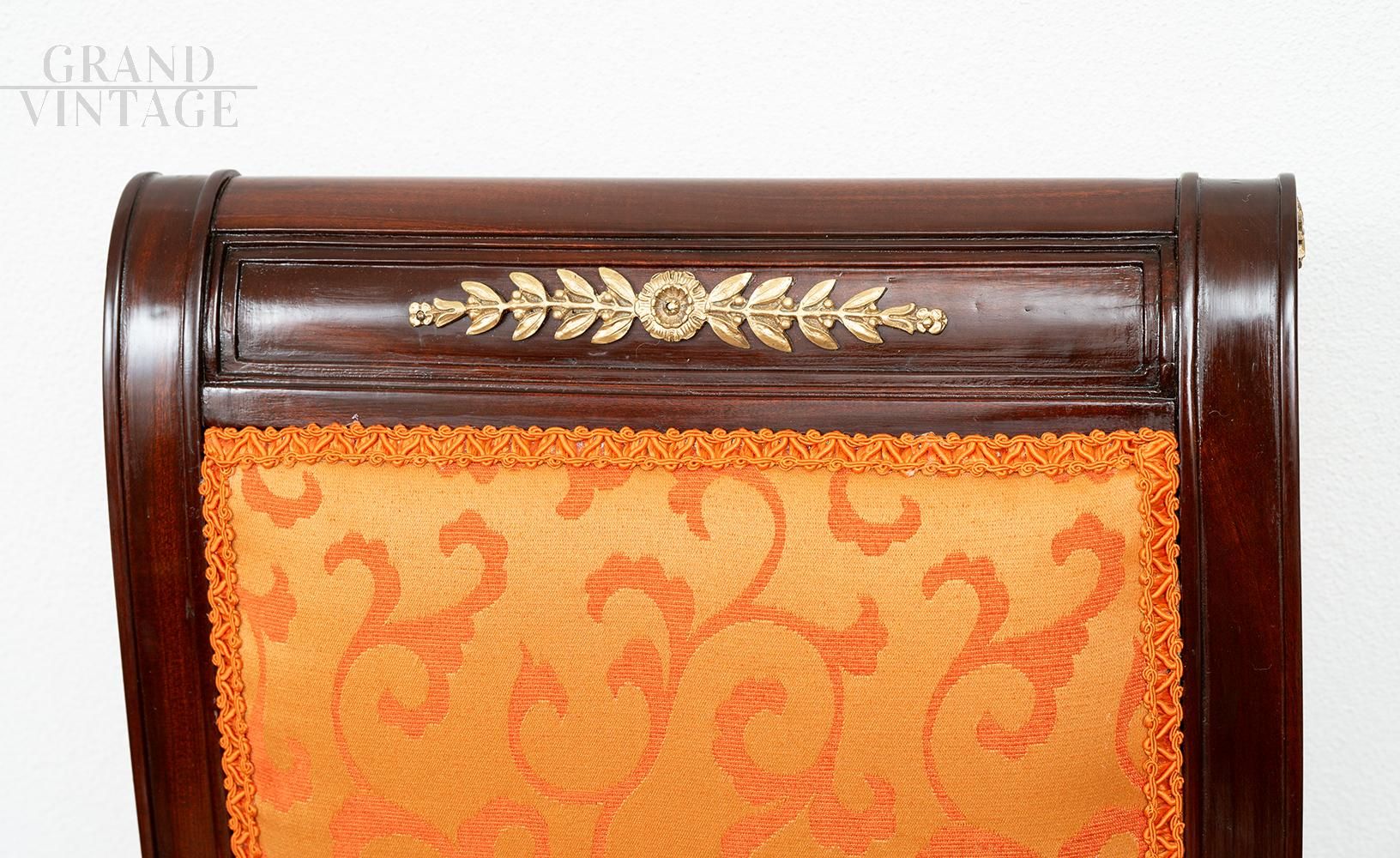 Set di quattro sedie Francesi antiche in massello di mogano e stoffa arancione, appartenenti alla seconda metà del XIX secolo. Lo schienale di forma quadrangolare è impreziosito da un elemento fogliaceo in bronzo. I piedi sono troncoconici e terminano con delle zampe a griffe. Condizioni: Restaurate e tappezzate da maestri artigiani con metodo tradizionale. Provenienza: Francia XIX secolo.