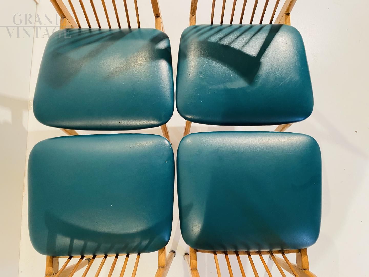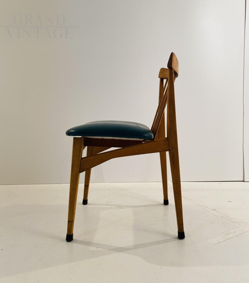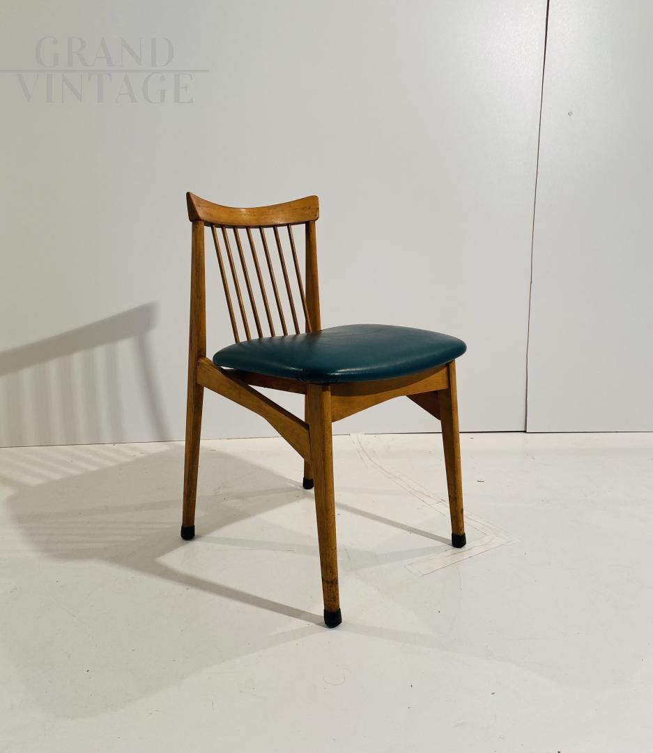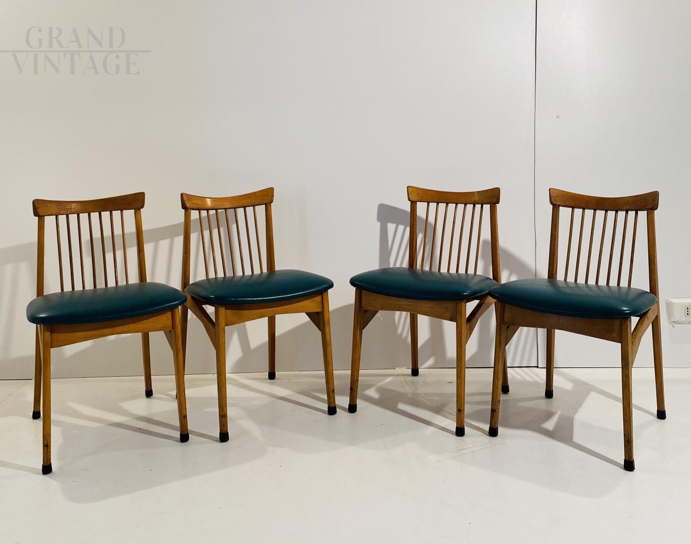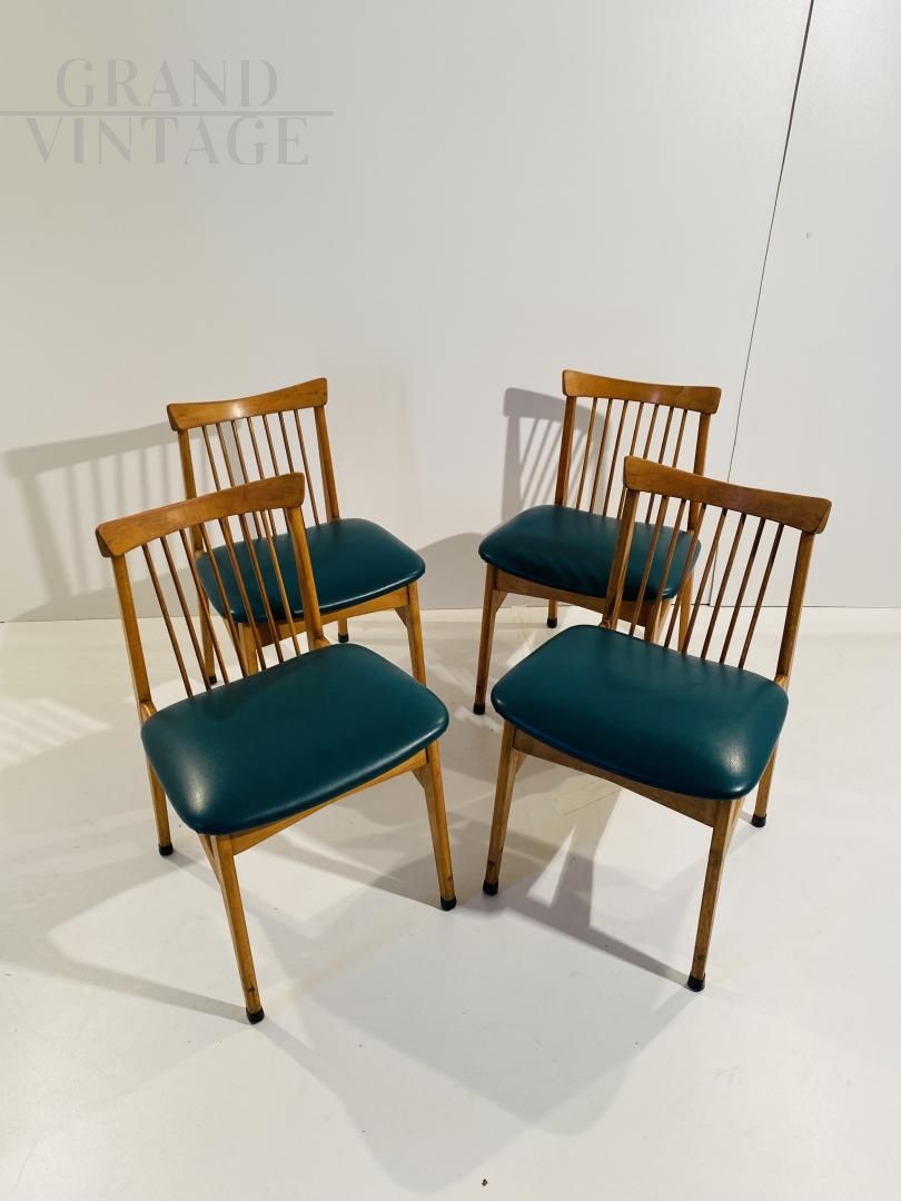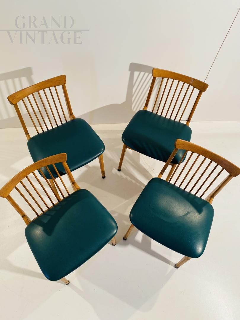 Set di quattro sedie vintage degli anni '60 con struttura in legno massello di faggio e seduta in skai verde ottanio, restaurate e in buone condizioni, con naturali segni del tempo. Altezza seduta: 47 cm.