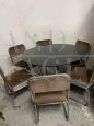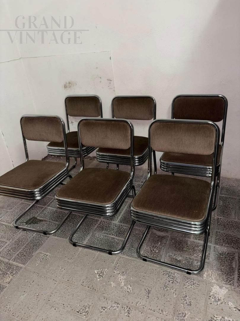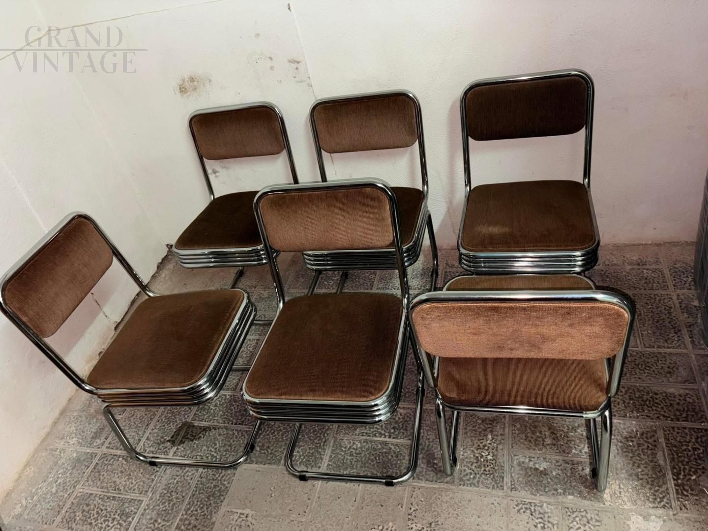 Set di sei sedie vintage in metallo cromato con seduta e schienale imbottiti e rivestiti in velluto a coste color marrone, possibilità di abbinare il tavolo come da foto.