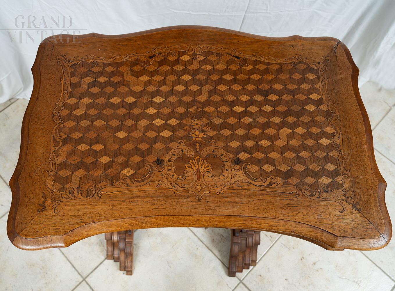 Set di quattro tavolini a nido impilabili in noce con piano intarsiato a motivi geometrici. I quattro tavolini sono incastrati l'uno nell'altro proprio per recuperare quanto più spazio possibile. I piani hanno un andamento curvilineo con al centro un intarsio geometrico contornato da un intarsio a racemi e fiori. I piedi sono fratinati e sono collegati da una crociera mistilinea.