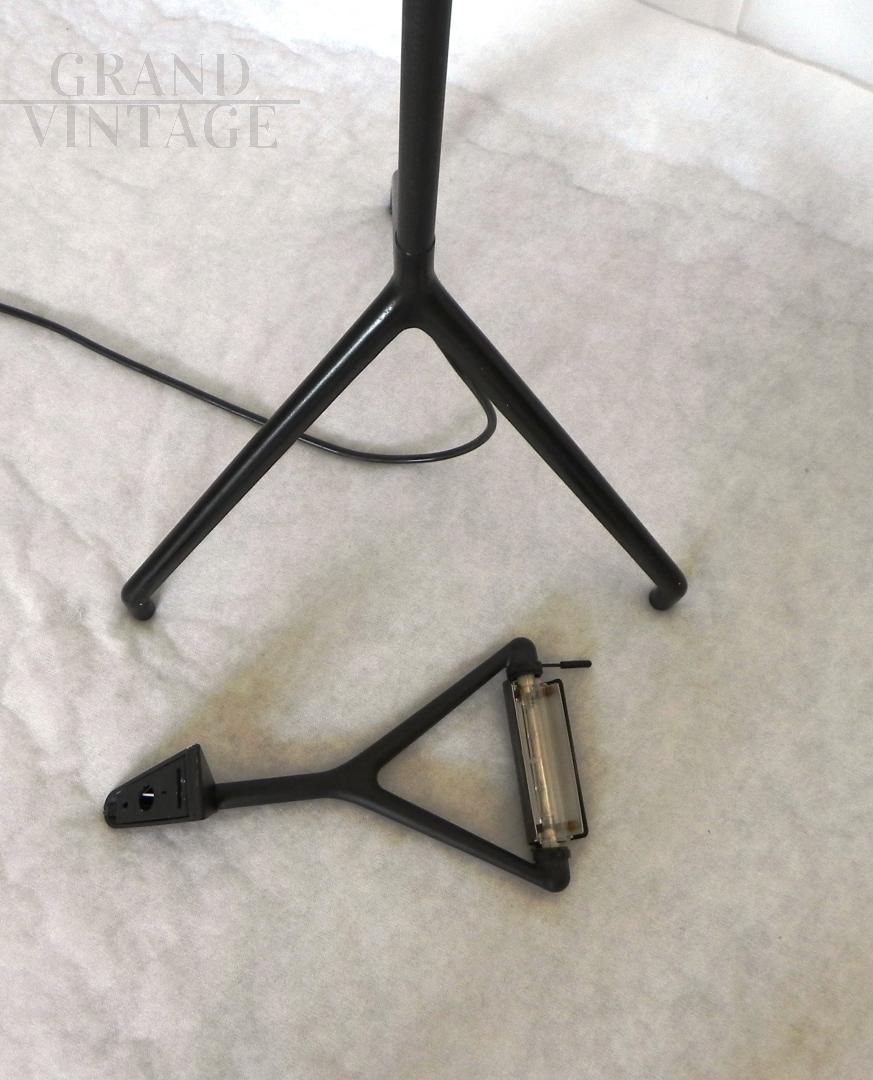 Set di lampada a stelo piantana e applique modello Lola di Luceplan, anni '80. La lampada a stelo è regolabile in altezza da 160 a 200 cm, ha una luminosità regolabile in 4 intensità grazie a un interruttore dimmer a pedale, e ha anche un piccolo pulsante luminoso sullo stelo. La piantana è usata, porta quindi i naturali segni d'uso, visibili in foto. L'applique ha una basetta di fissaggio a muro, la sua luce ha intensità fissa. Entrambe le luci sono orientabili in senso verticale e sono munite di lampada alogena 150 w, ma si può montare anche una lampada a led delle stesse misure.