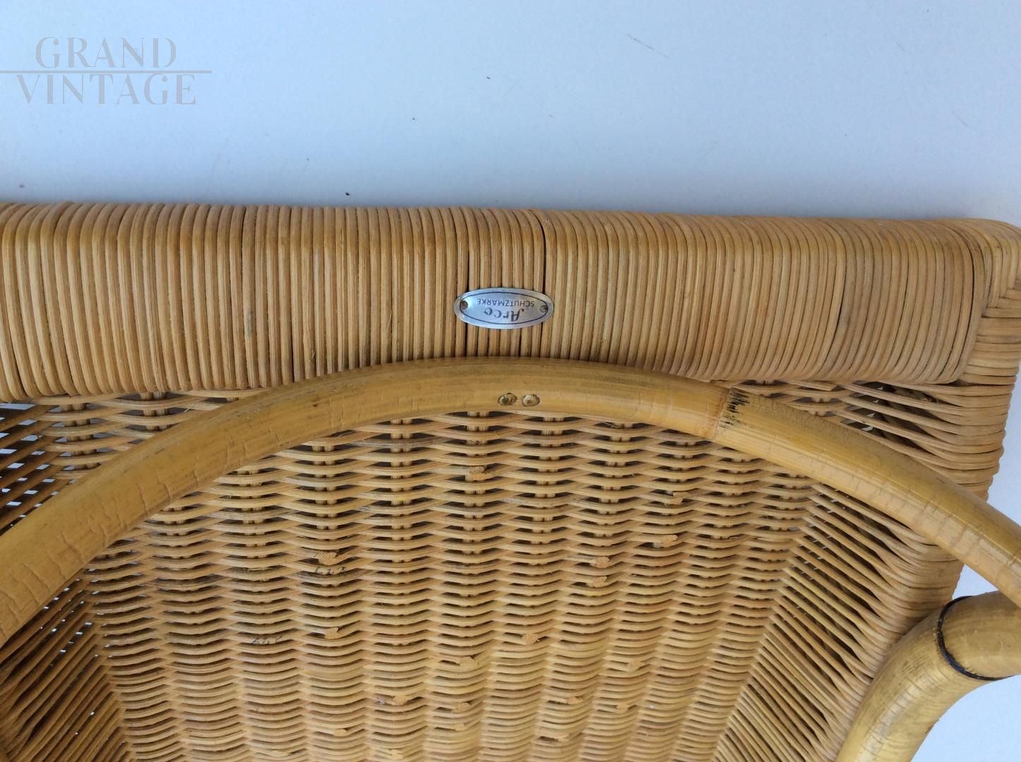 Set da giardino composto da una poltrona lounge e uno sgabello poggiapiedi in bamboo e midollino, prodotta da Arco - Schutzmarke negli anni '60. Condizioni perfette per entrambi i pezzi. A corredo della poltrona c’ è un morbido cuscino in cotone spesso, come da foto.