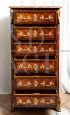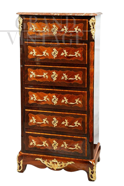 Settimino antico Napoleone III Francese in legni esotici pregiati con applicazioni in bronzo dorato finemente cesellato. Il fronte è scandito da sei cassetti adornati con belle bocchette e maniglie in bronzo dorato finemente cesellato. I due cantoni sono adornati da elementi in bronzo, mentre la base mistilinea è impreziosita da un fregio sempre dello stesso materiale e termina con due piedi a cabriolet. Sul piano poggia una lastra in marmo rosso Francia. Il settimino è stato restaurato da maestri artigiani con metodo tradizionale gommalacca e alcool fatto a mano. Provenienza: Francia XIX secolo.