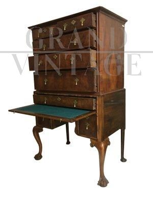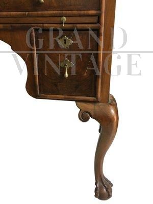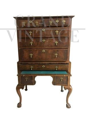 Cassettiera settimanale antica inglese in legno di noce e radica di noce, con bellissimo piano scrittoio estraibile, Inghilterra XVIII secolo.