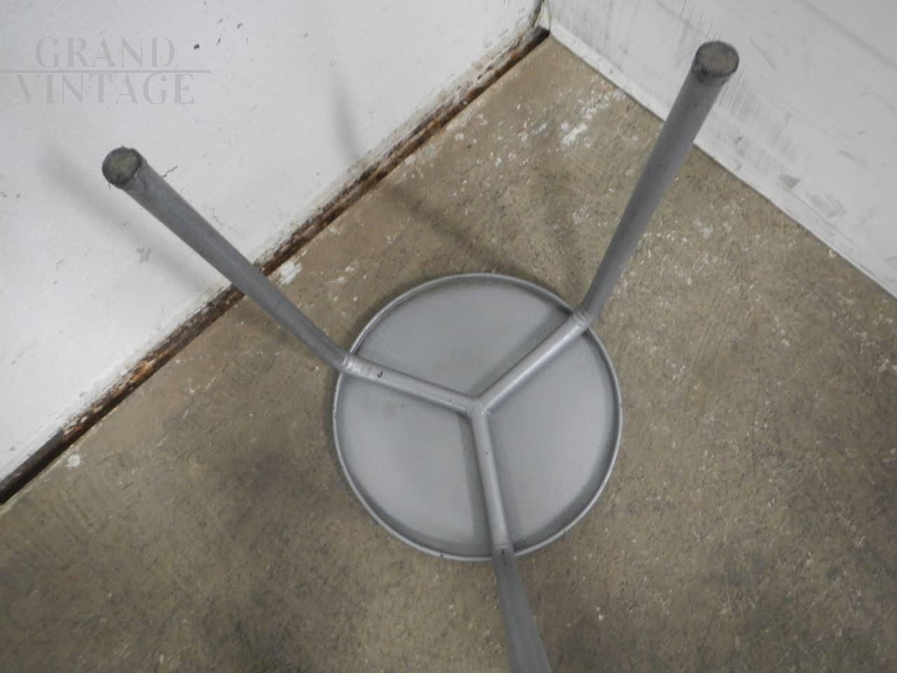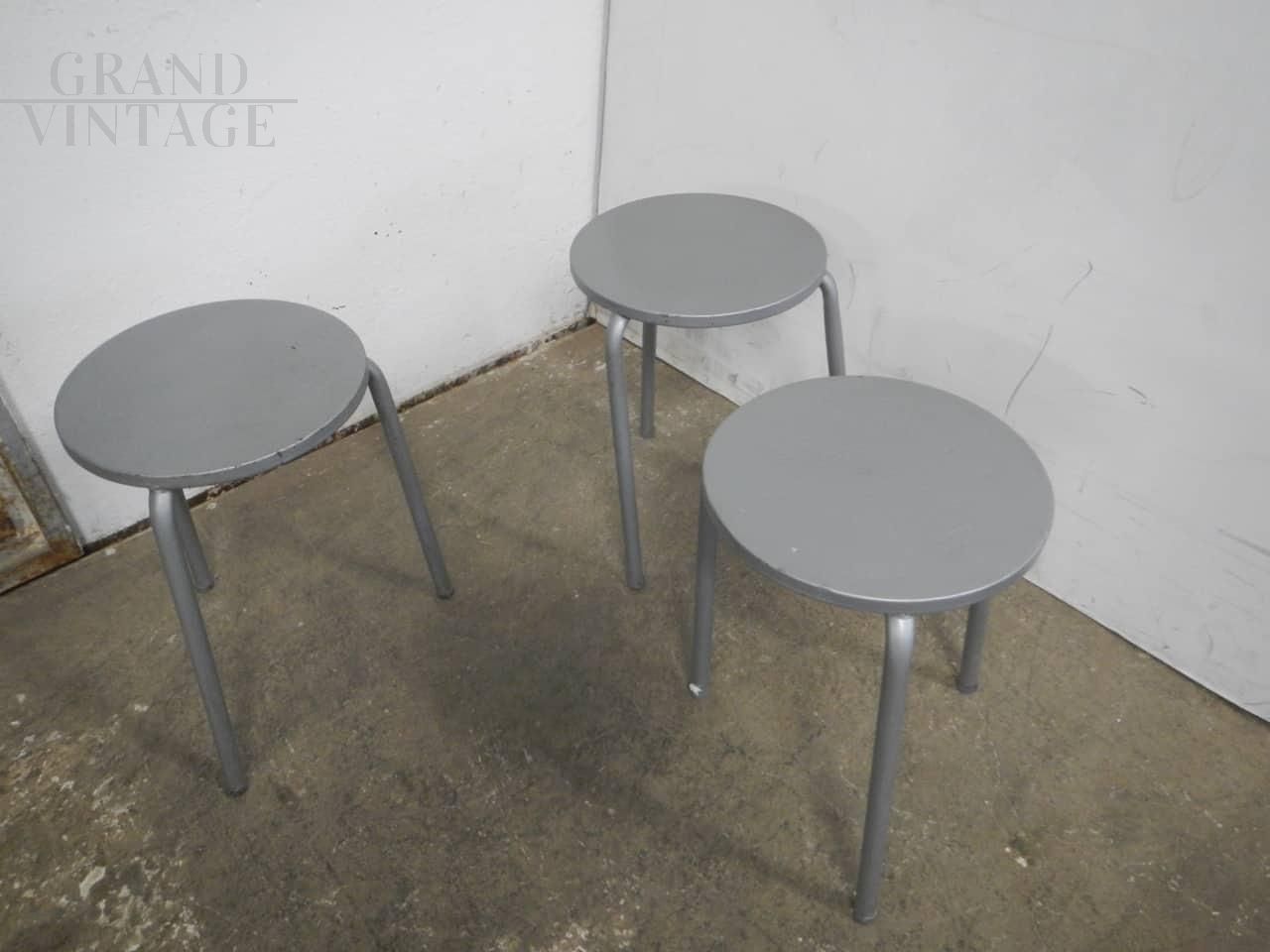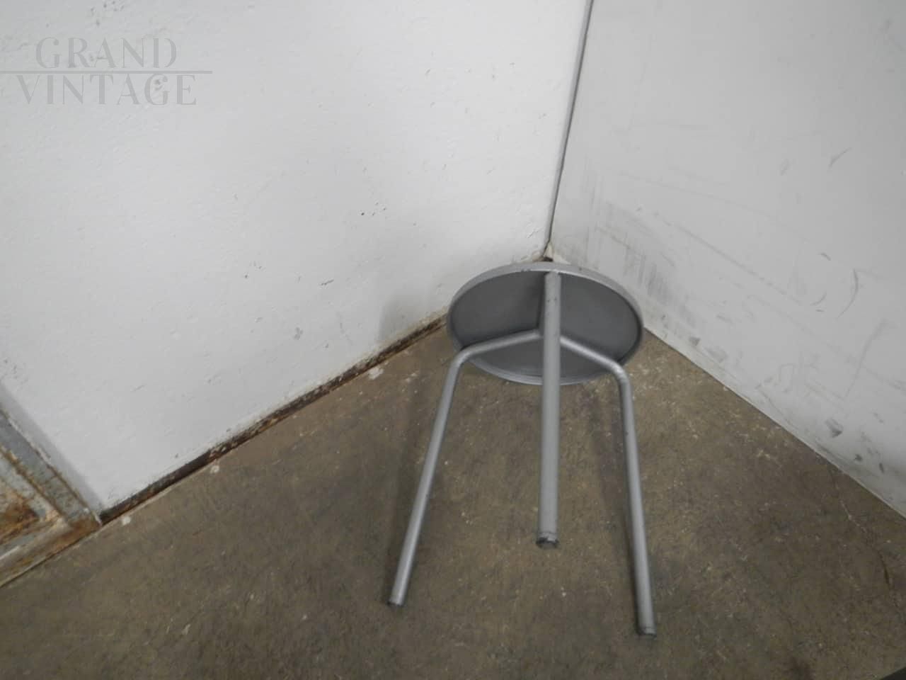 Sgabelli vintage industriali con struttura fissa a tre gambe in metallo verniciato grigio. In buone condizioni con segni d’uso. Disponibili 3 sgabelli, il prezzo indicato si riferisce al singolo pezzo.