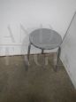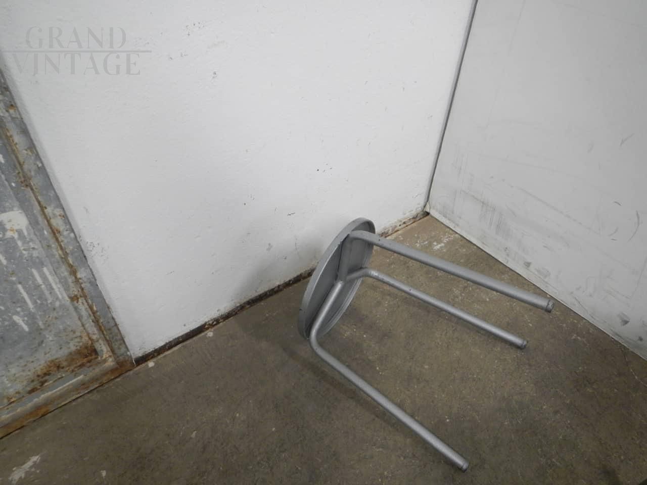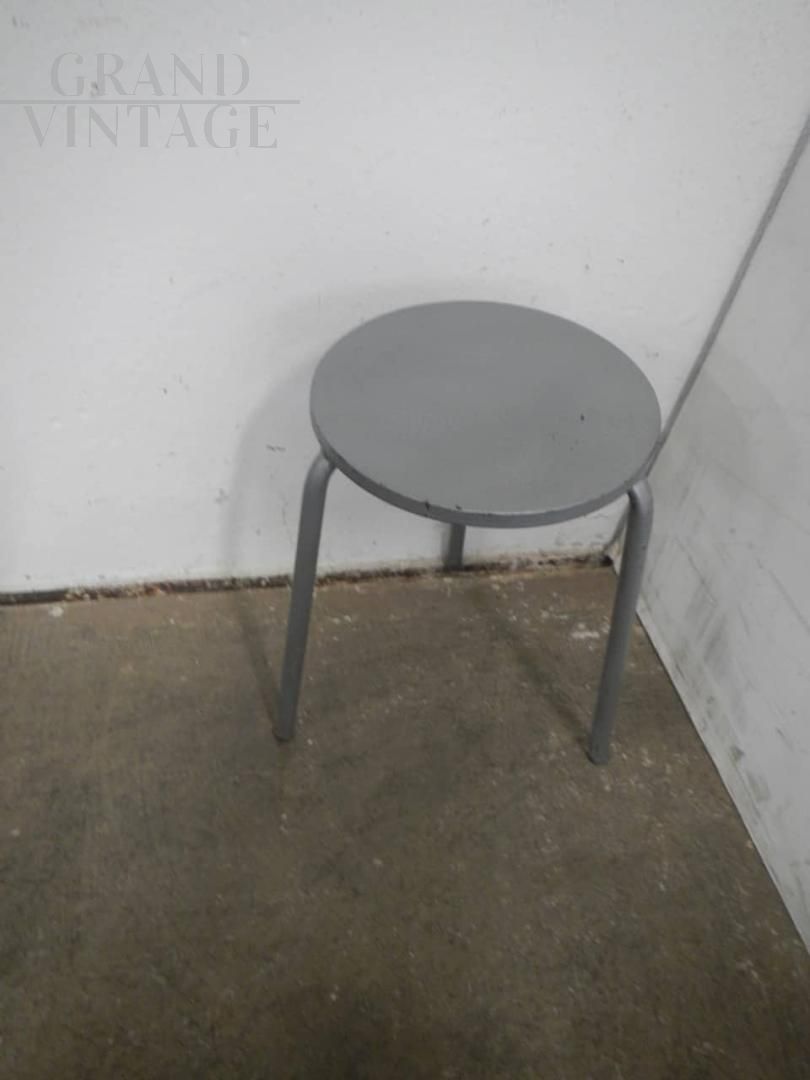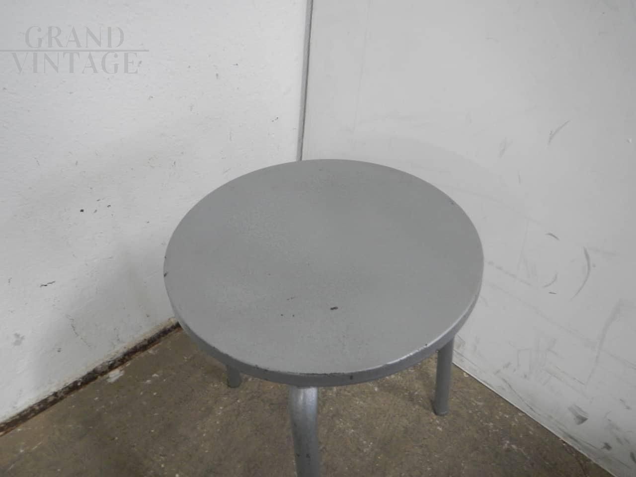 Sgabelli vintage industriali con struttura fissa a tre gambe in metallo verniciato grigio. In buone condizioni con segni d’uso. Disponibili 3 sgabelli, il prezzo indicato si riferisce al singolo pezzo.