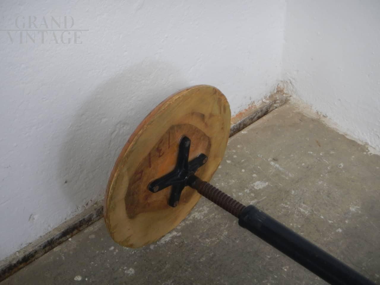 Sgabello vintage industriale girevole e regolabile con tre piedi, la struttura è in ferro nero e la seduta rotonda è in legno di faggio. Regolabile in altezza da 49 a 60 cm, pulito e trattato con vernice da ferro e cera da legno.