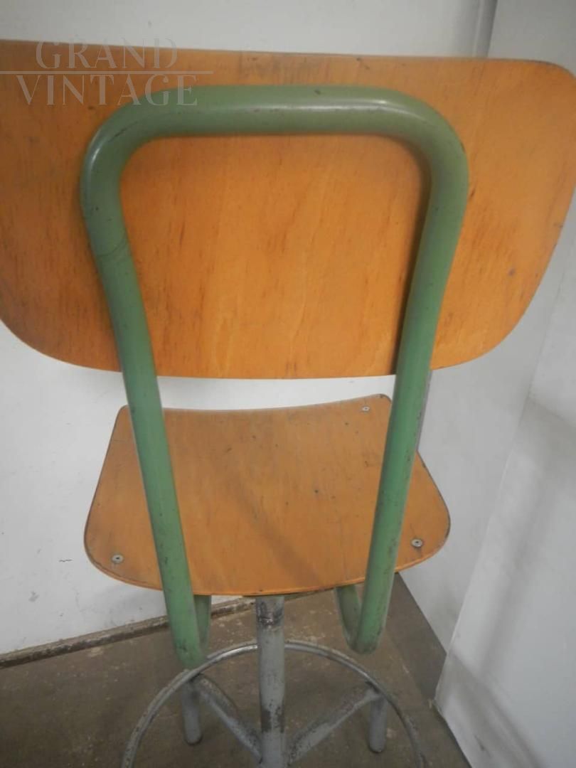 Sgabello vintage industriale alto con schienale e seduta in legno di faggio e struttura in metallo laccato verde con rotelle e poggiapiedi. In buone condizioni, presenta i naturali segni dell'uso. La seduta misura 34 cm, è regolabile in altezza da 62 a 77 cm.