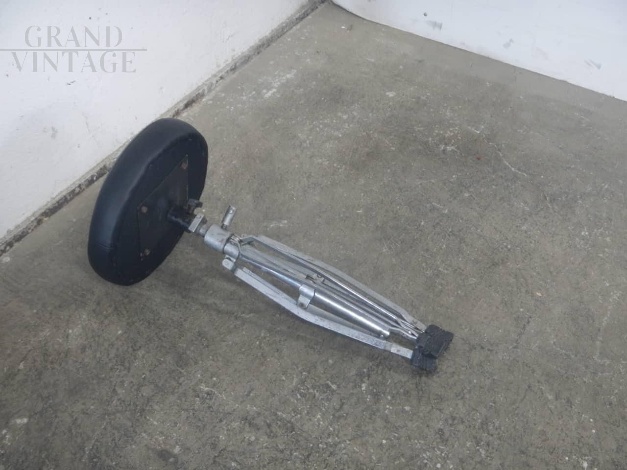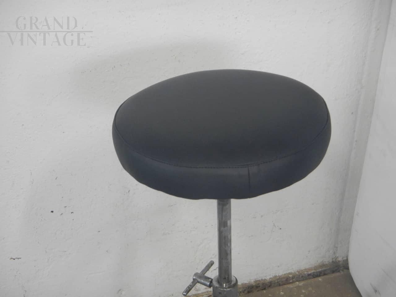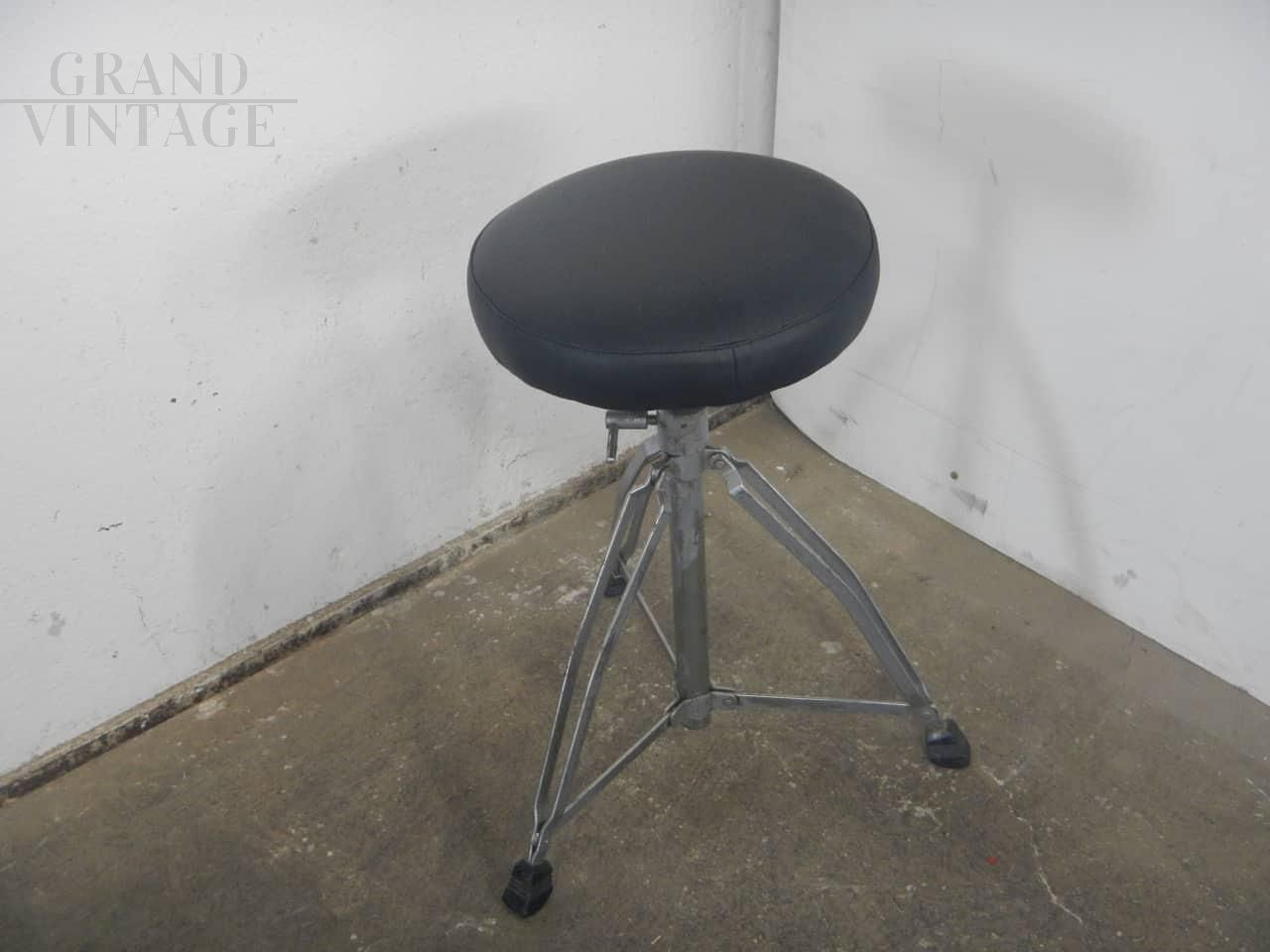 Sgabello da batteria vintage in metallo e similpelle, con struttura pieghevole. Il rivestimento in similpelle della sella è nuovo. In buone condizioni, la seduta è regolabile in altezza da cm 54 a cm 80.