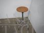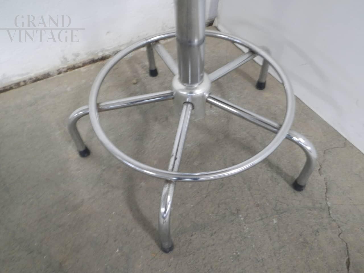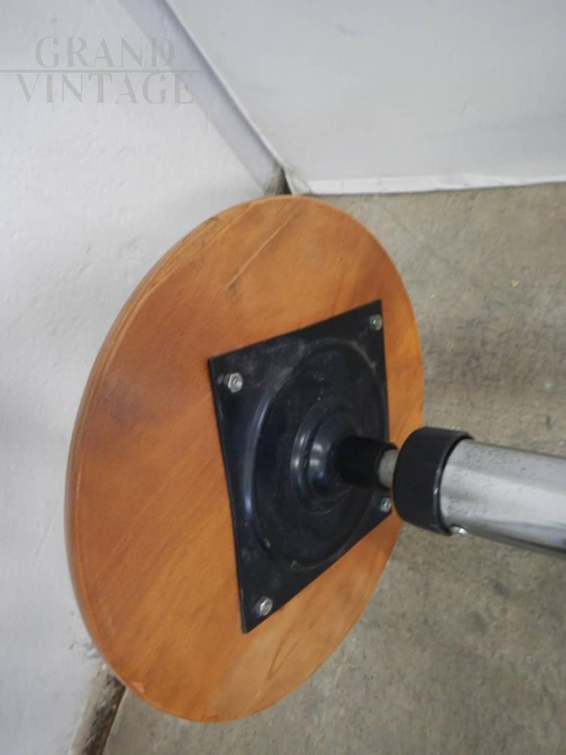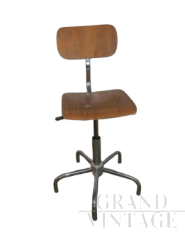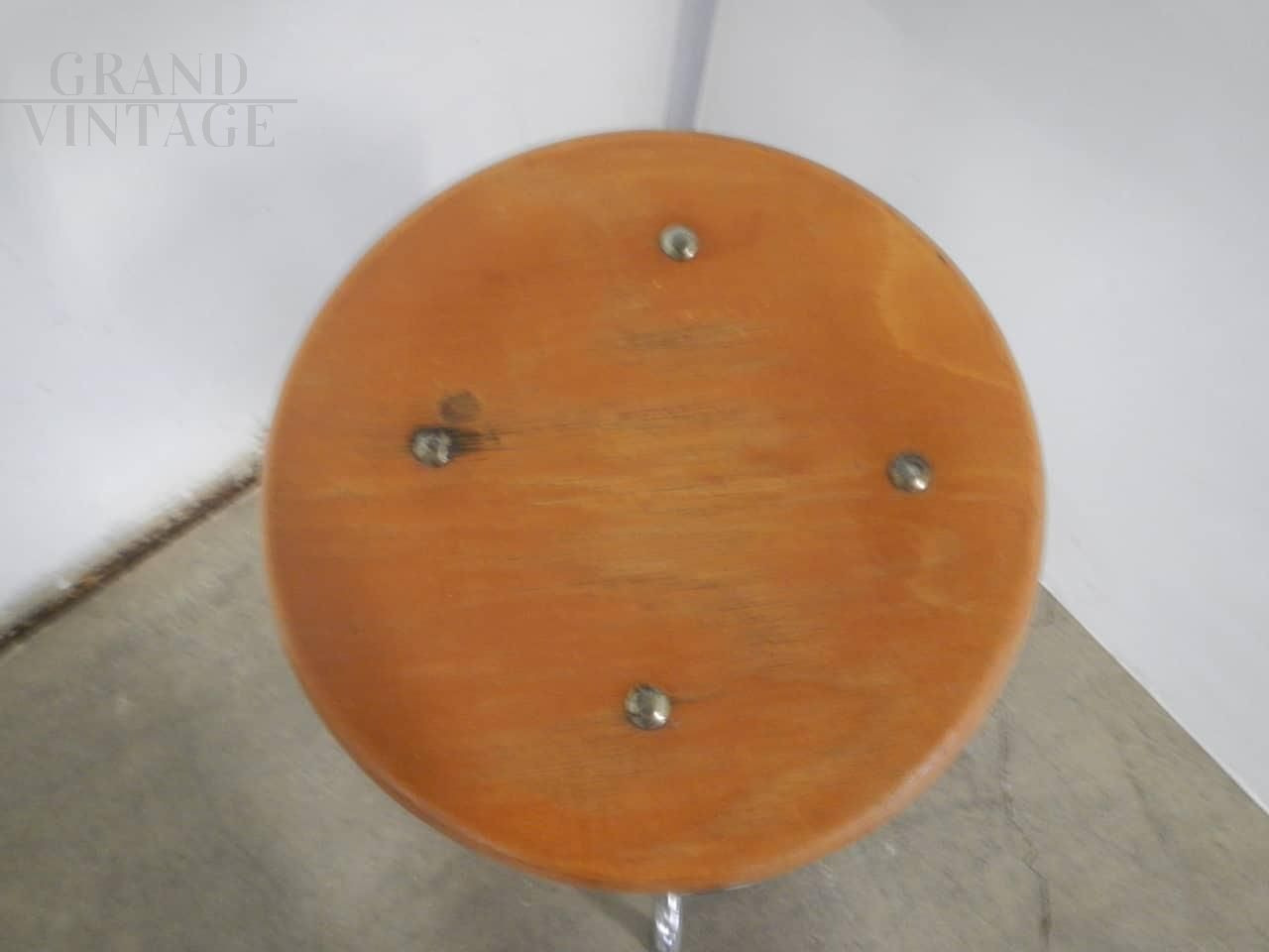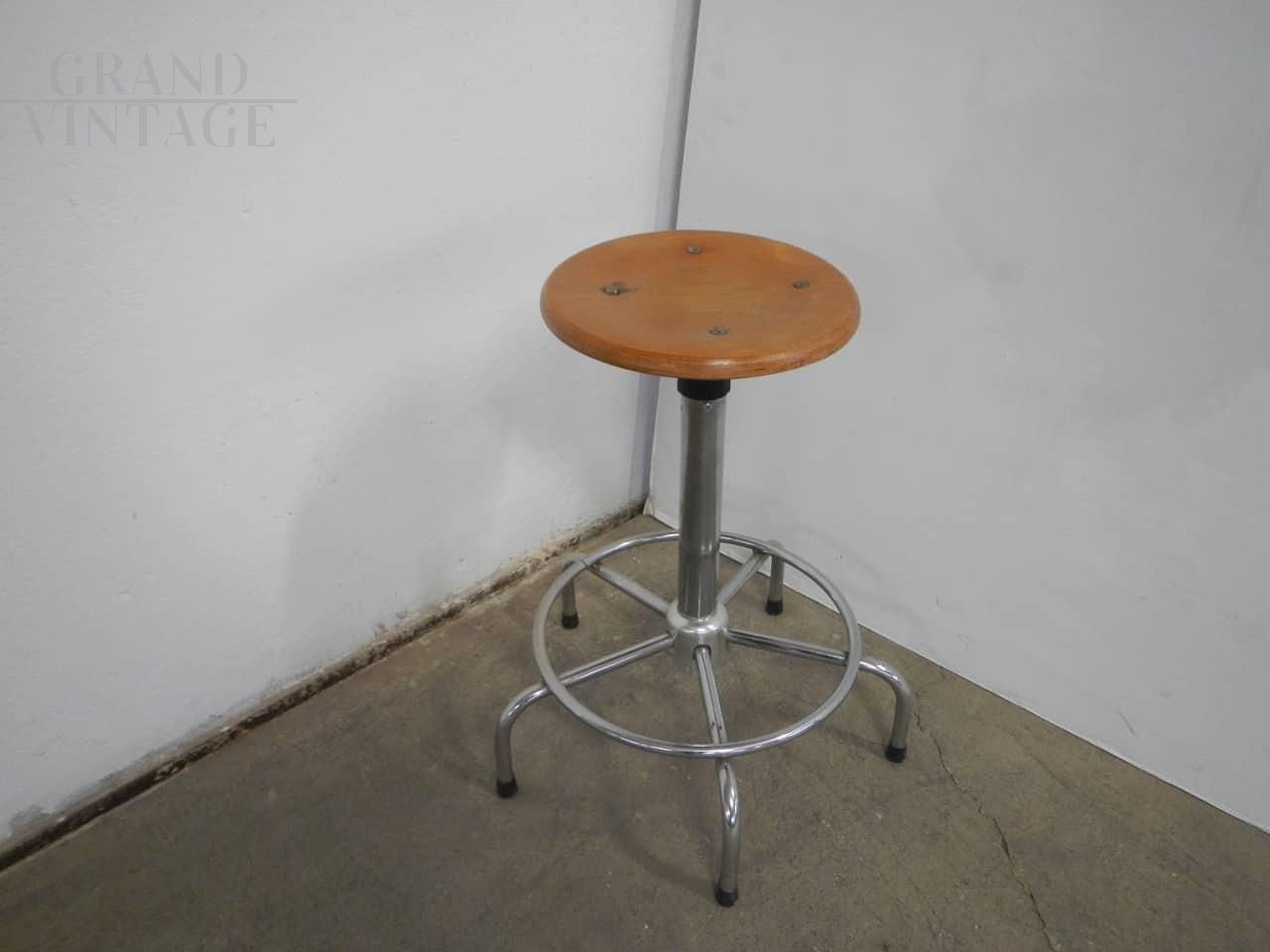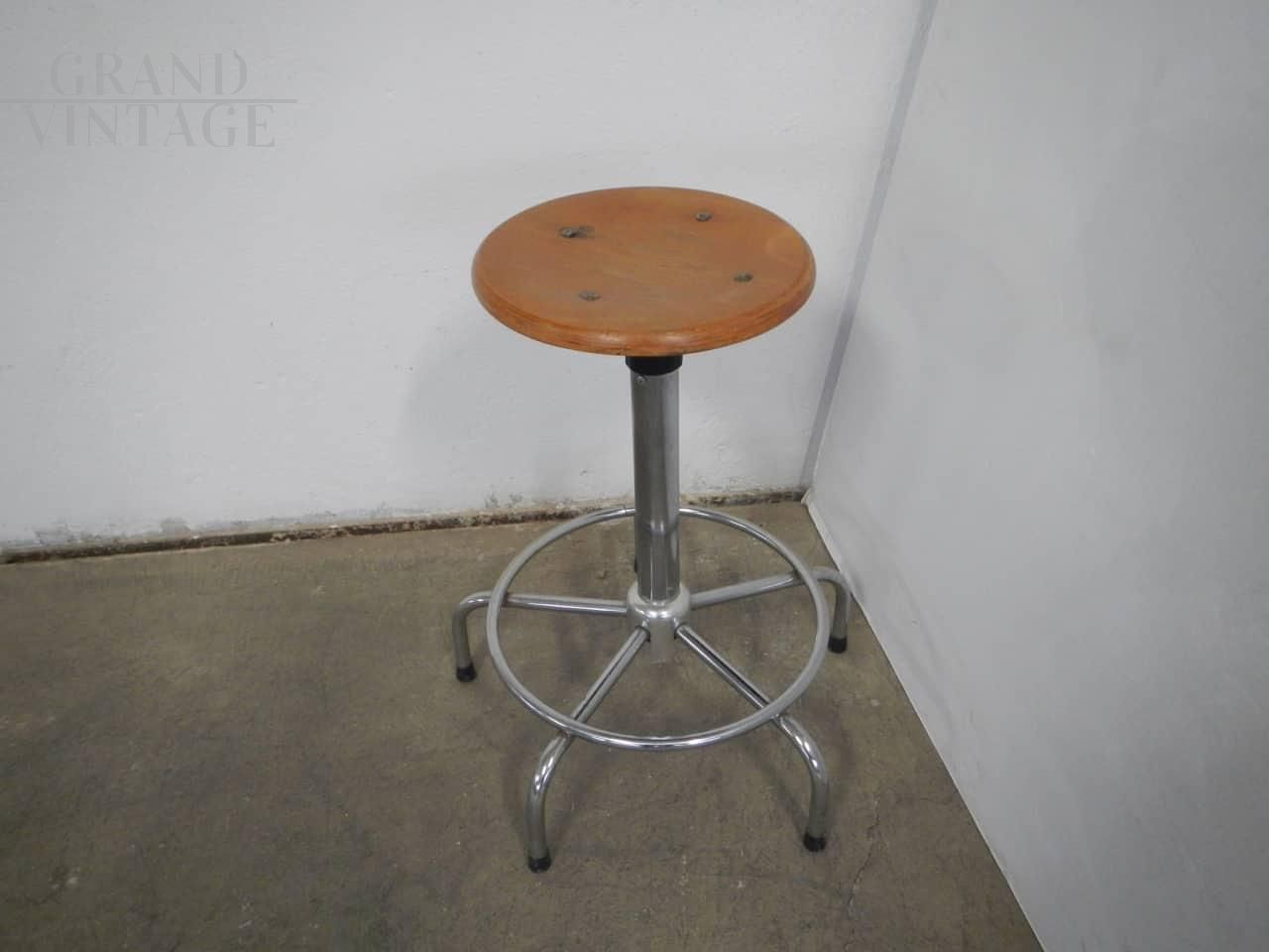Sgabello vintage da ufficio con regolazione di altezza da cm 65 a cm 75, con seduta in legno.