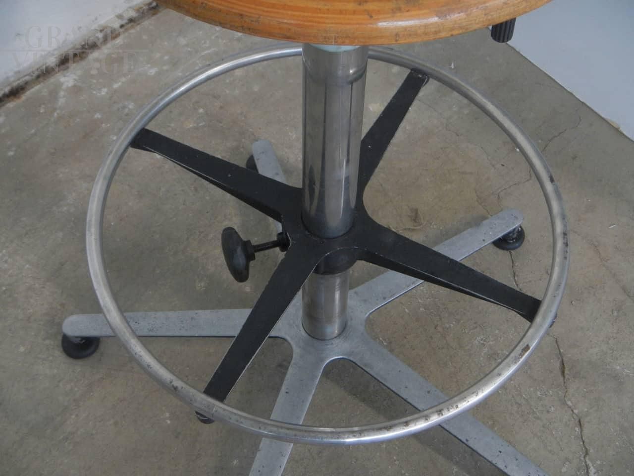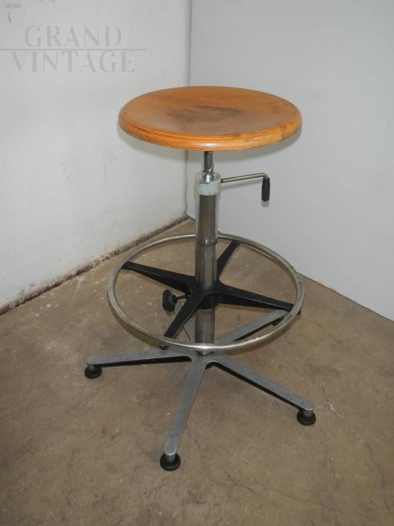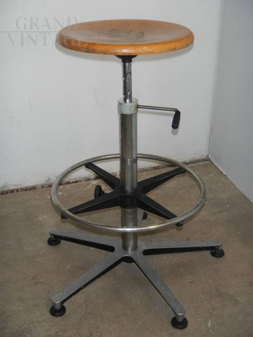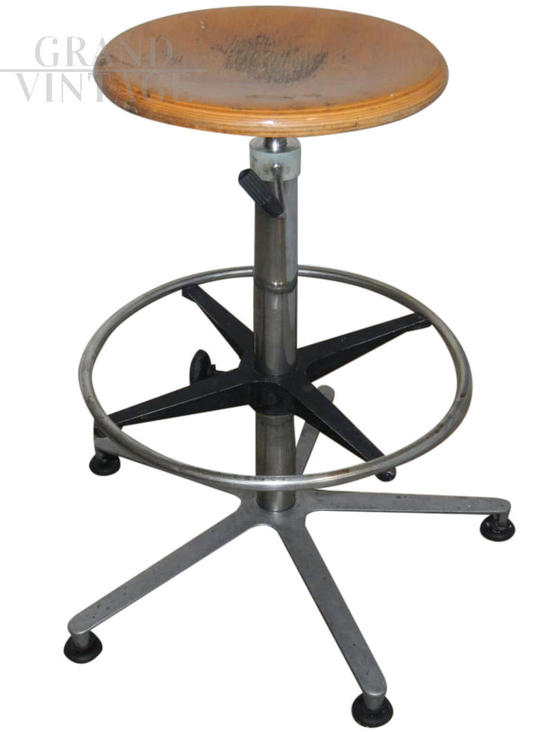 Sgabello vintage da ufficio con poggiapiedi regolabile, seduta in legno di faggio regolabile in altezza da cm 65 a cm 75.