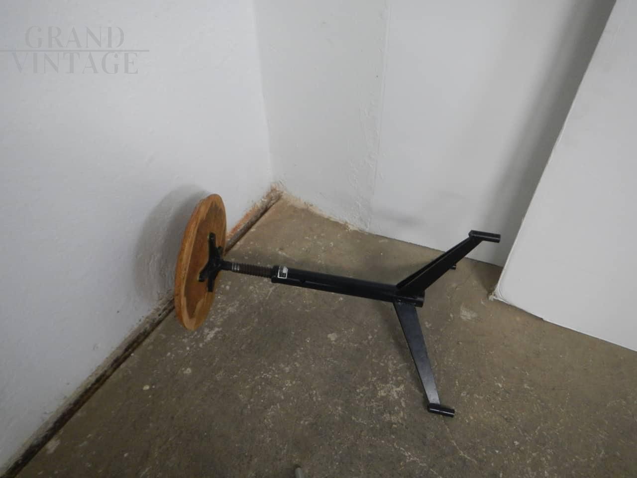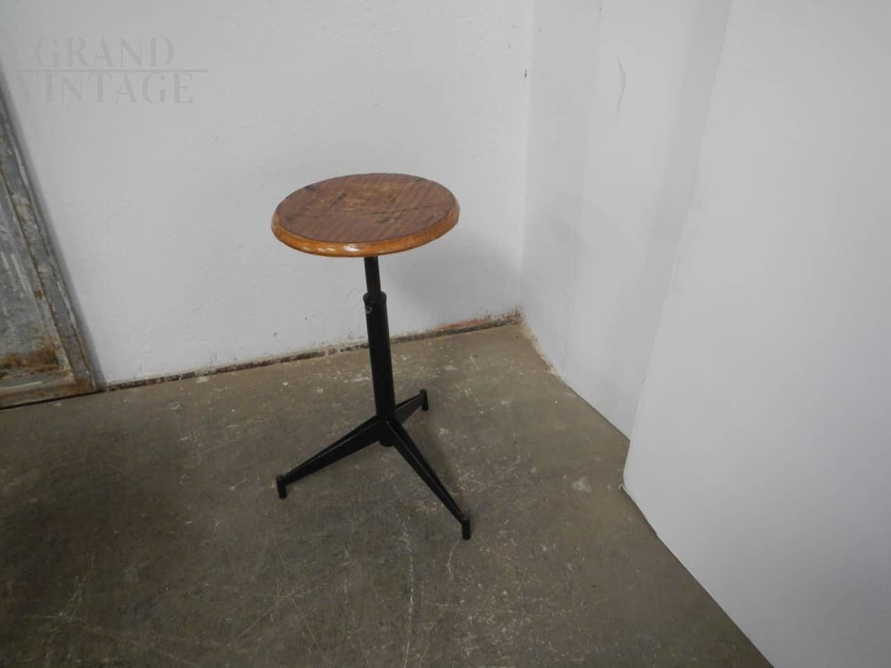 Sgabello vintage industriale con tre piedi, la struttura è fissa in ferro nero e la seduta rotonda è in legno di faggio. Lo sgabello non è girevole nè regolabile poiché il meccanismo non è funzionante. L'altezza fissa è di 59 cm. Presenta i naturali segni di usura sulla seduta.