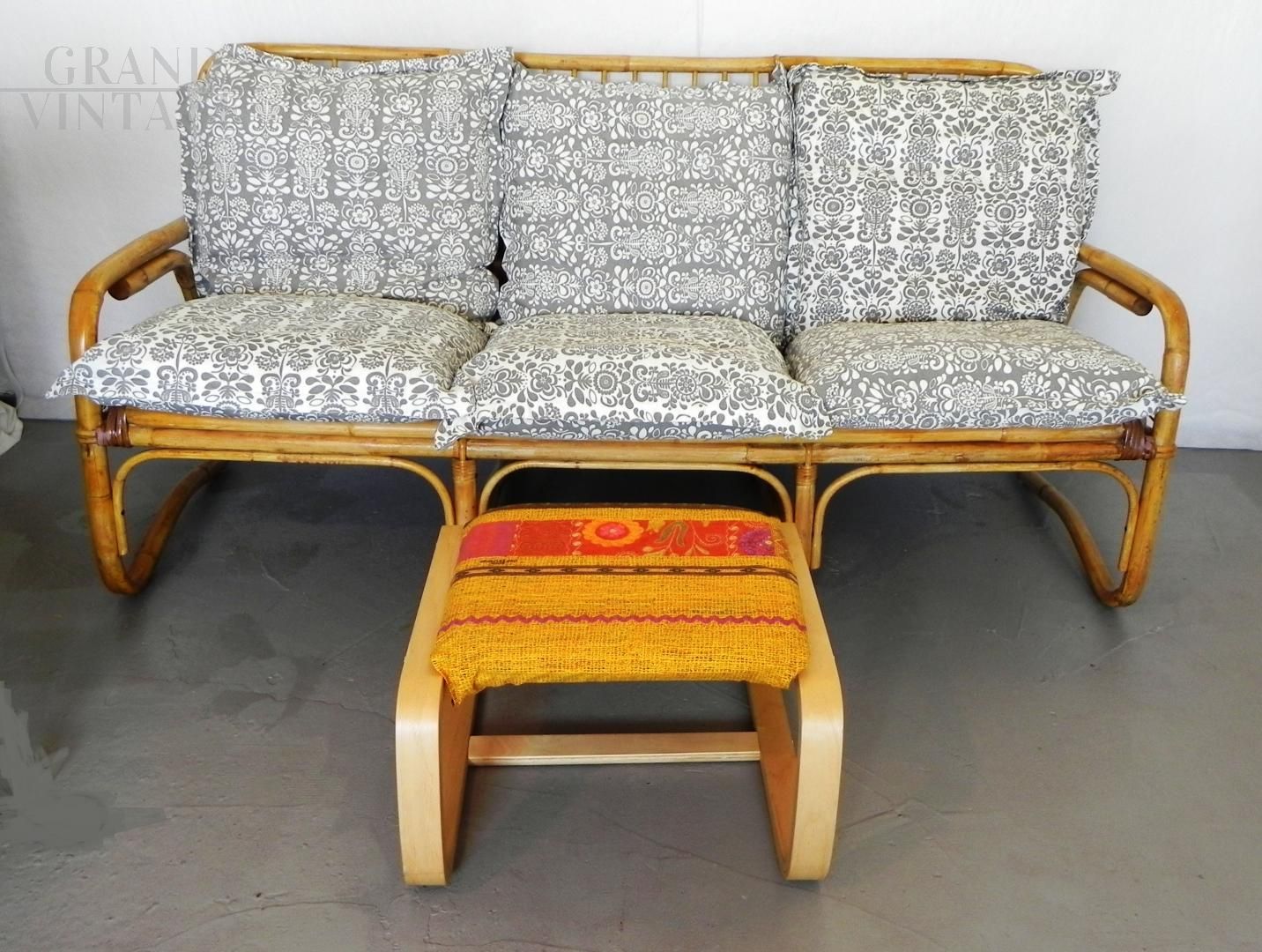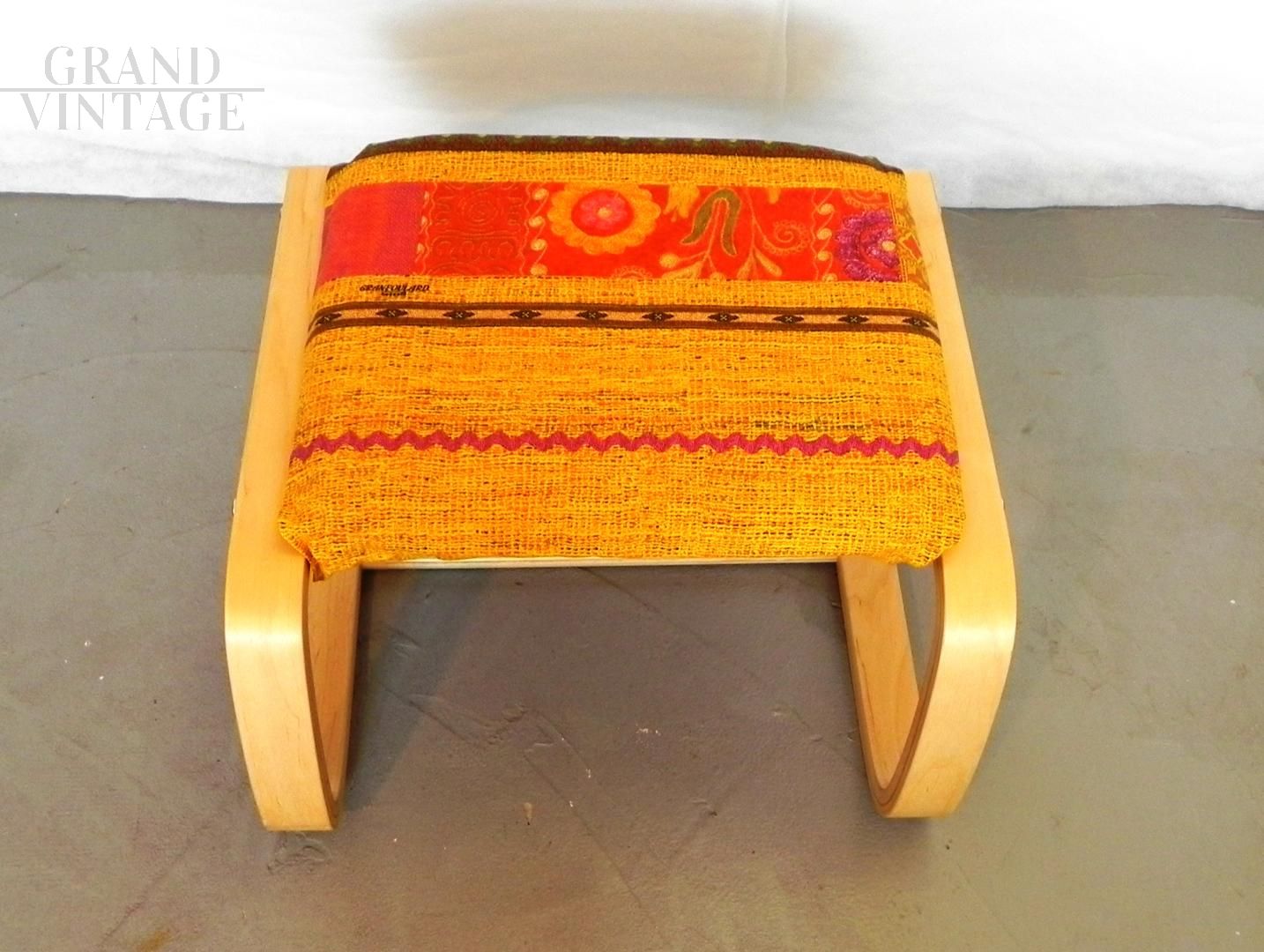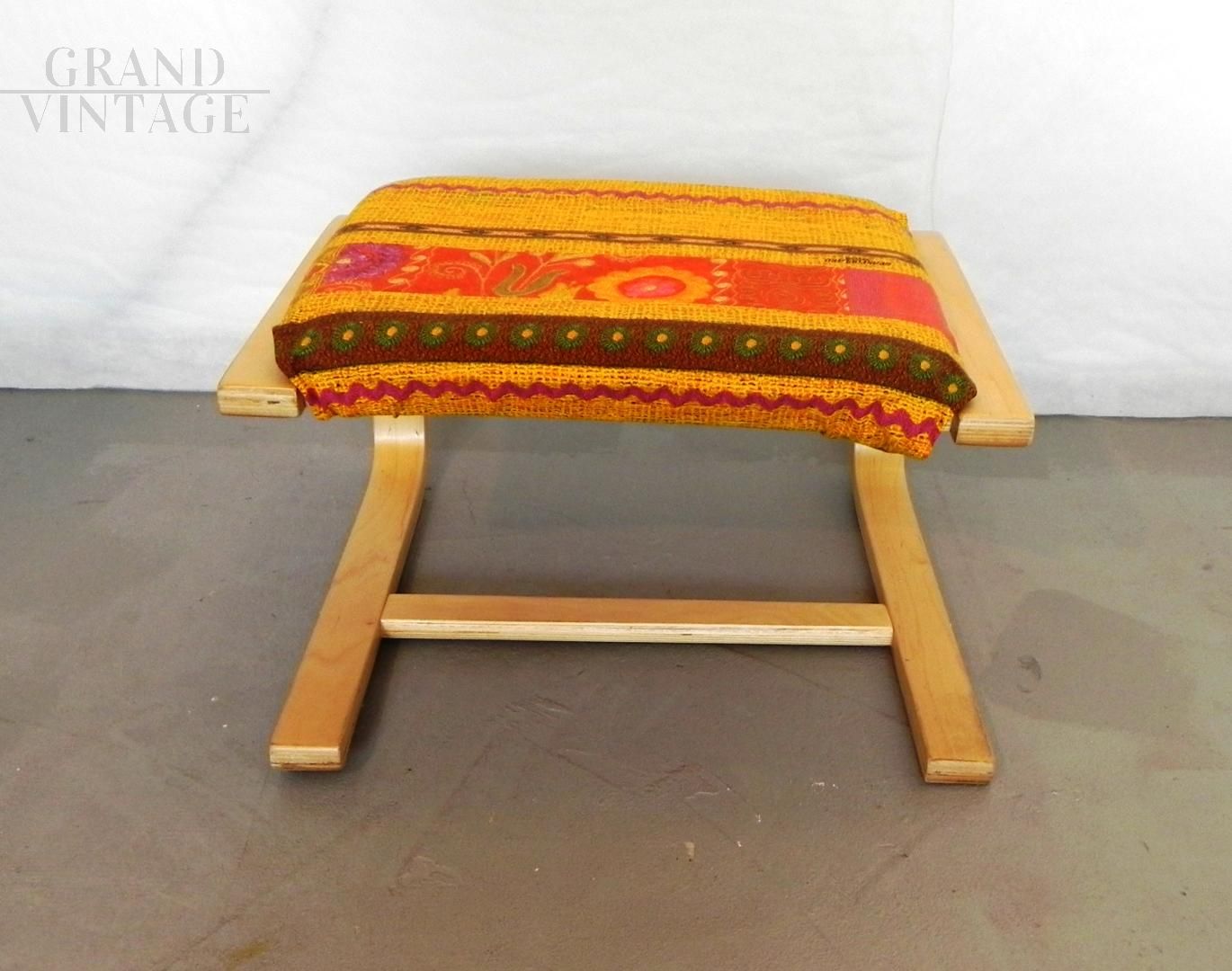 Piccolo sgabello pouf vintage in legno curvato di betulla, con imbottitura e rivestimento stile etnico in tessuto rosso e arancione personalizzato da cover fissata a velcro. Seduta rifoderabile a piacere.