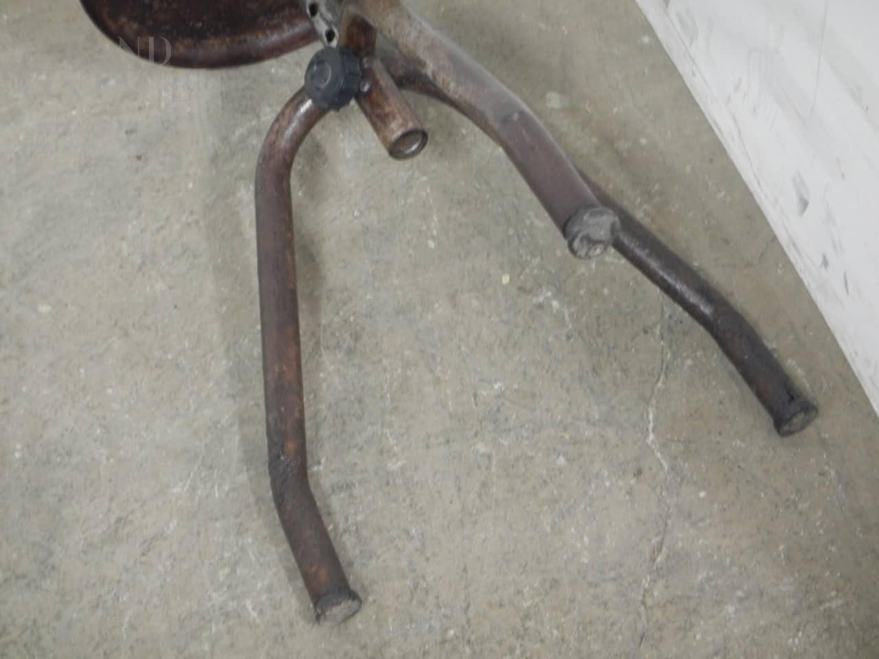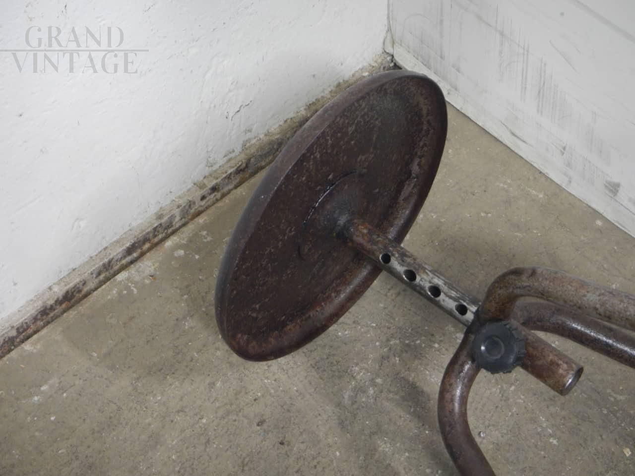 Sgabello vintage industriale da officina a 3 gambe in ferro laccato grigio e marrone, regolabile in altezza fino a raggiungere i 57 cm. Diametro seduta 31 cm. Restaurato e trattato con vernice da ferro che lo rende liscio al tatto pur conservandone i bei segni del tempo.