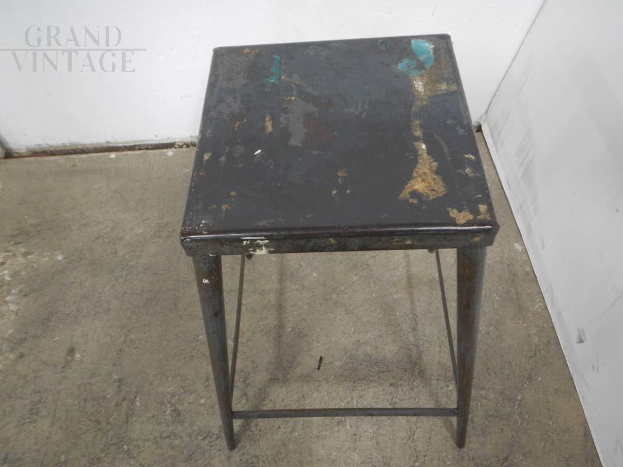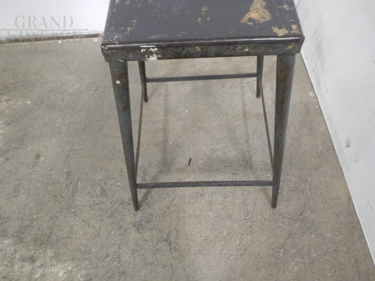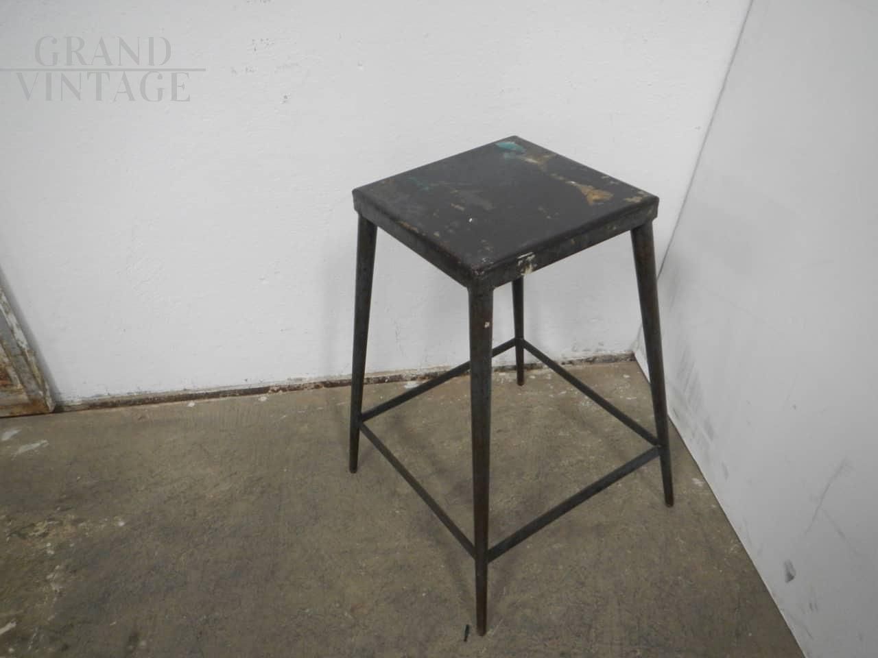 Sgabello vintage industriale in ferro da officina con poggiapiedi, con seduta quadrata, pulito e lasciato con il suo colore originale, trattato con vernice da ferro che lo rende liscio al tatto. Presenta i naturali segni d’uso.