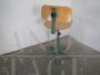 Sgabello industriale regolabile e girevole con struttura in ferro laccato verde con 5 gambe e con seduta e schienale in legno laminato di faggio. Lo schienale è reclinabile. La seduta misura cm 40 x 40. Regolabile manualmente da cm 61 a cm 47.