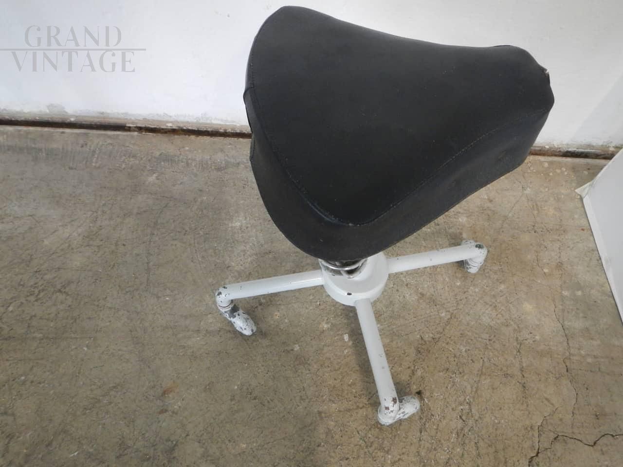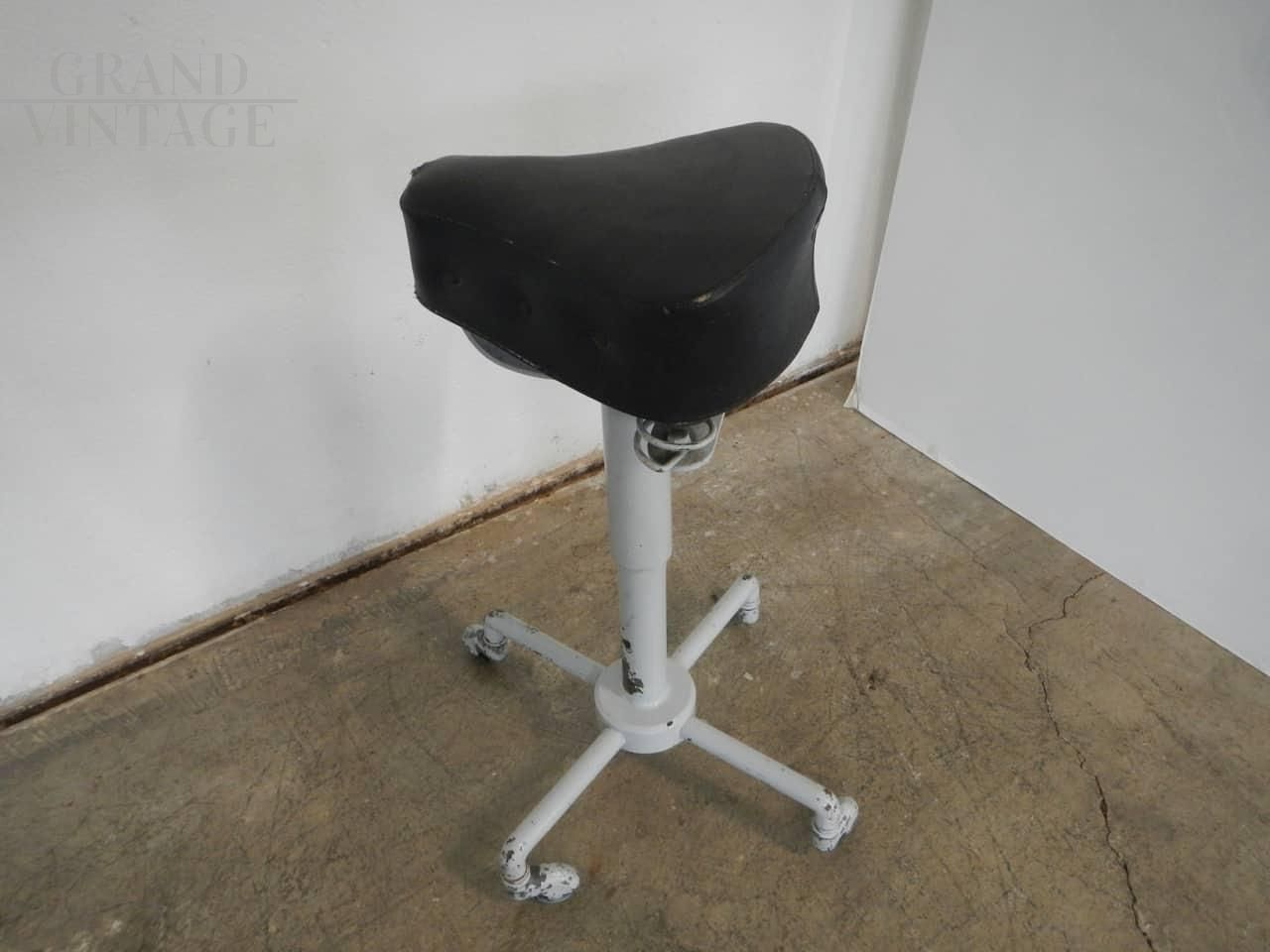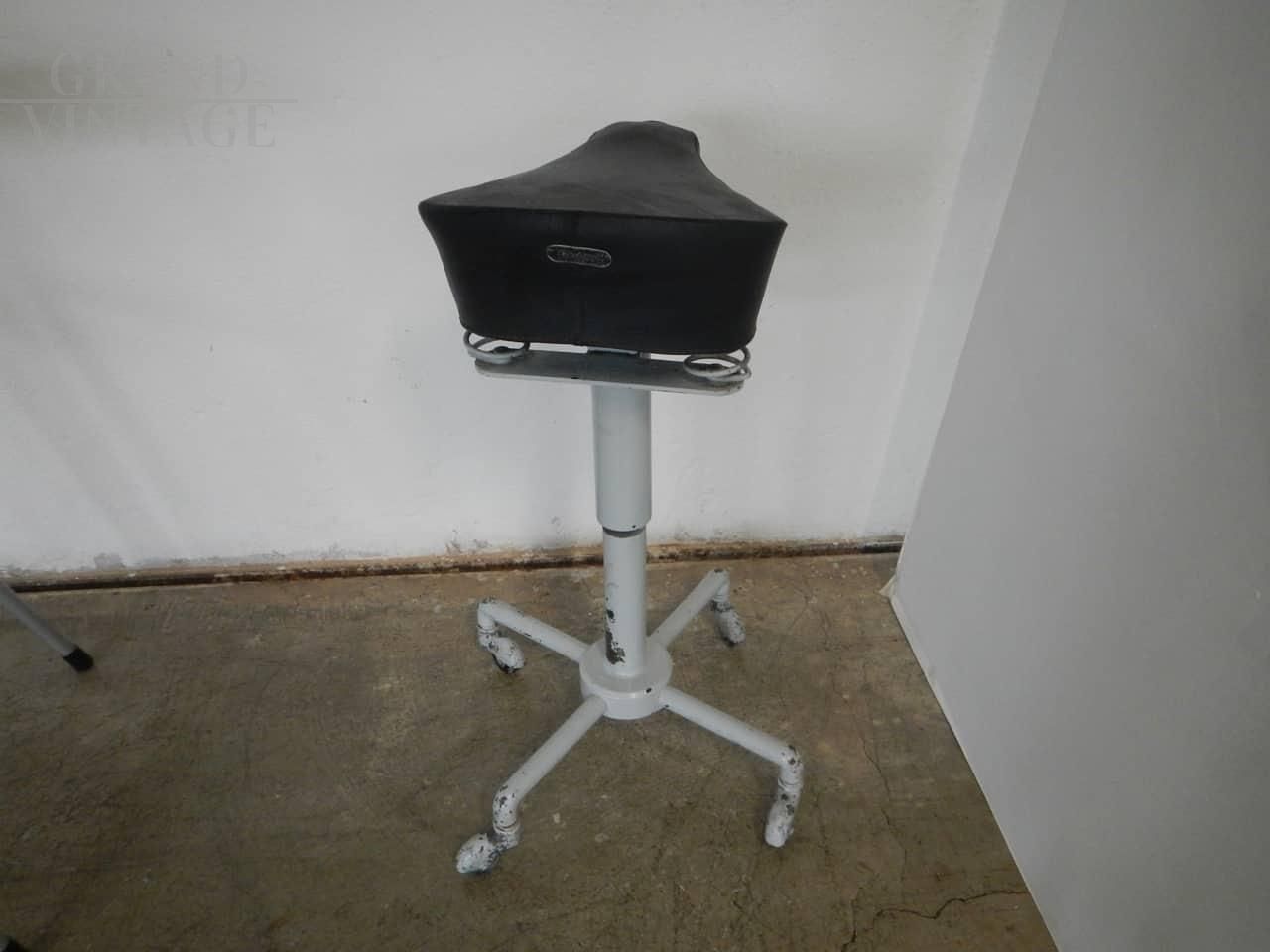 Sgabello con 4 ruote e altezza regolabile, con seduta sella Giuliari, assemblaggio originale, funzionante.