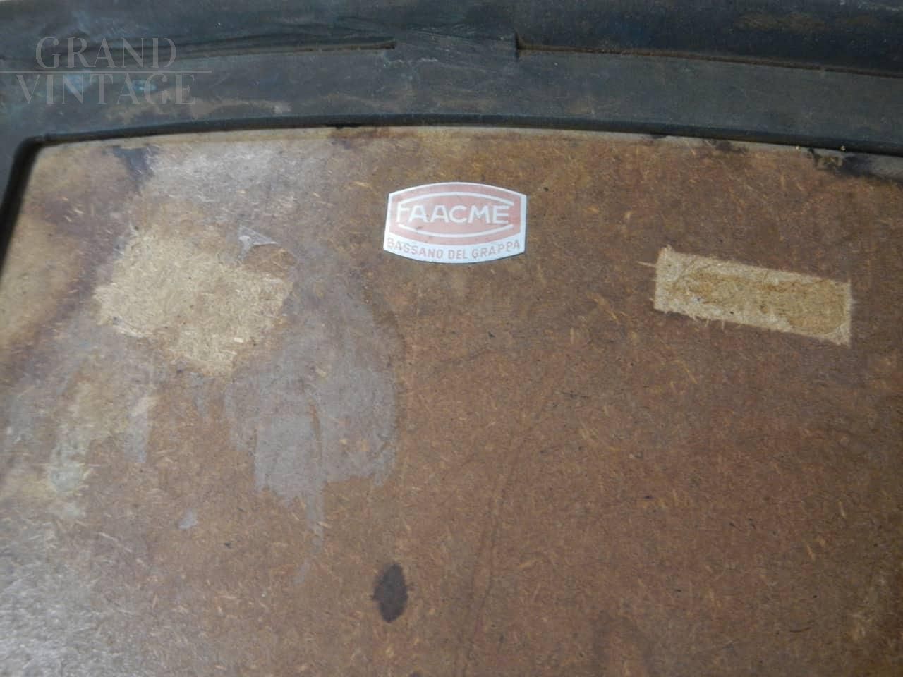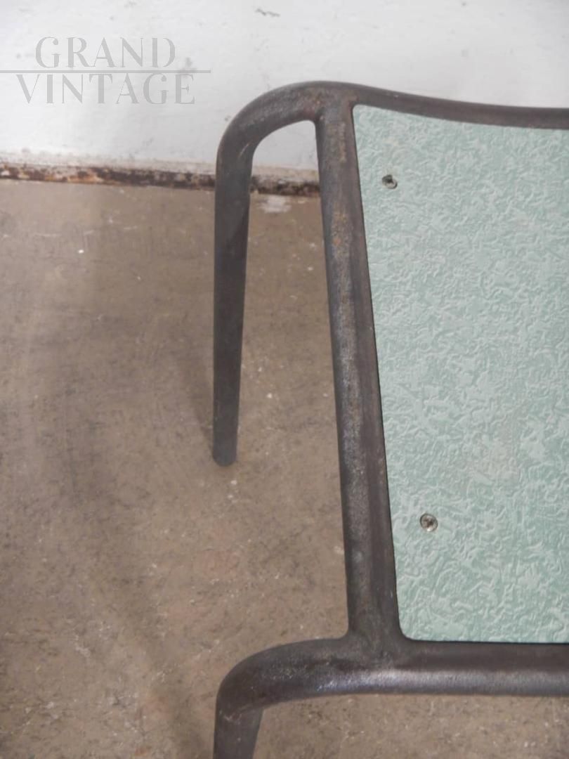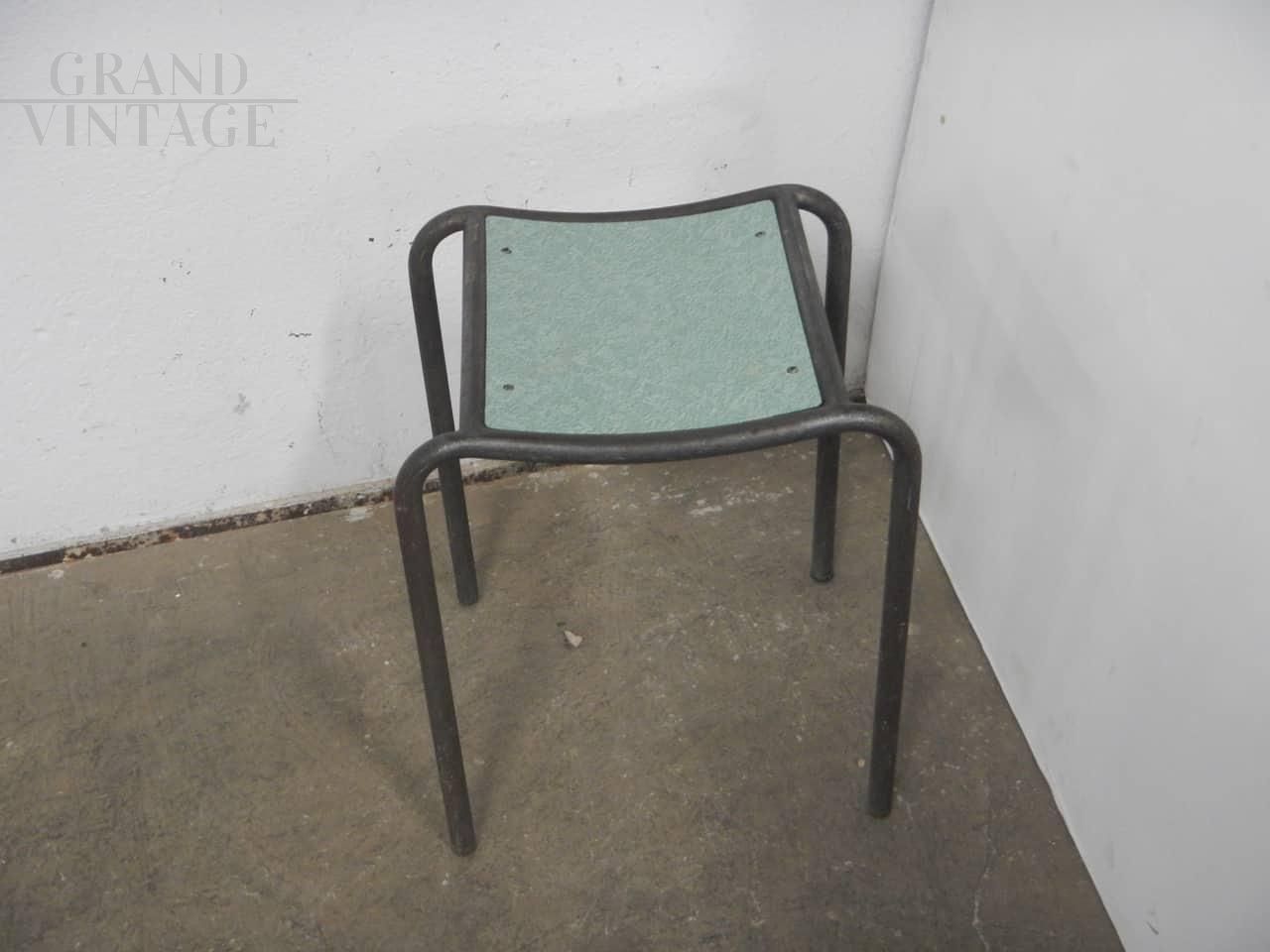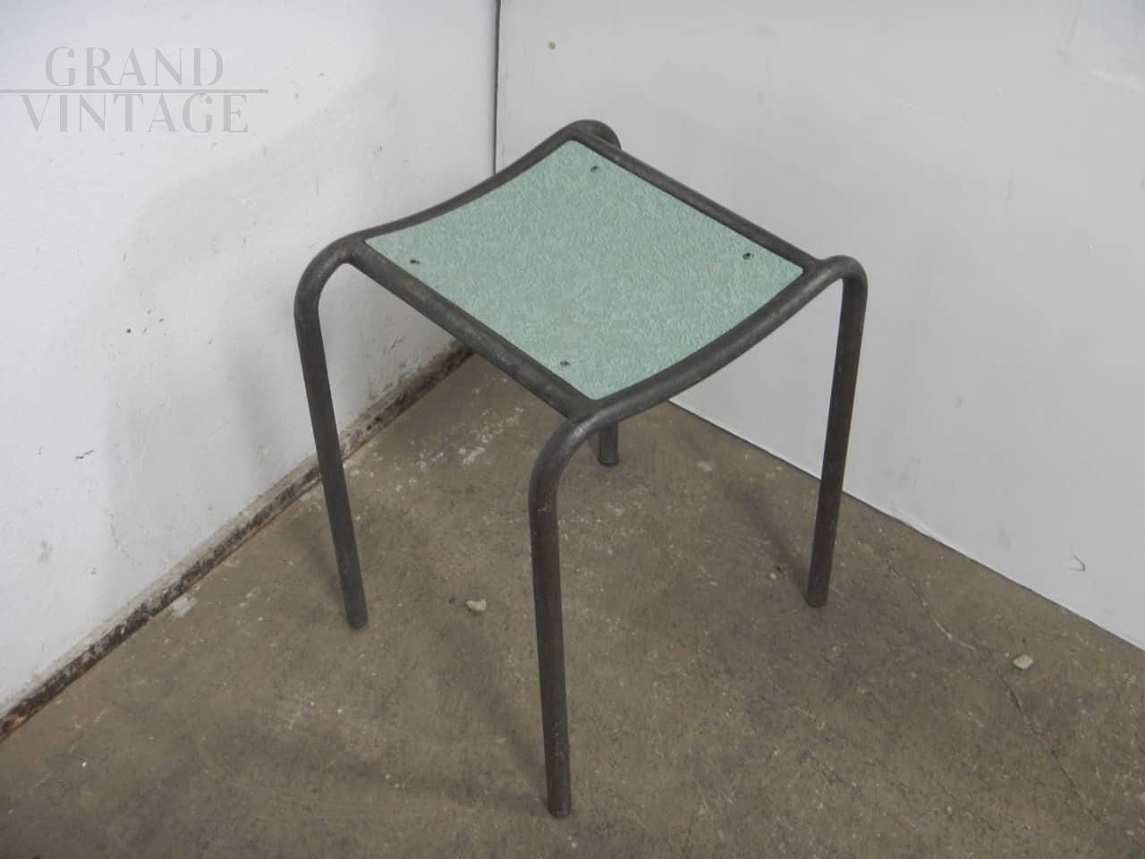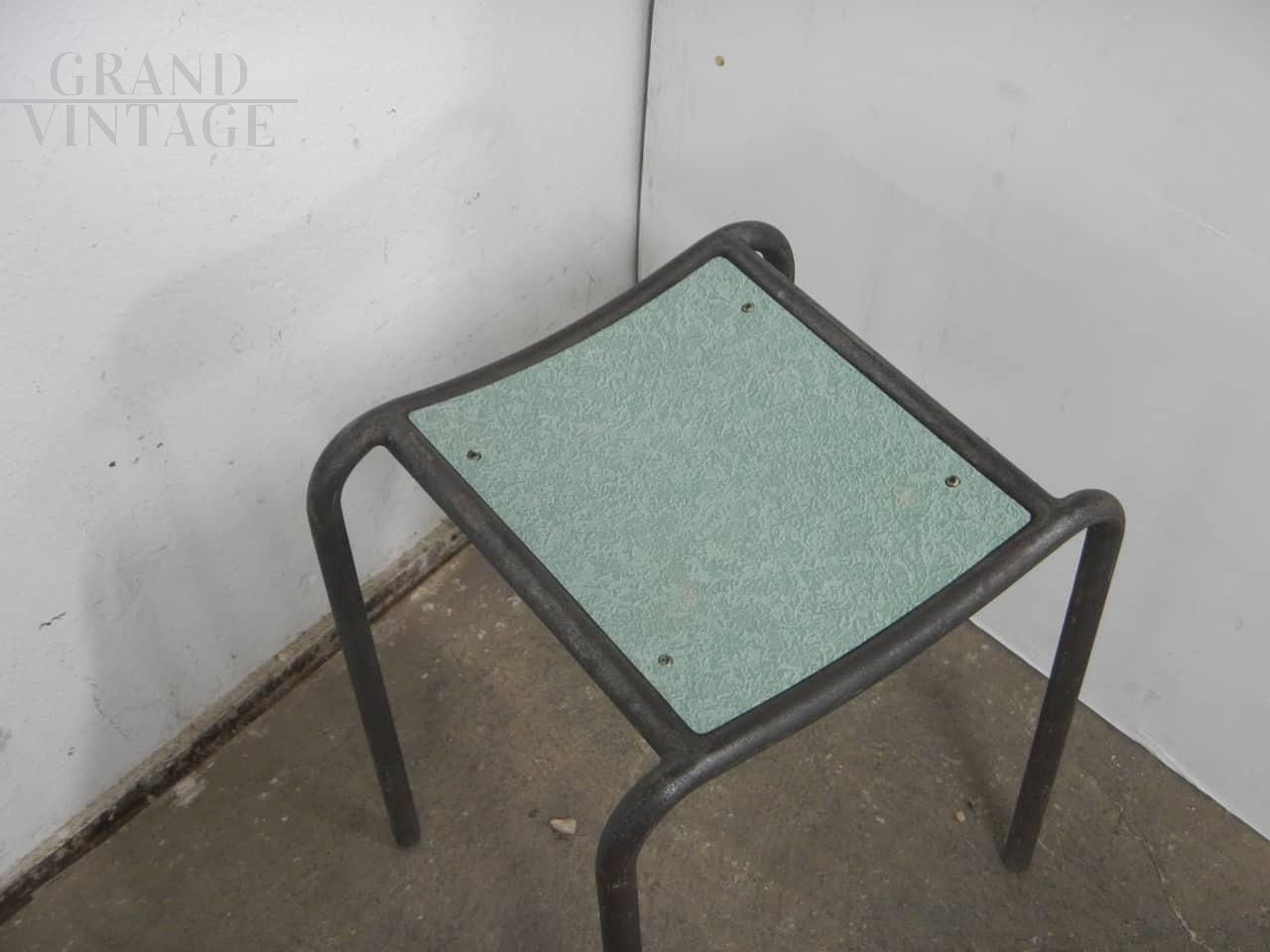 Sgabello vintage fisso in tubolare di ferro con seduta in formica verde, prodotto da FAACME Italia negli anni '60. La seduta misura cm 29 x 33. In buone condizioni, pulito e trattato con vernice da ferro.