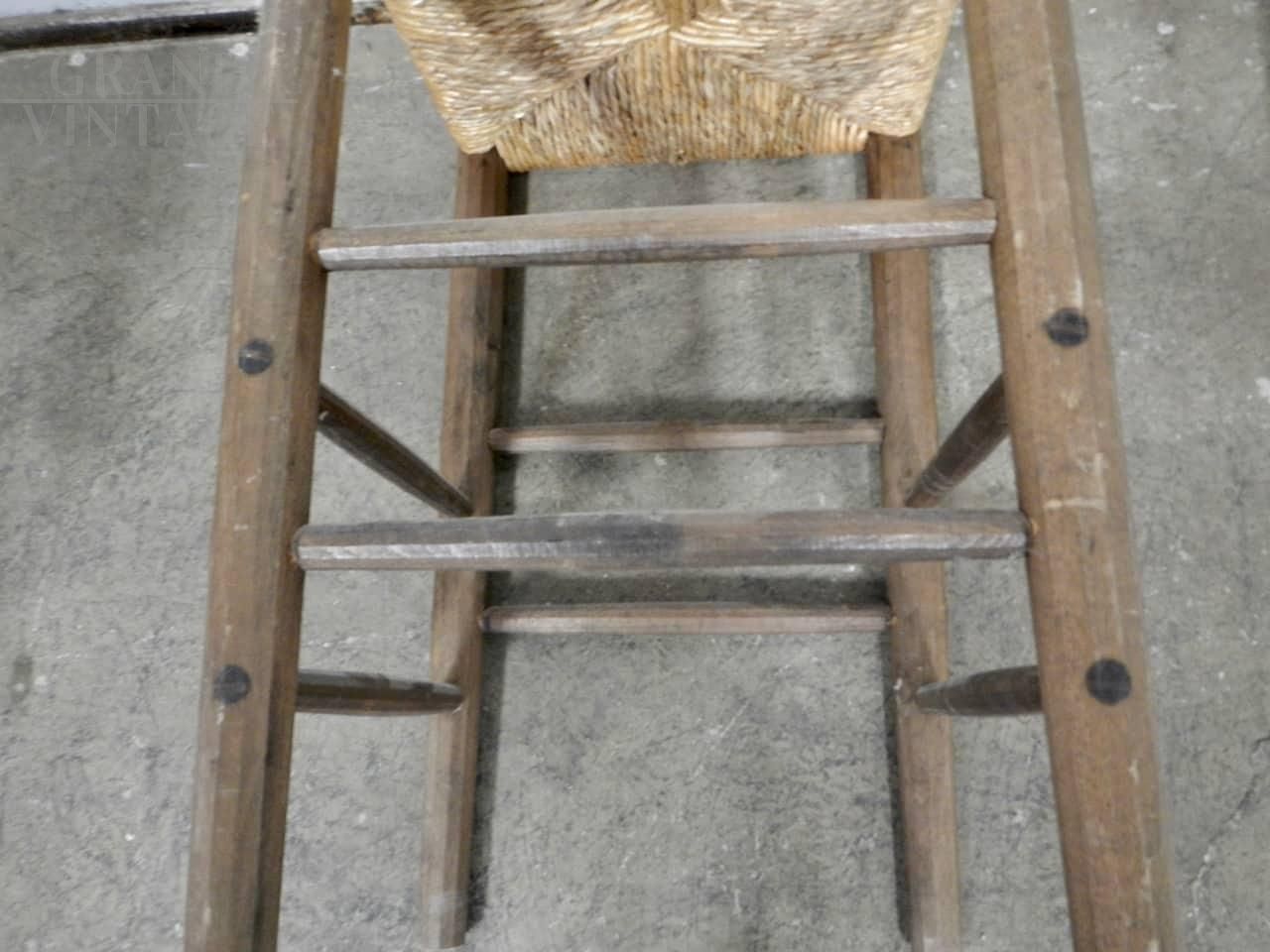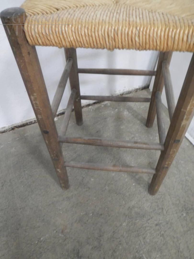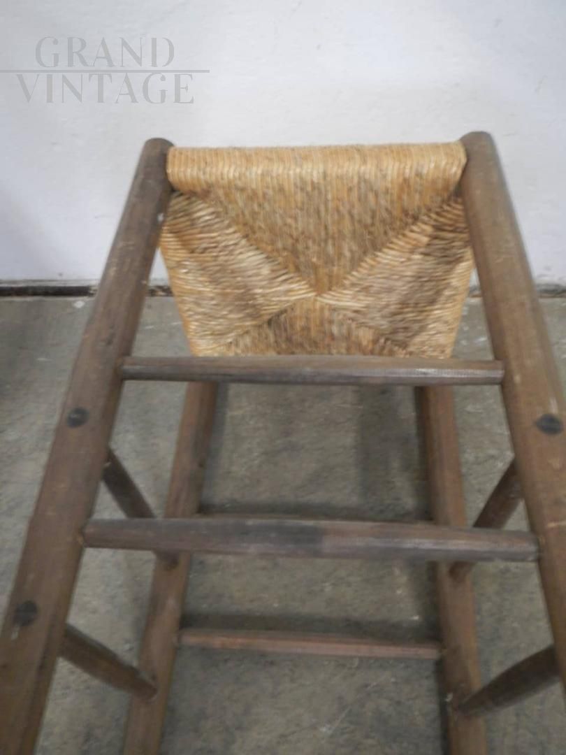 Sgabello vintage in legno di tiglio con seduta in paglia intrecciata, in buone condizioni, pulito e cerato.