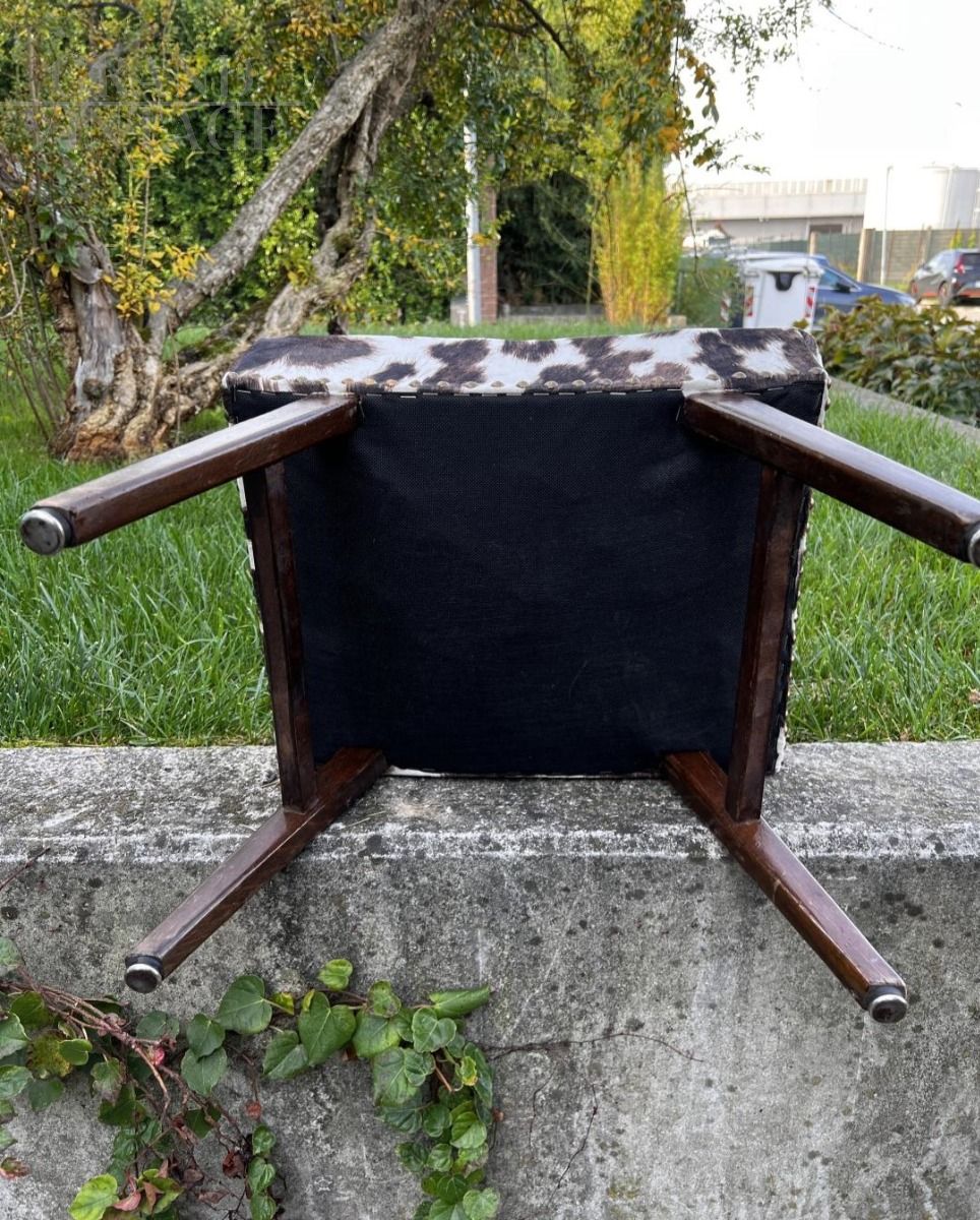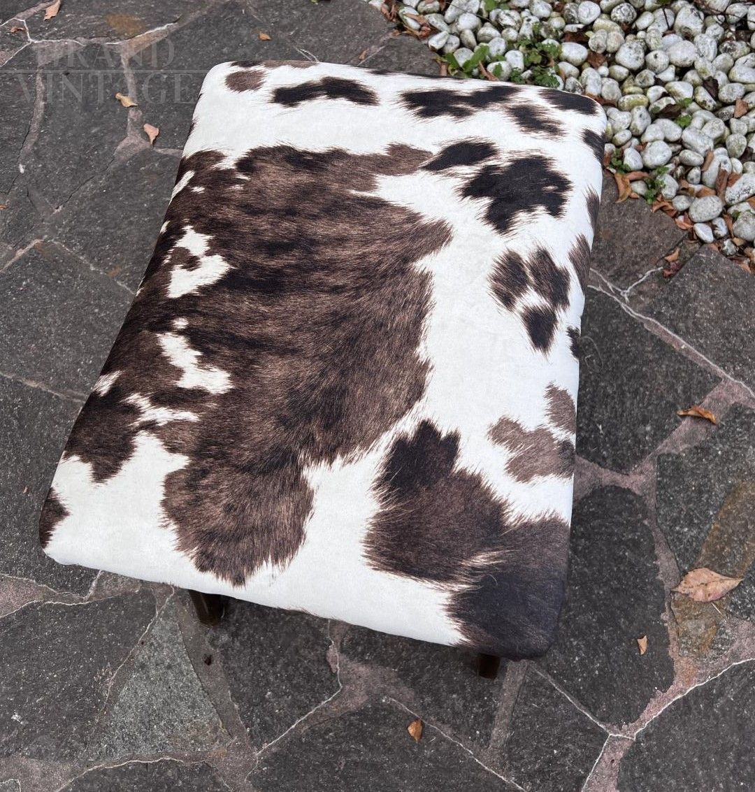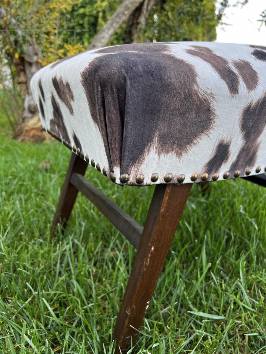 Sgabello vintage in legno con rivestimento in tessuto vellutino maculato animalier con profilo borchiato, perfettamente rivestito.
