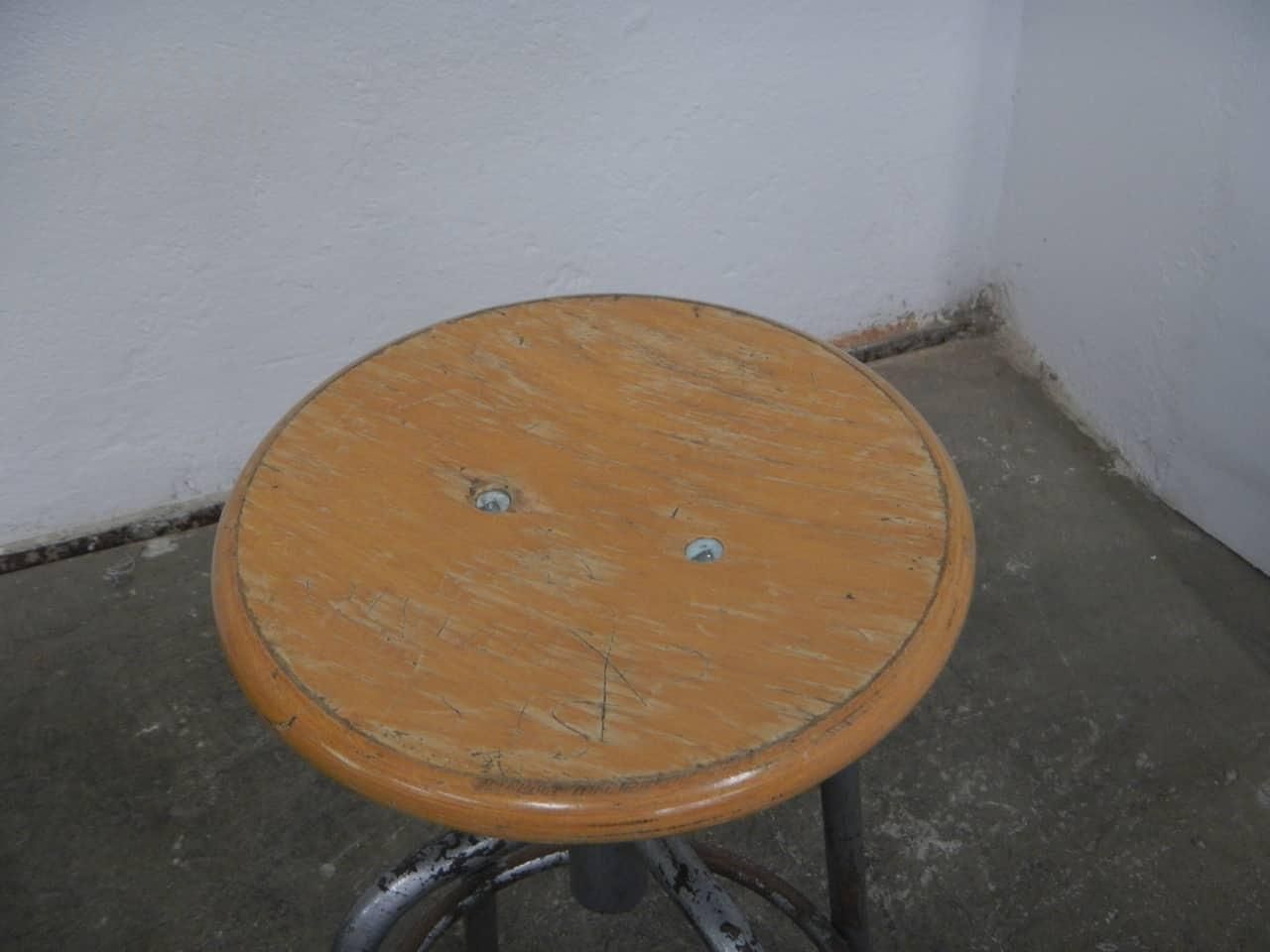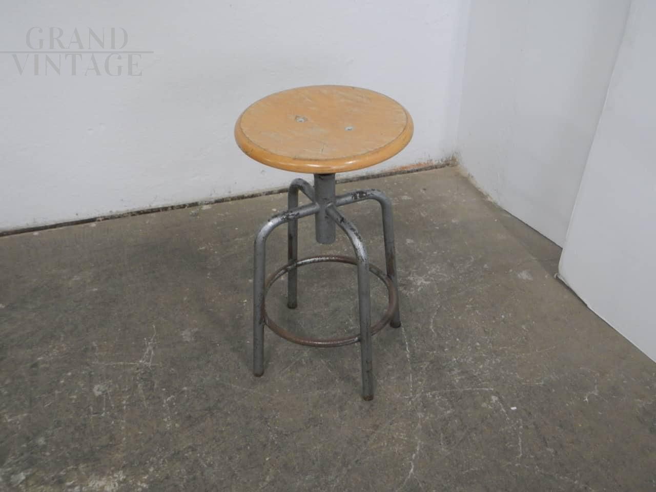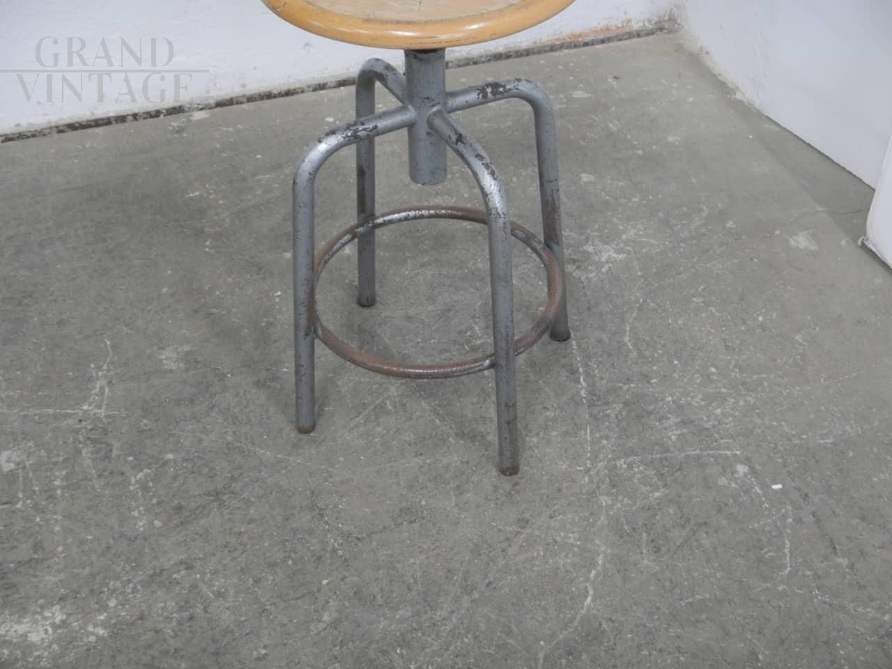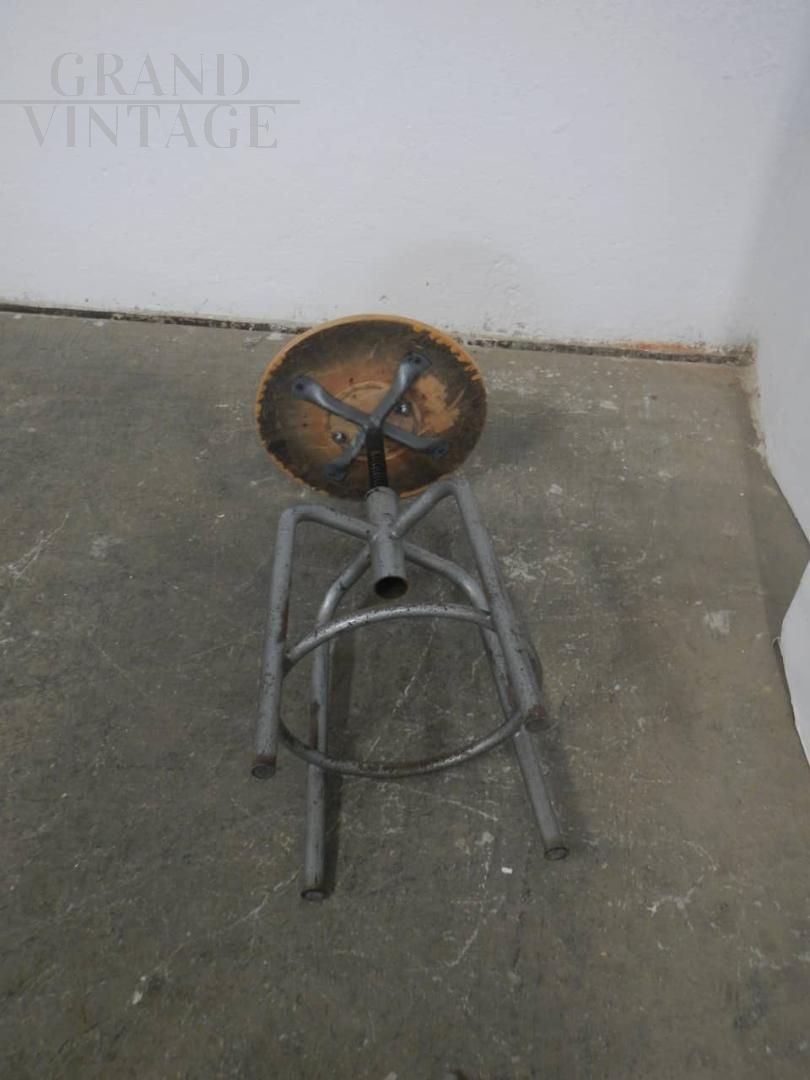 Sgabello vintage industriale girevole e regolabile con 4 piedi, la struttura è in ferro grigio e la seduta rotonda è in legno di faggio. Regolabile in altezza da 56 a 63 cm, presenta i naturali segni del tempo. La vite senza fine di regolazione altezza è usurata, questo comporta una lieve oscillazione della seduta.